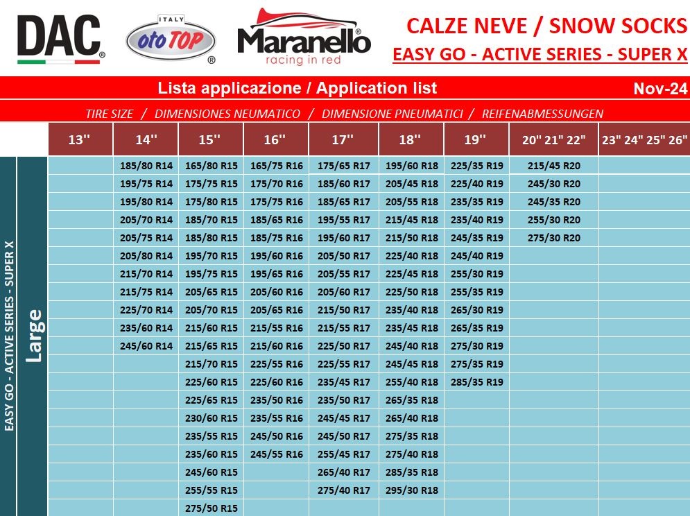 Maranello Super X, lanturi auto textile premium, huse antiderapante pentru iarna Maranello Super X este cea mai noua generatie de huse antiderapante textile, acum cu omologare europeana EN 16662-1 , standard care unifica si echivaleaza legal husele textile cu lanturile de zapada. Acest lucru garanteaza siguranta, performanta si conformitate in toate tarile Uniunii Europene. Performanta si rezistenta superioara Structura inovatoare din tesatura 3D de inalta densitate asigura tractiune si aderenta exceptionala pe zapada si gheata. Comparativ cu seria Active, Maranello Super X ofera +50% rezistenta si +50% durabilitate fata de generatia DAC ACTIVE SERIES , fiind concepute pentru drumuri dificile de iarna. Montaj rapid si usor Se monteaza in doar 2 minute , mult mai rapid decat lanturile metalice. Structura cu auto-centrare fixeaza singura husa pe anvelopa dupa montaj. Se instaleaza pe rotile cu tractiune ale vehiculului. Confort si compatibilitate extinsa Maranello Super X este solutia ideala inclusiv pentru vehiculele ne-lantabile (care nu dispun de spatiu intre roata si amortizor pentru lanturi metalice). Nu deterioreaza cauciucurile sau jantele. Nu produc vibratii sau zgomote la rulare. Recomandare de viteza: maxim 30 km/h pe zapada sau gheata. Pot fi spalate manual la max. 30° si reutilizate. Design compact, usor de depozitat in husa impermeabila inclusa. Acoperire extinsa pentru parcul auto Maranello Super X este disponibil in 6 dimensiuni , compatibile cu 95% din autoturismele aflate in circulatie . LISTA COMPATIBILITATE DIMENSIUNI DE ANVELOPE/CAUCIUCURI (Consultati inainte de a achizitiona produsul) Lanturile se potrivesc pentru urmatoarele dimensiuni de anvelope: 13 14 15 16 17 18 19 20 21 22 23 24 25 26 Large 185/80 R14 165/80 R15 165/75 R16 175/65 R17 195/60 R18 225/35 R19 215/45 R20 195/75 R14 175/75 R15 175/70 R16 185/60 R17 205/45 R18 225/40 R19 245/30 R20 195/80 R14 175/80 R15 175/75 R16 185/65 R17 205/55 R18 235/35 R19 245/35 R20 205/70 R14 185/70 R15 185/65 R16 195/55 R17 215/45 R18 235/40 R19 255/30 R20 205/75 R14 185/80 R15 185/75 R16 195/60 R17 215/50 R18 245/35 R19 275/30 R20 205/80 R14 195/70 R15 195/60 R16 205/50 R17 225/40 R18 245/40 R19 215/70 R14 195/75 R15 195/65 R16 205/55 R17 225/45 R18 255/30 R19 215/75 R14 205/65 R15 205/60 R16 205/60 R17 225/50 R18 255/35 R19 225/70 R14 205/70 R15 205/65 R16 215/50 R17 235/40 R18 265/30 R19 235/60 R14 215/60 R15 215/55 R16 215/55 R17 235/45 R18 265/35 R19 245/60 R14 215/65 R15 215/60 R16 225/50 R17 245/40 R18 275/30 R19 215/70 R15 225/55 R16 225/55 R17 245/45 R18 275/35 R19 225/60 R15 225/60 R16 235/45 R17 255/40 R18 285/35 R19 225/65 R15 235/50 R16 235/50 R17 265/35 R18 230/60 R15 235/55 R16 245/45 R17 265/40 R18 235/55 R15 245/50 R16 245/50 R17 275/35 R18 235/60 R15 245/55 R16 255/45 R17 275/40 R18 245/60 R15 265/40 R17 285/35 R18 255/55 R15 275/40 R17 295/30 R18 275/50 R15 Omologarea EN 16662-1:2020 reprezintă o standardizare europeană pentru echipamentele antiderapante utilizate pe drumurile acoperite cu zăpadă sau gheață, cum ar fi lanțurile textile, lanțurile metalice sau alte dispozitive similare. Aceasta garantează că produsele respectă cerințele tehnice și de siguranță stabilite de Uniunea Europeană. Iată ce implică această omologare: 1. Siguranță și Performanță Standardul verifică eficiența produselor în condiții reale de utilizare, asigurând că acestea oferă aderența necesară pe suprafețe alunecoase fără a compromite siguranța șoferului sau a vehiculului. 2. Compatibilitate cu Vehiculul EN 16662-1:2020 include cerințe privind modul în care dispozitivele antiderapante interacționează cu roțile vehiculului. Se verifică dacă: Nu afectează sistemele de frânare (ex. ABS, ESP). Nu deteriorează anvelopele sau jantele. 3. Calitate Materiale Materialele utilizate trebuie să fie rezistente la uzură, să nu deterioreze suprafețele carosabile și să fie sigure pentru utilizator. 4. Ușurință în Instalare și Demontare Standardul specifică și că echipamentele trebuie să fie ușor de montat și demontat, chiar și în condiții dificile (frig, zăpadă, gheață). 5. Conformitate Legală în Europa Dispozitivele care au omologarea EN 16662-1:2020 sunt acceptate legal în toate țările din Uniunea Europeană, inclusiv în zonele unde utilizarea echipamentelor antiderapante este obligatorie în sezonul de iarnă. Pentru produsele omologate conform acestui standard, clienții pot fi siguri că achiziționează un produs de înaltă calitate, potrivit cerințelor europene de siguranță și eficiență.