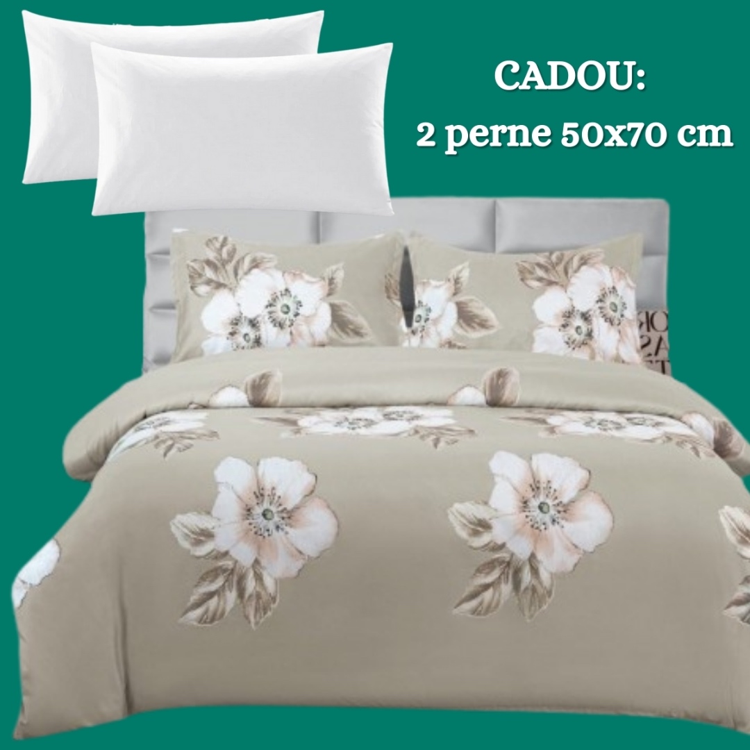 Lenjerie de Pat 4 Piese din Bumbac Satinat cu Cearsaf cu Elastic + 2 Perne Cadou 50x70 cm, cod INS-LSG155