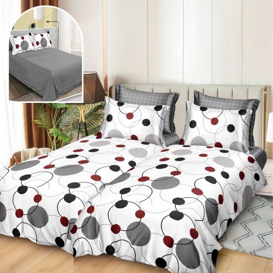 Lenjerie de Pat, 7 Piese, Bumbac Satinat Superior, cu 2 Pilote, Alb, Gri, Buline