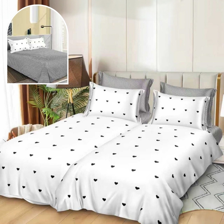 Lenjerie de Pat, 7 Piese, Bumbac Satinat Superior, cu 2 Pilote, Alb, Inimioare