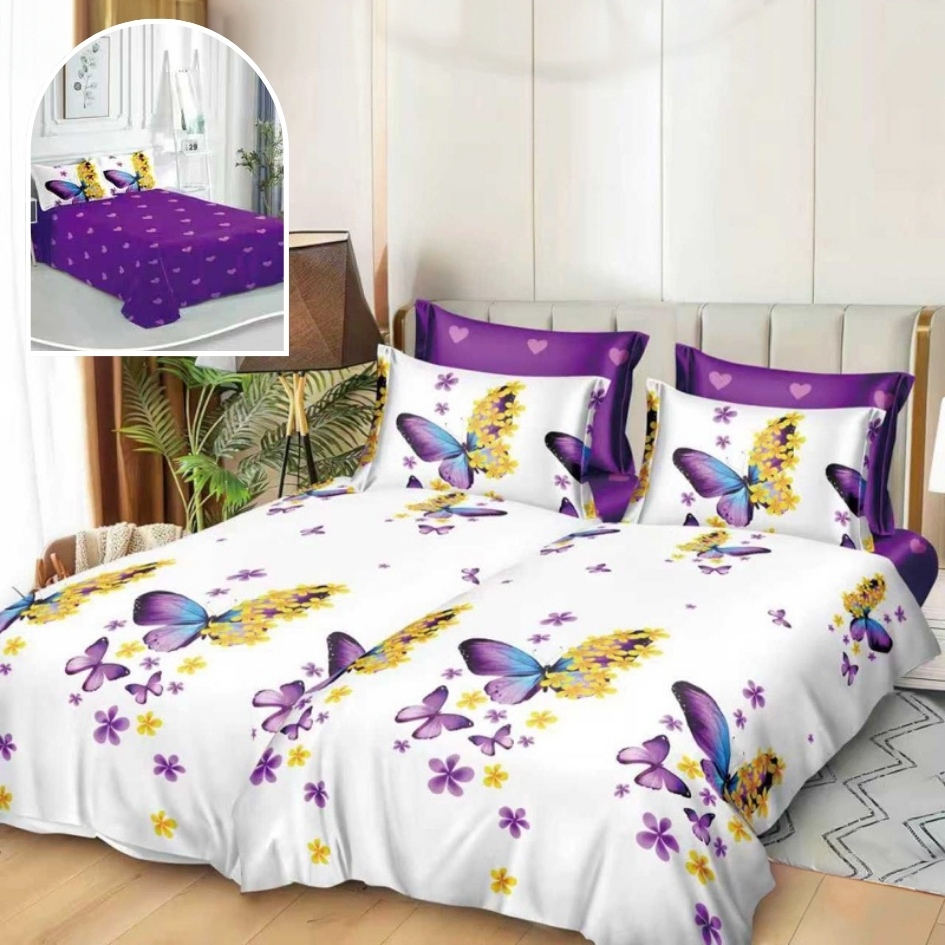 Lenjerie de Pat, 7 Piese, Bumbac Satinat Superior, cu 2 Pilote, Alb, Mov, Fluturi
