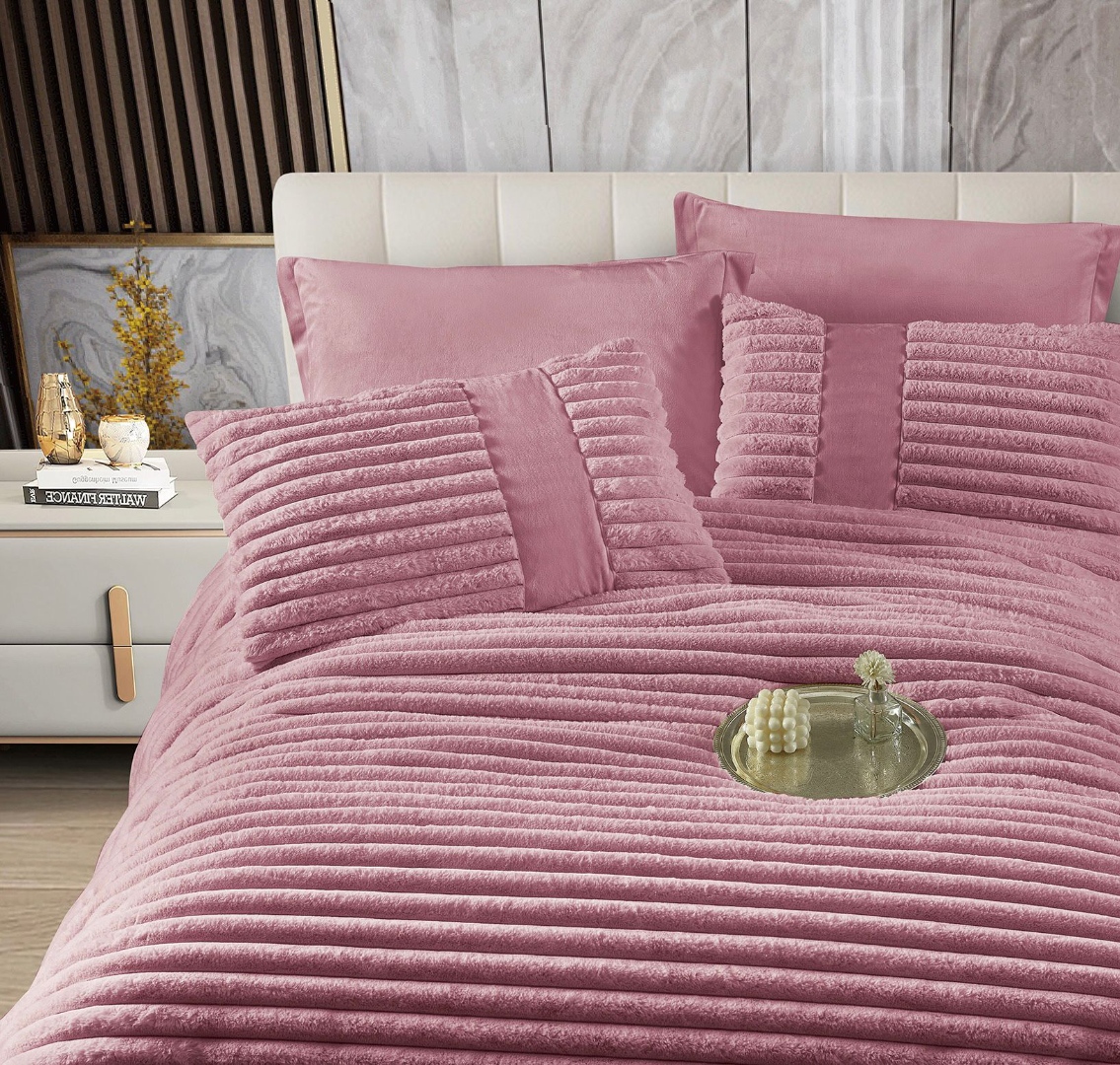Lenjerie de pat cu Pilota Inclusa, Jojo Home, Cearceaf cu Elastic, 6 Piese, Blana de Iepure Artificiala, Roz