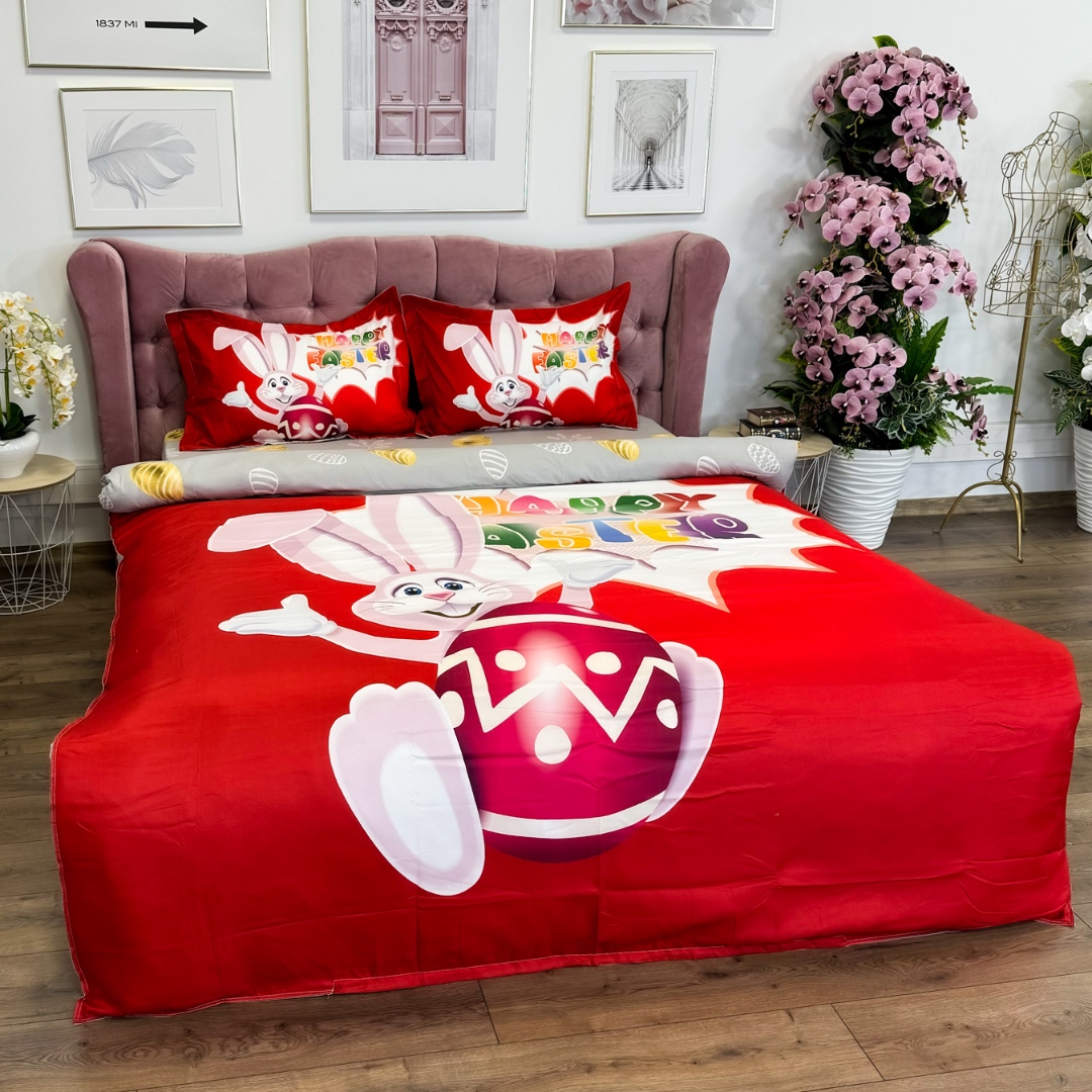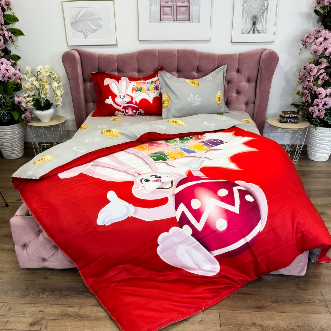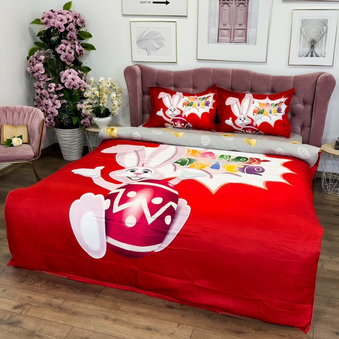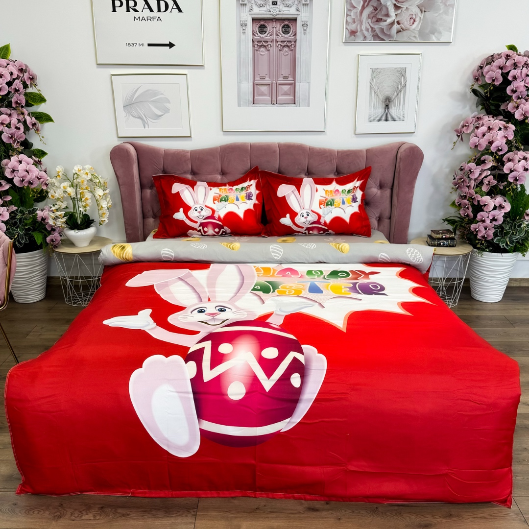 Lenjerie de Pat Dublu, Finet, Imprimeu Digital, 4 Piese, Rosu, Gri, Iepuras, Happy Easter