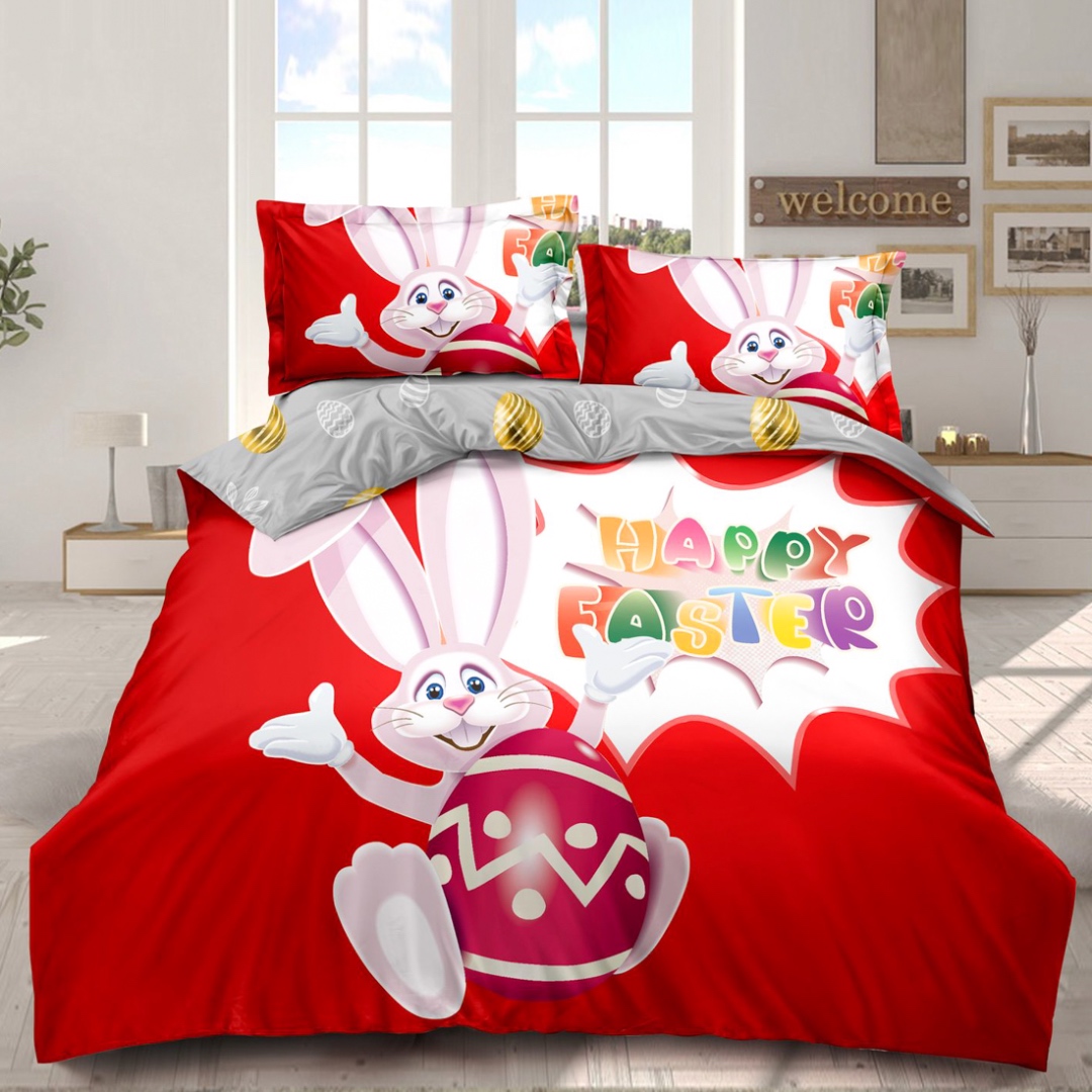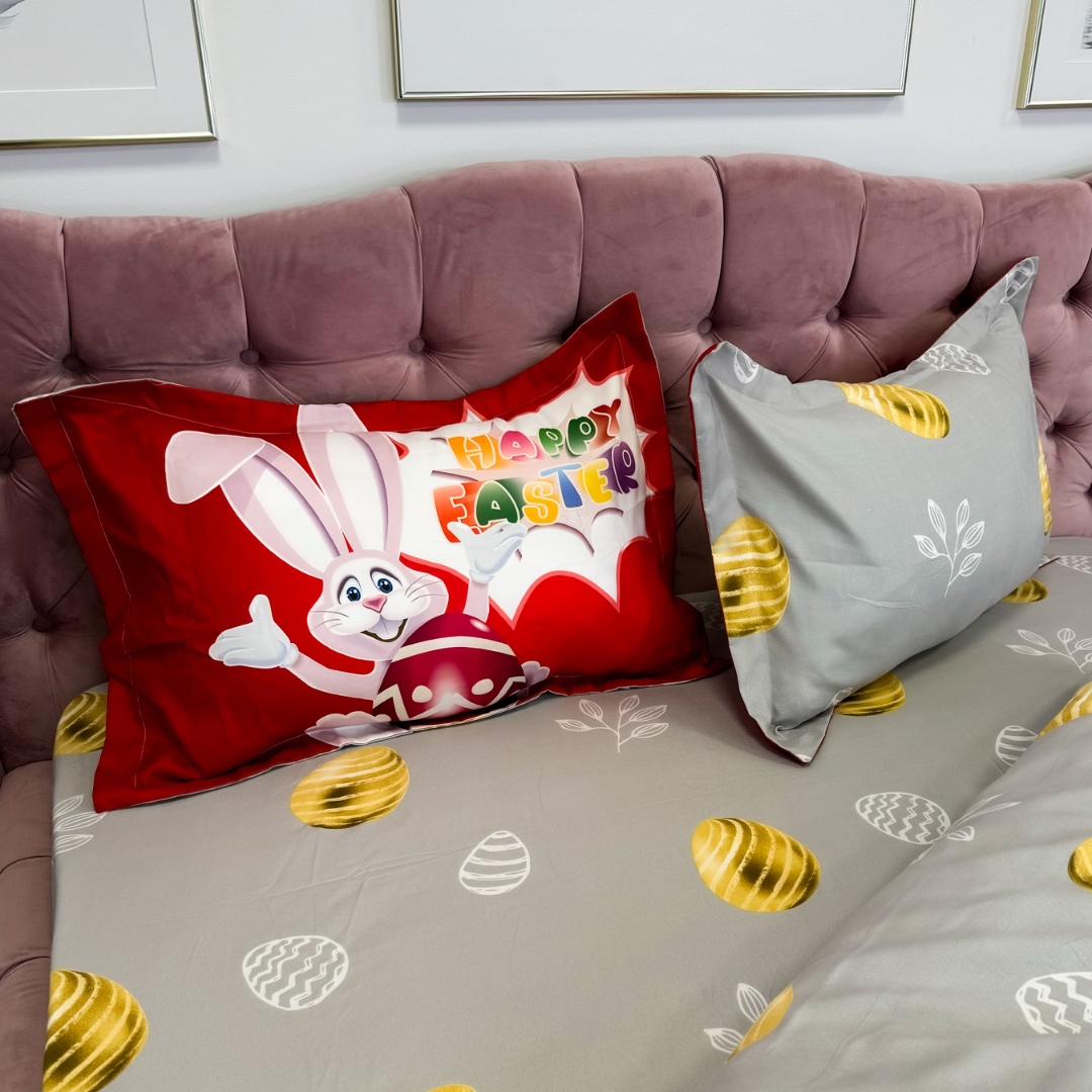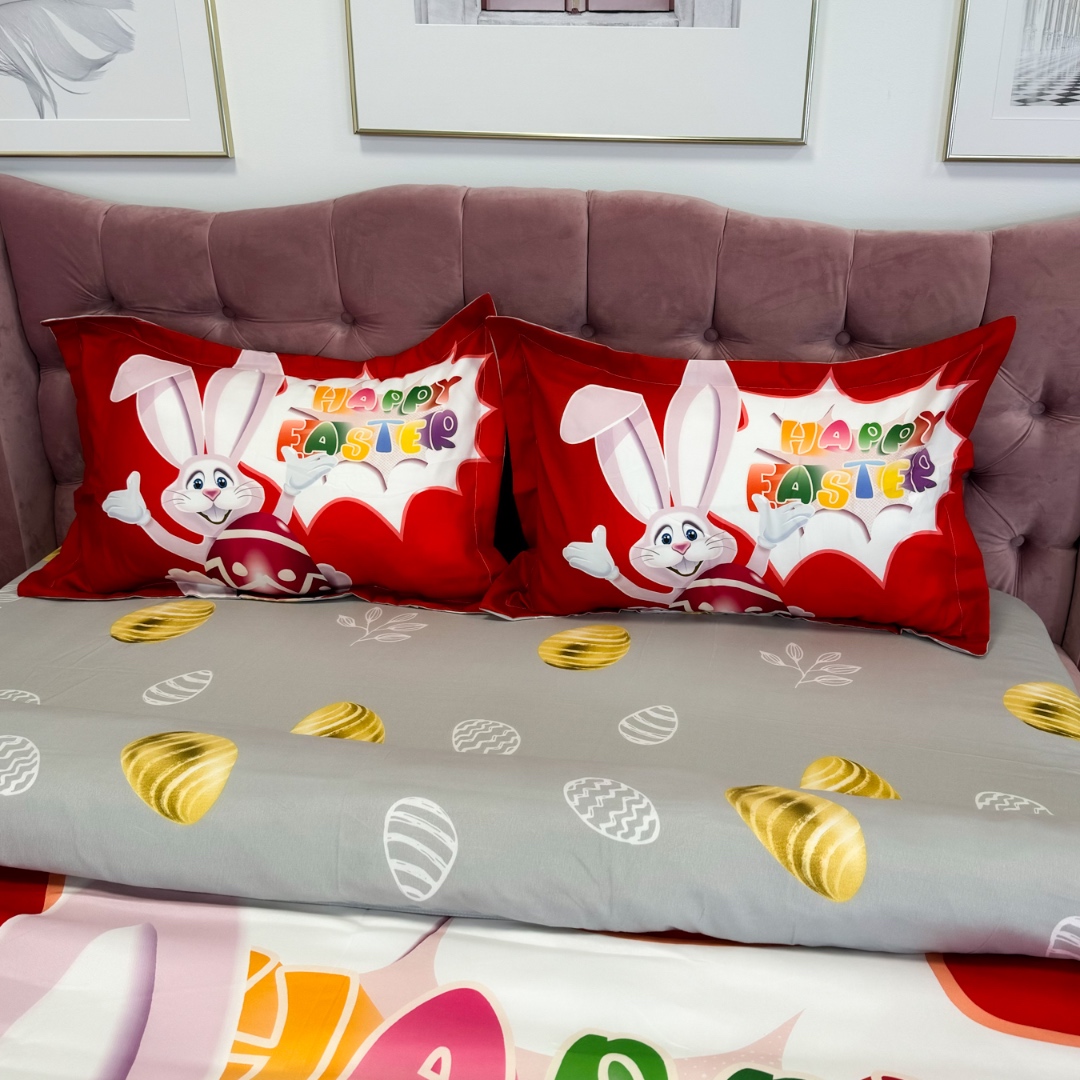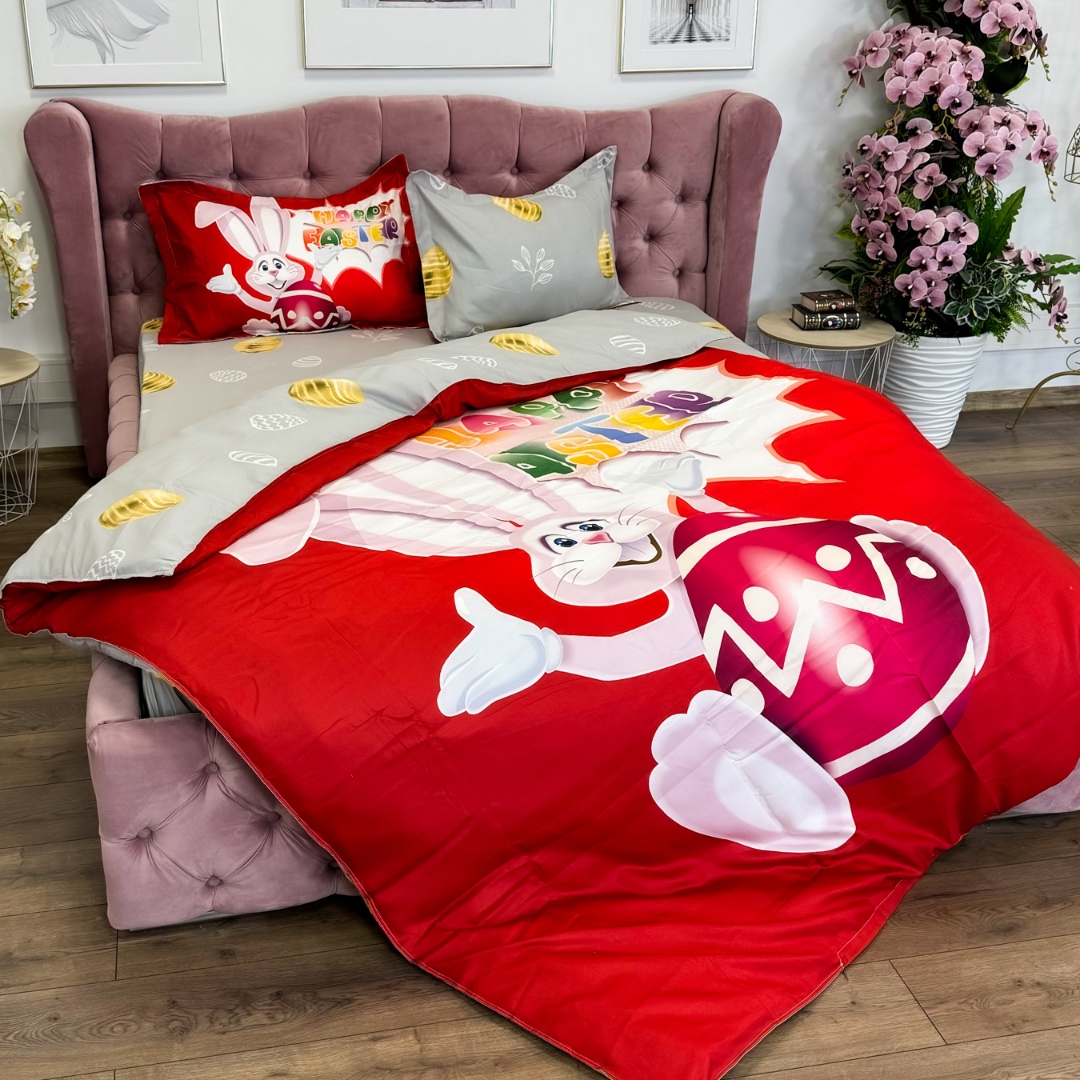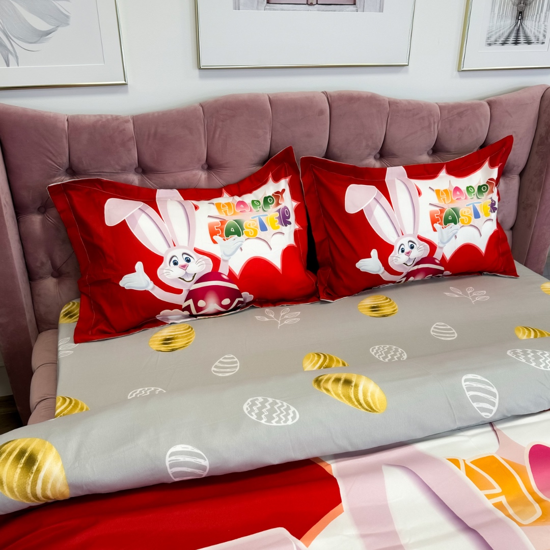 Lenjerie de Pat Dublu, Finet, Imprimeu Digital, 4 Piese, Rosu, Gri, Iepuras, Happy Easter
