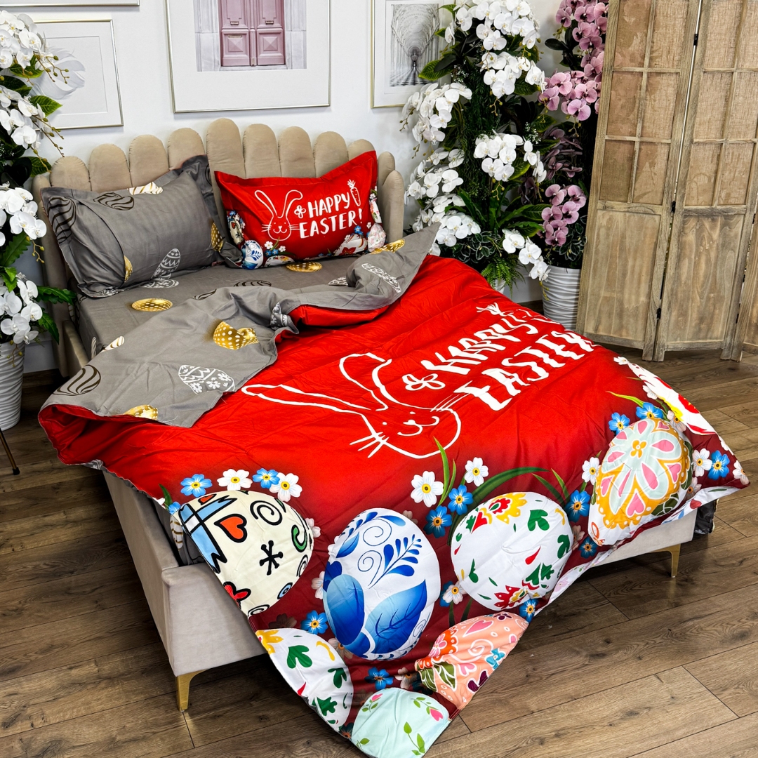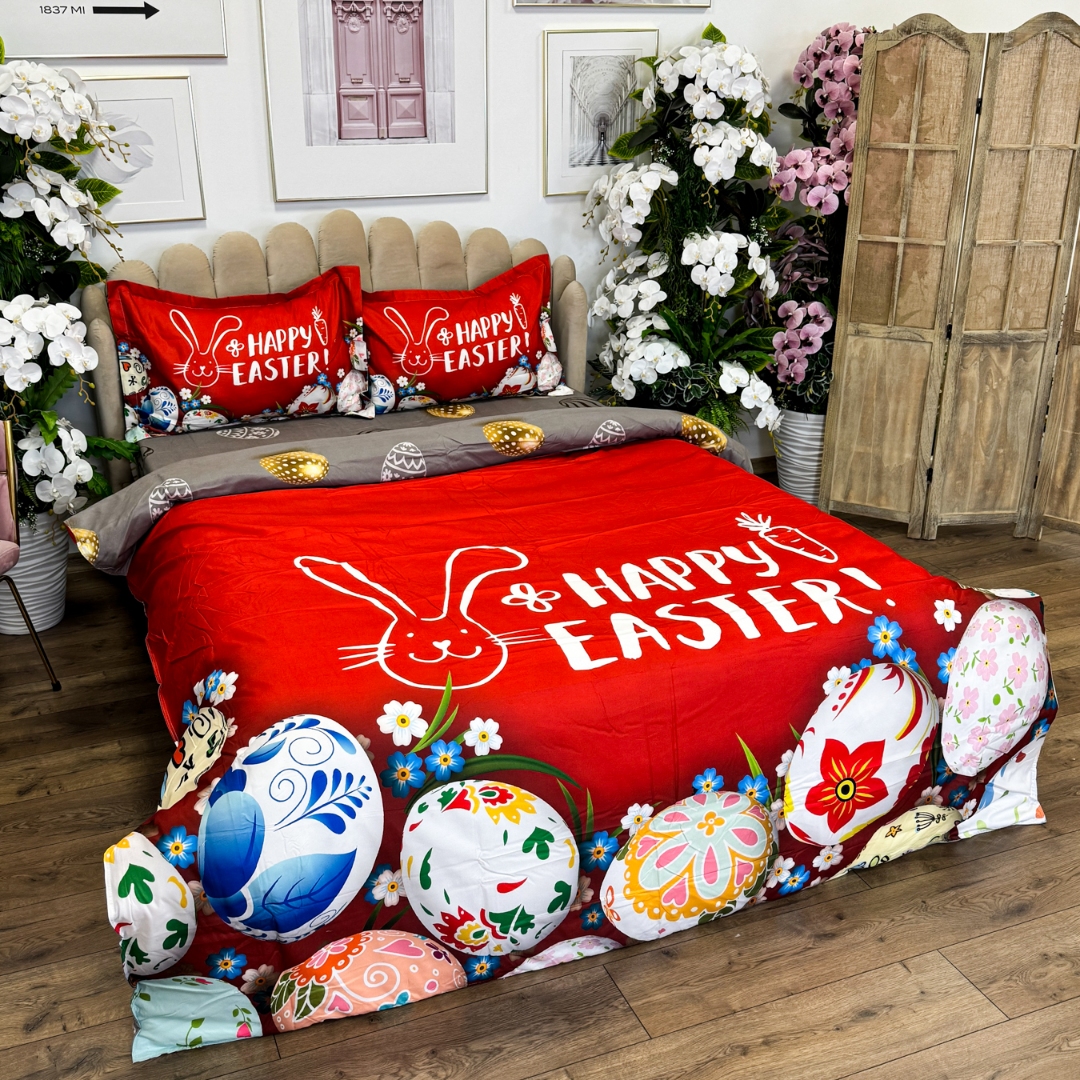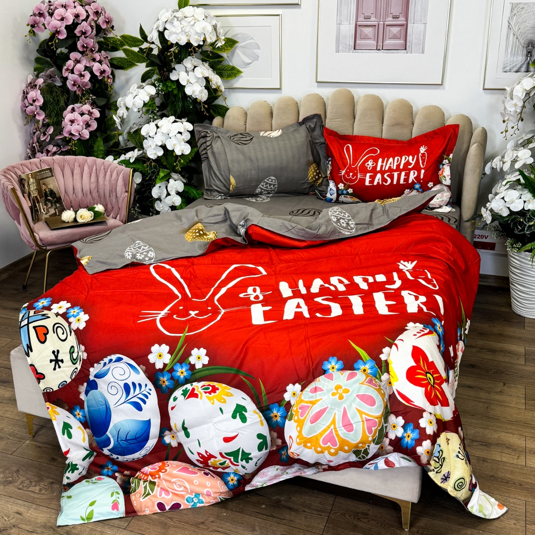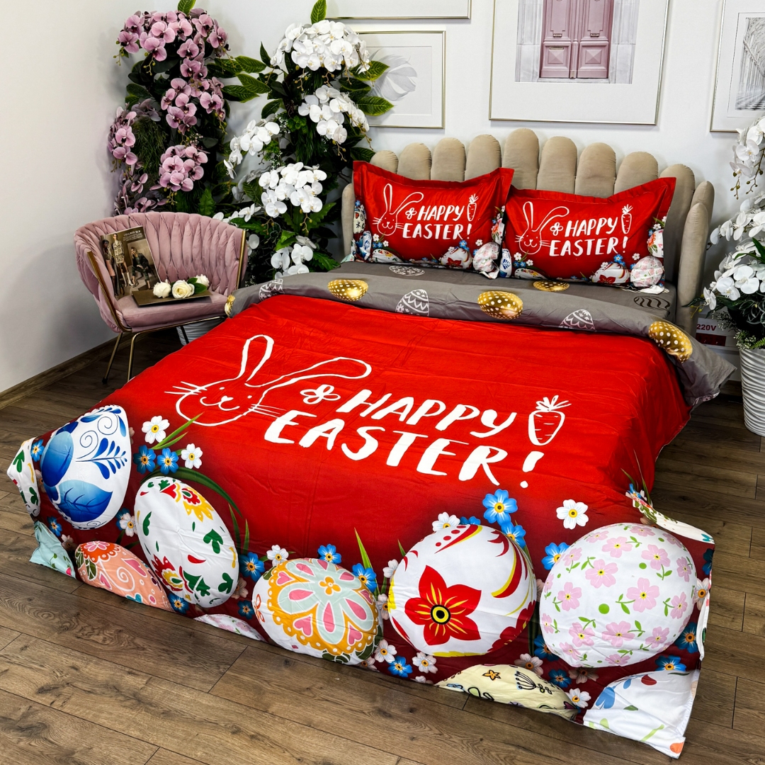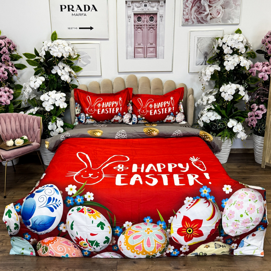 Lenjerie de Pat Dublu, Finet, Imprimeu Digital cu Oua, IDENTIC CU POZA, 4 Piese, Rosu