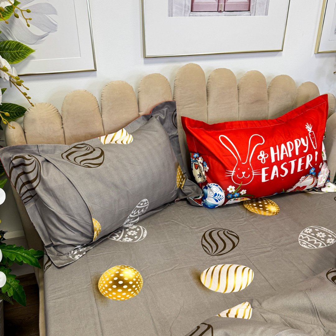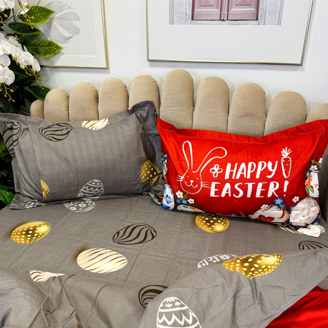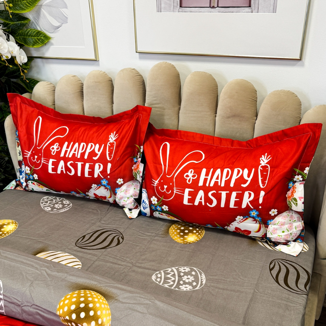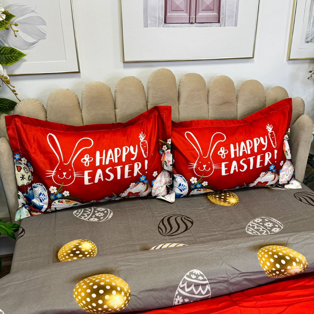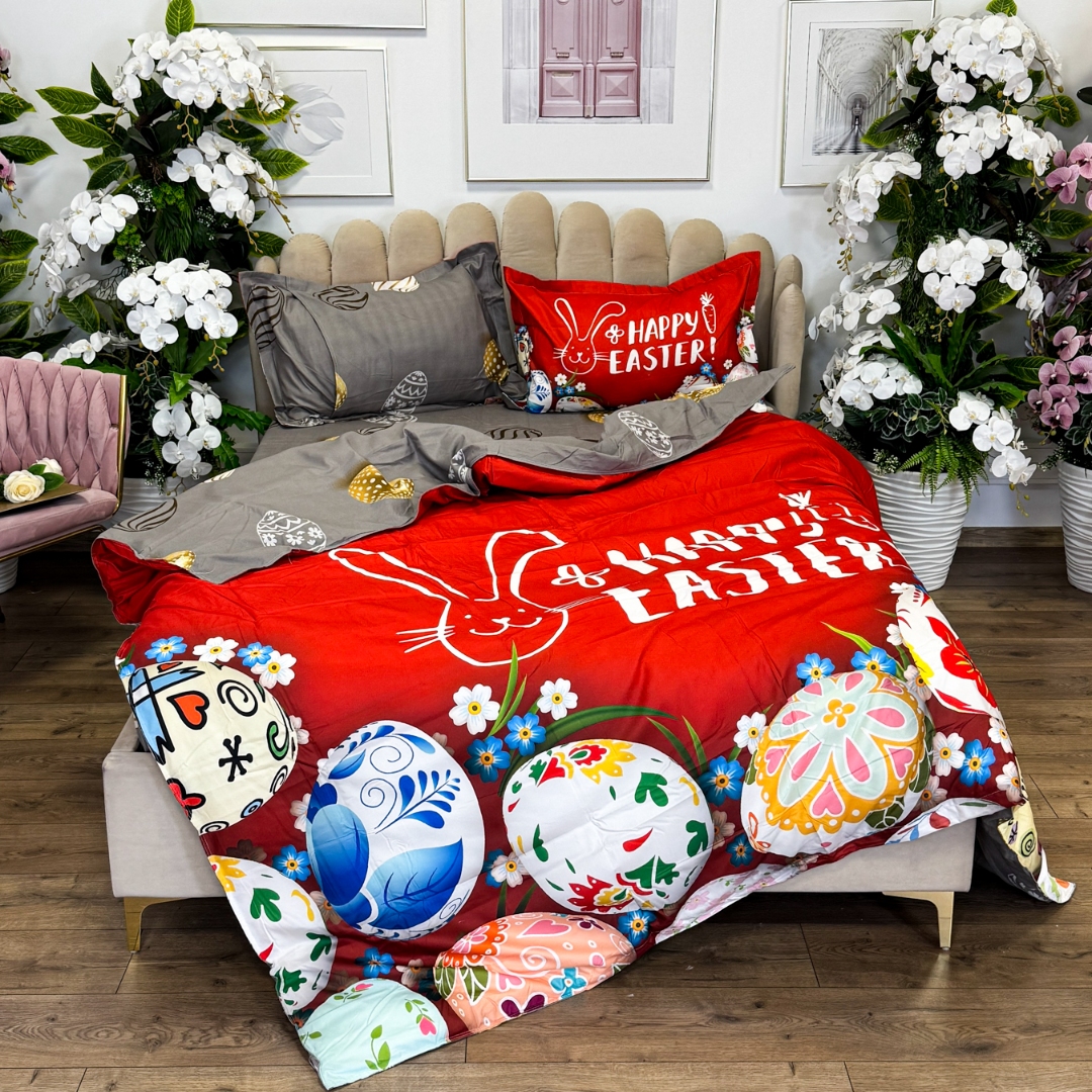 Lenjerie de Pat Dublu, Finet, Imprimeu Digital cu Oua, IDENTIC CU POZA, 4 Piese, Rosu