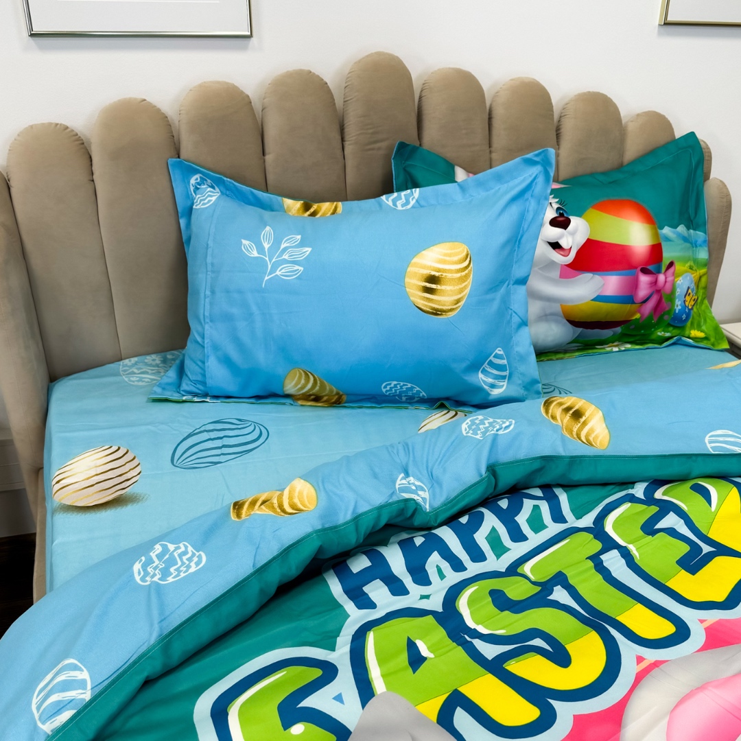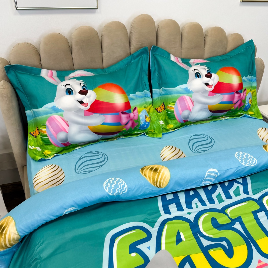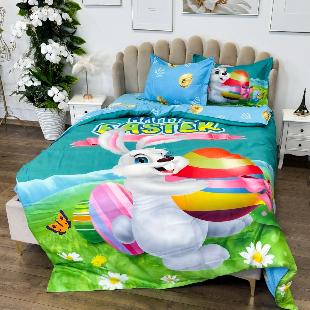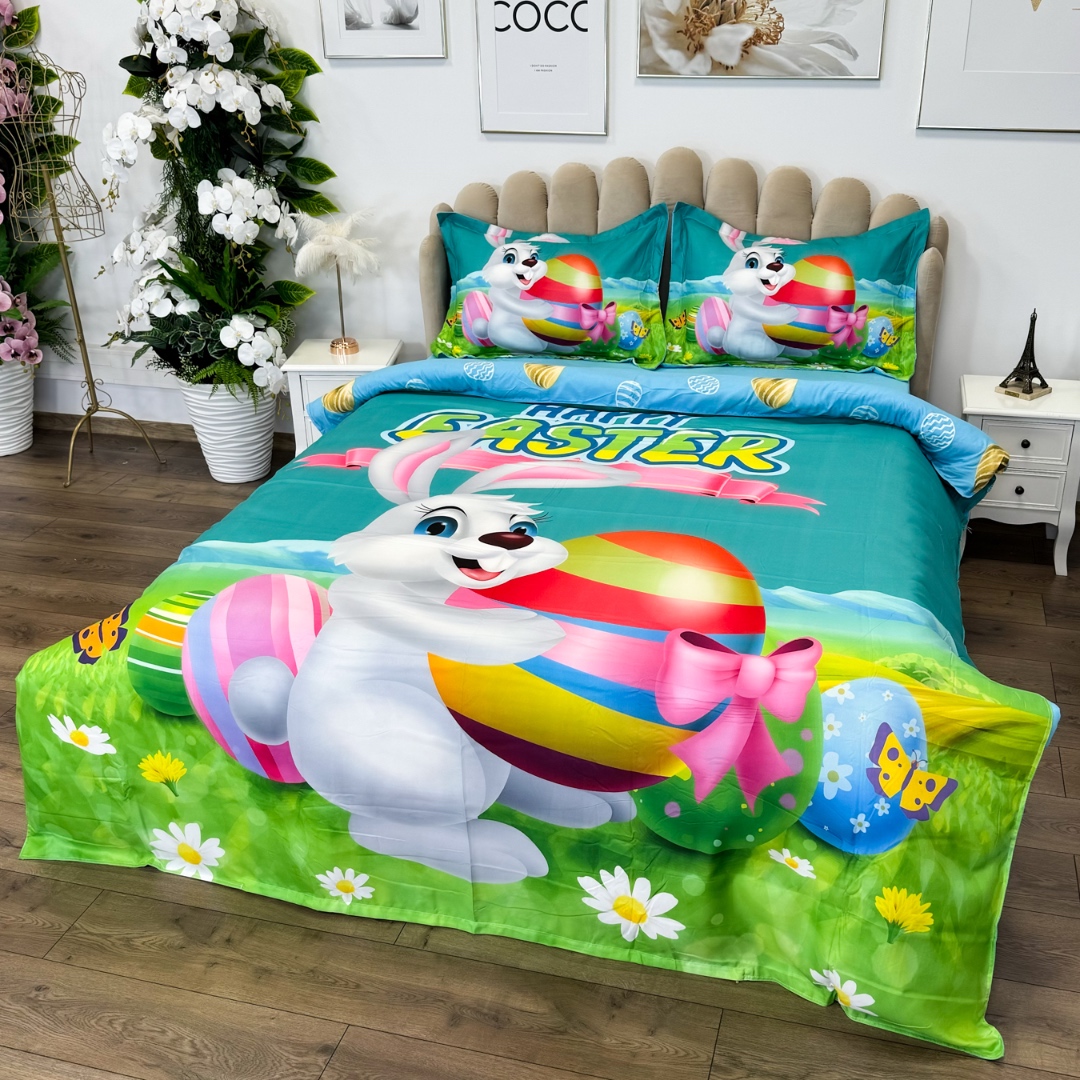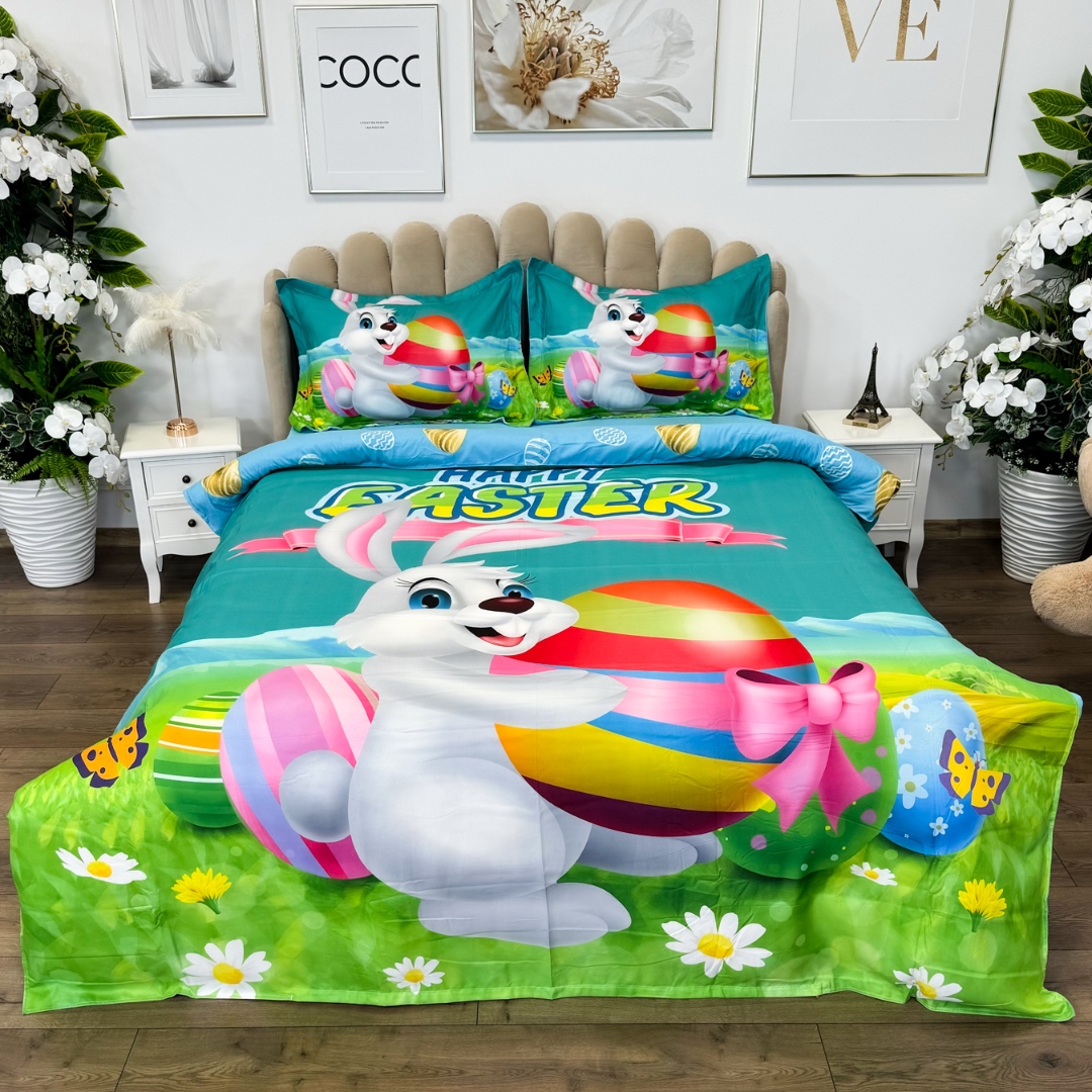Lenjerie de Pat Dublu, Finet, Imprimeu Digital, 4 Piese, Bleu, Verde, Iepuras cu Ou Incondeiat