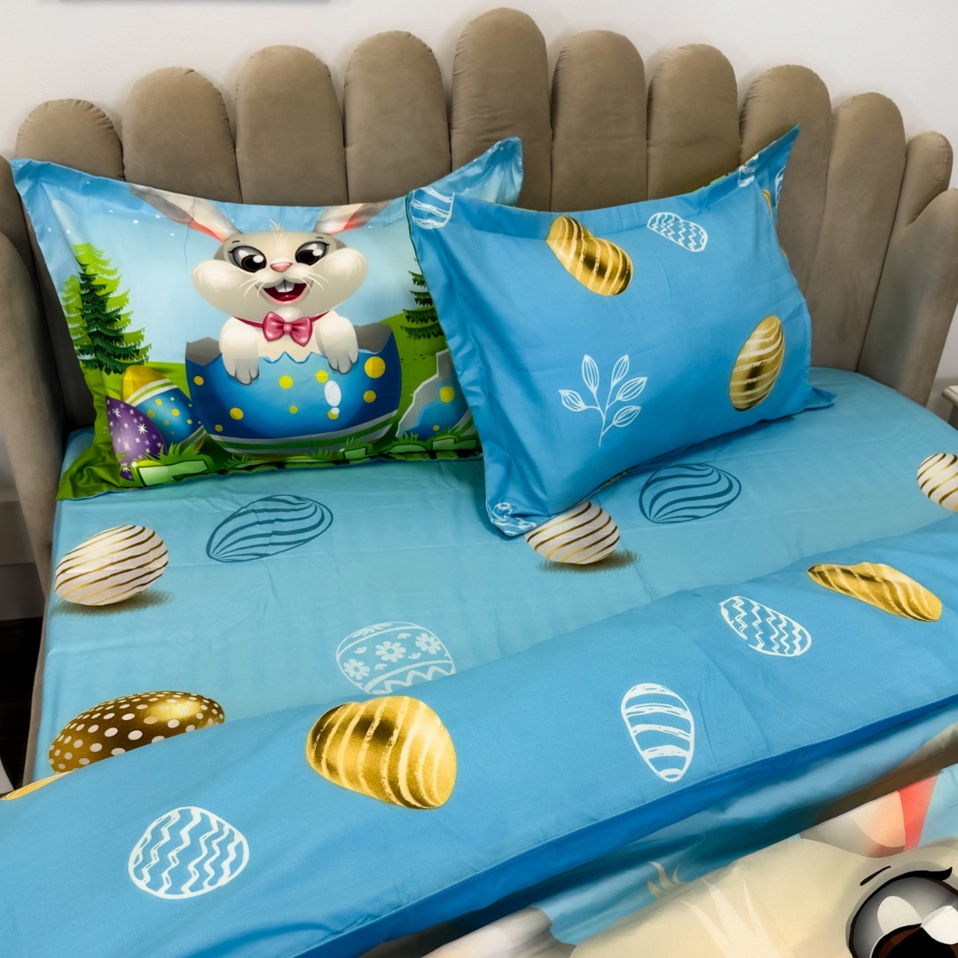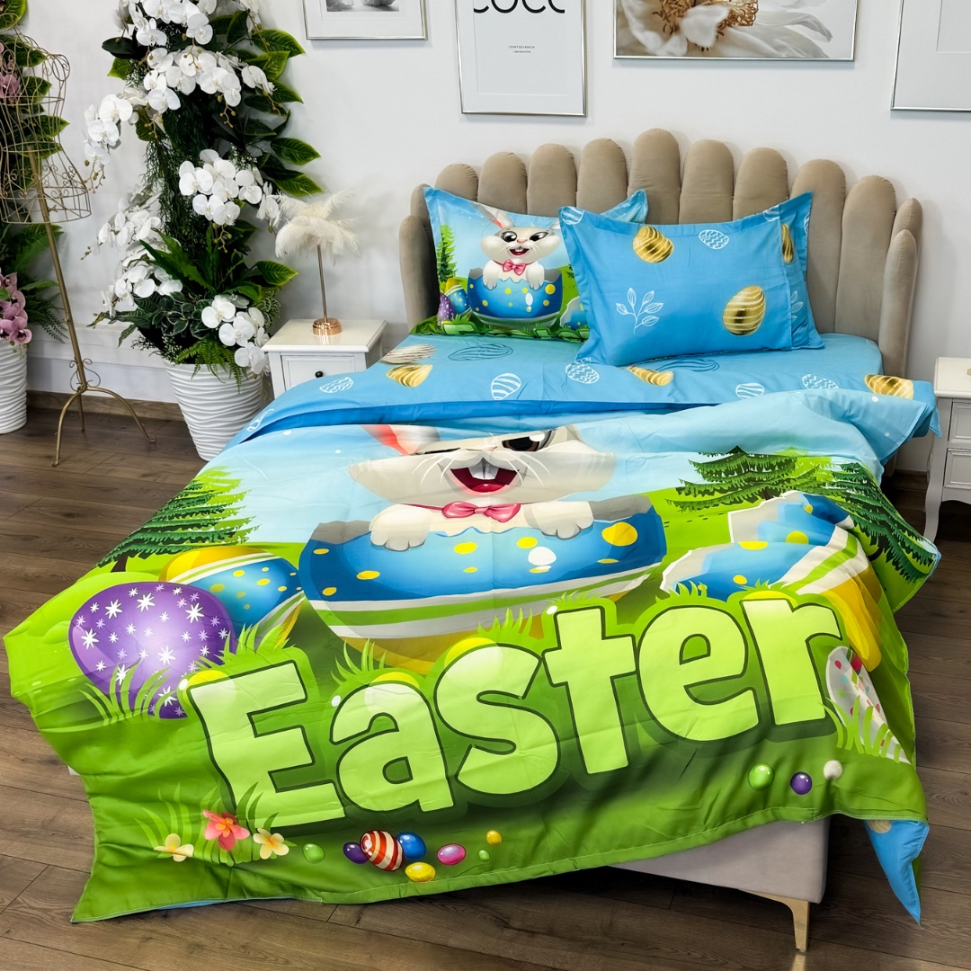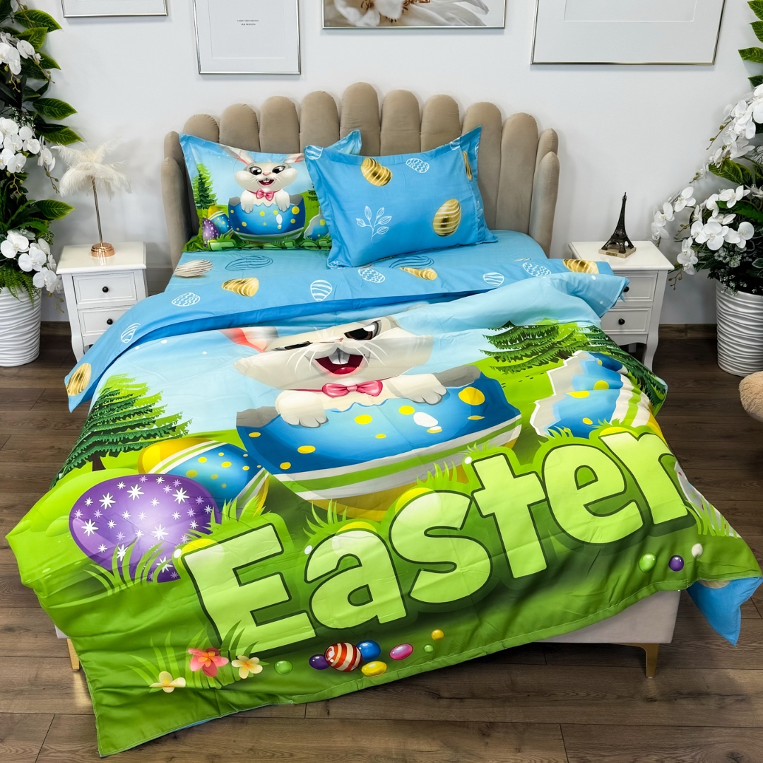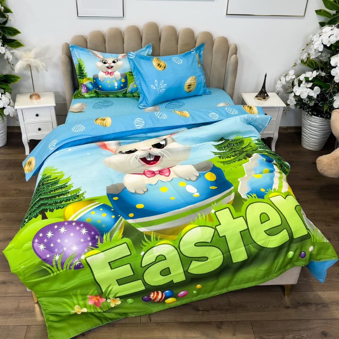 Lenjerie de Pat Dublu, Finet, Imprimeu Digital, 4 Piese, Bleu, Verde, Iepurasul din Oul Incondeiat