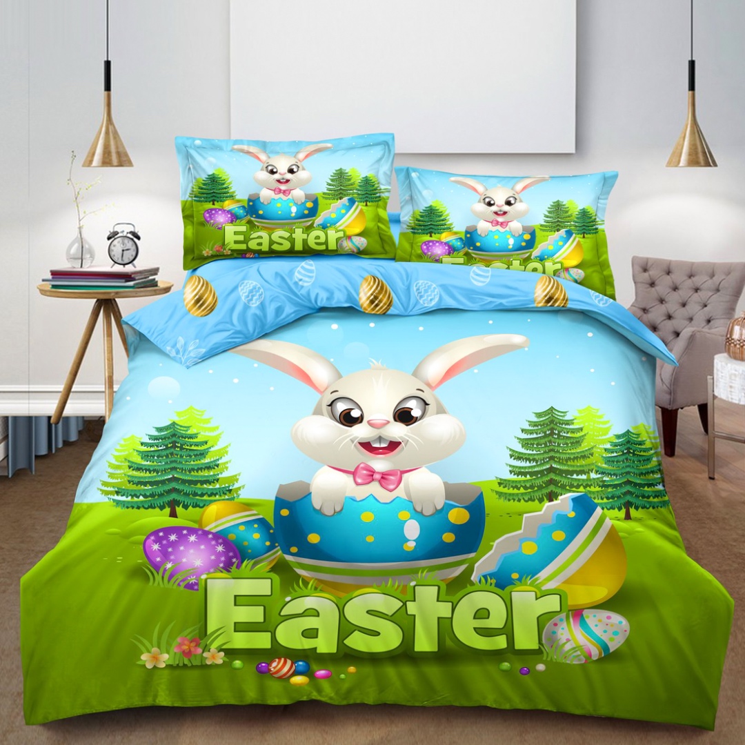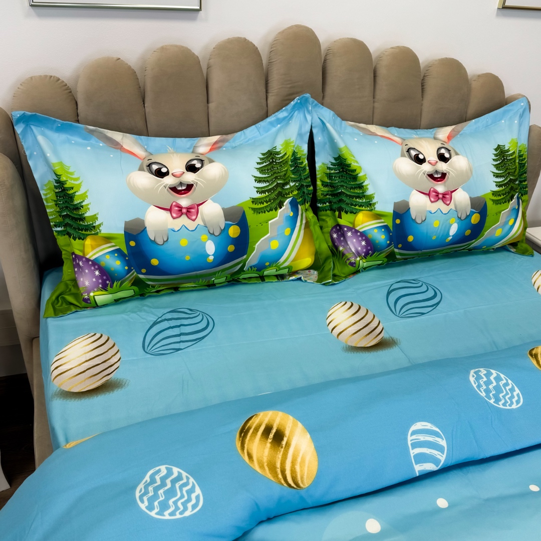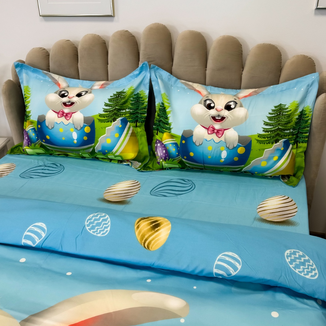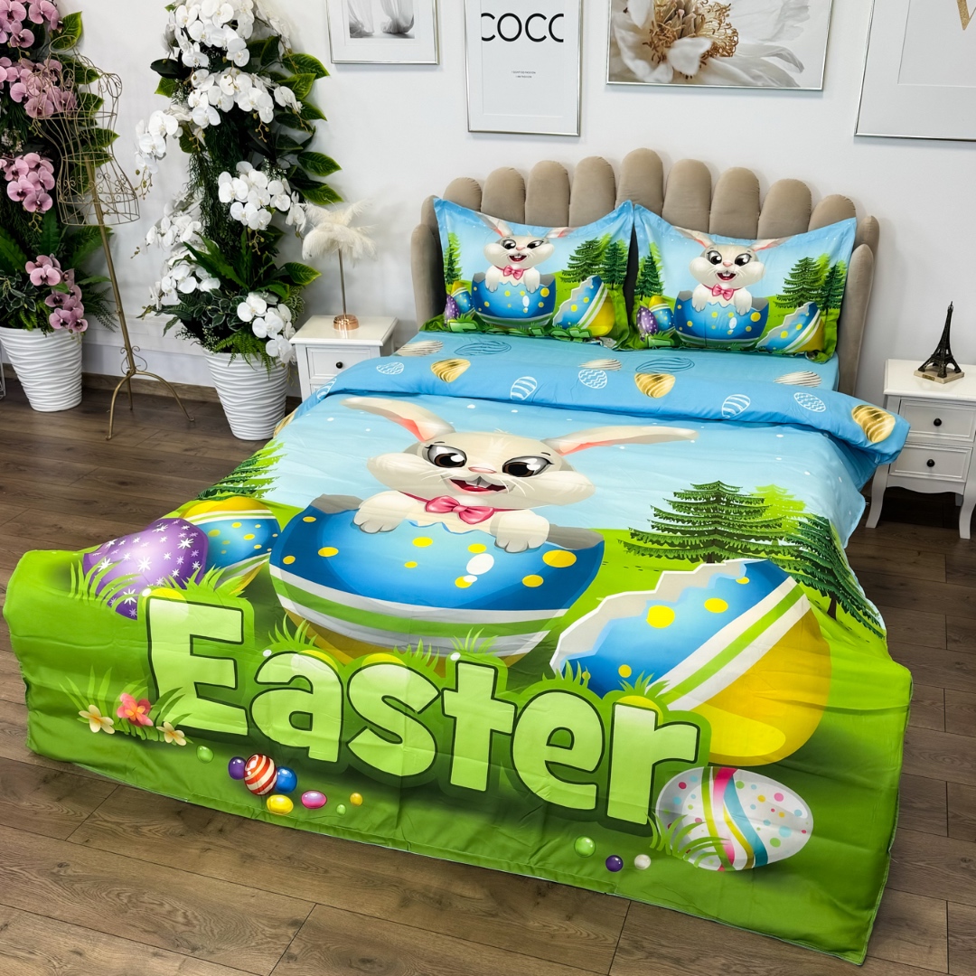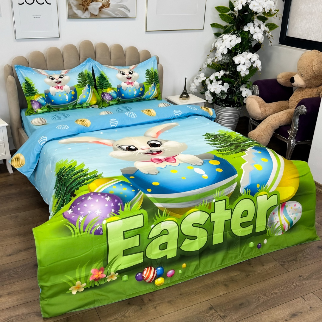 Lenjerie de Pat Dublu, Finet, Imprimeu Digital, 4 Piese, Bleu, Verde, Iepurasul din Oul Incondeiat
