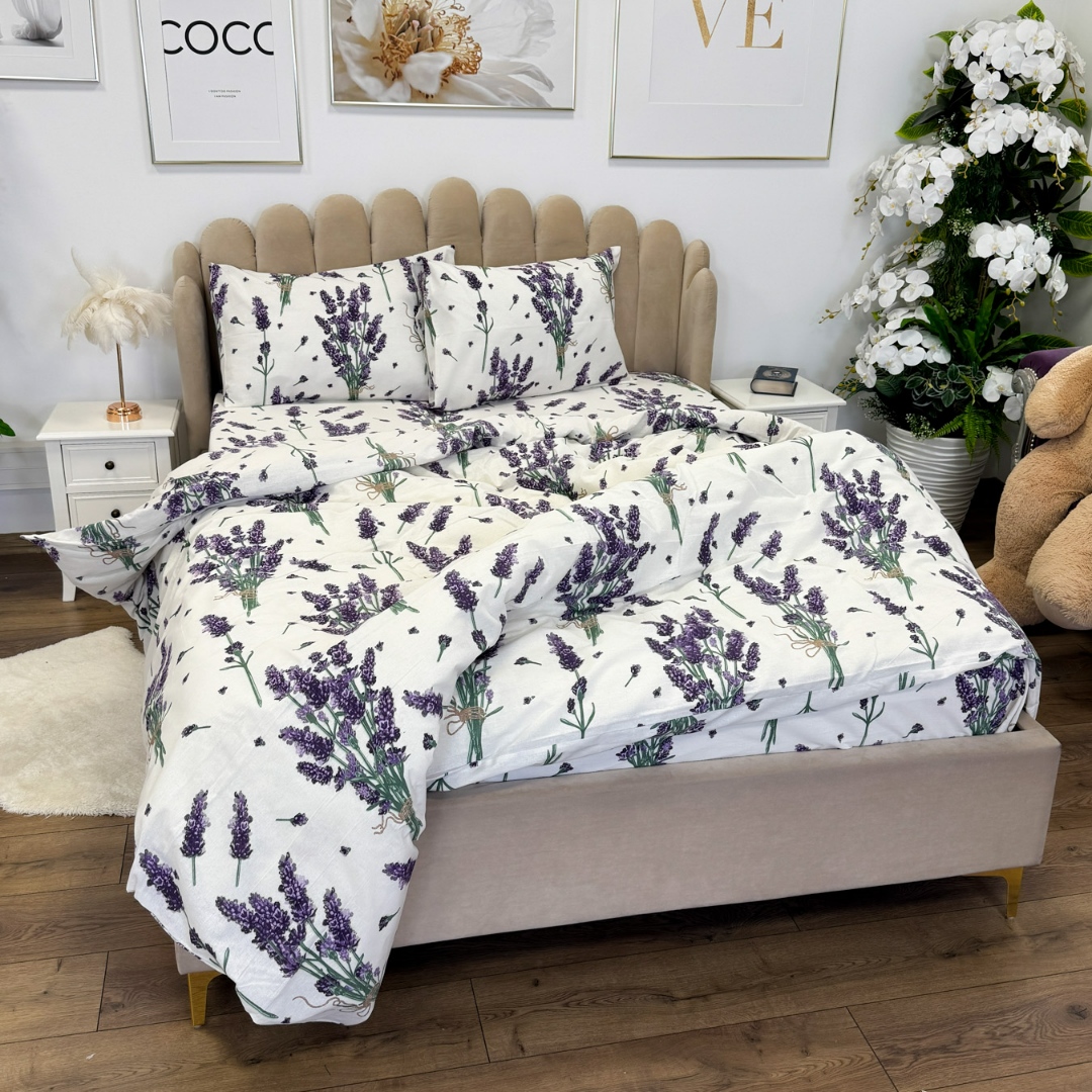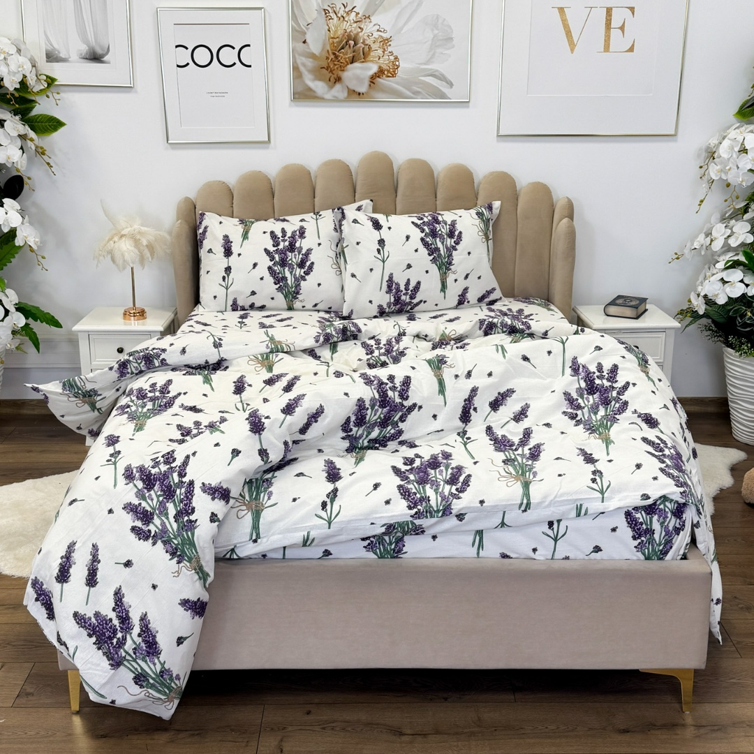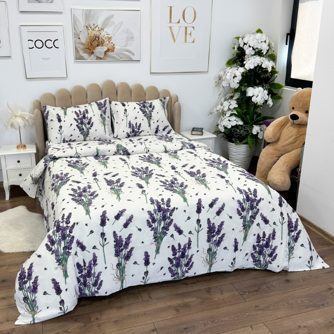 Lenjerie de Pat Dublu, Policoton Ranforsat, 4 piese, Atelier Cumparamisim, Alb, Mov, lavanda