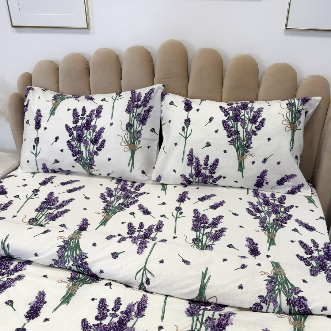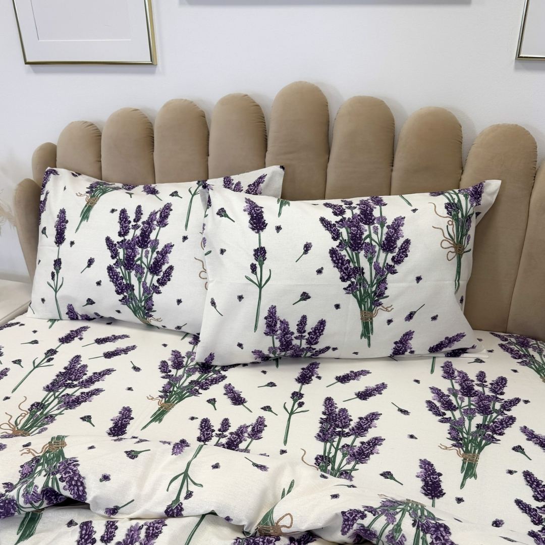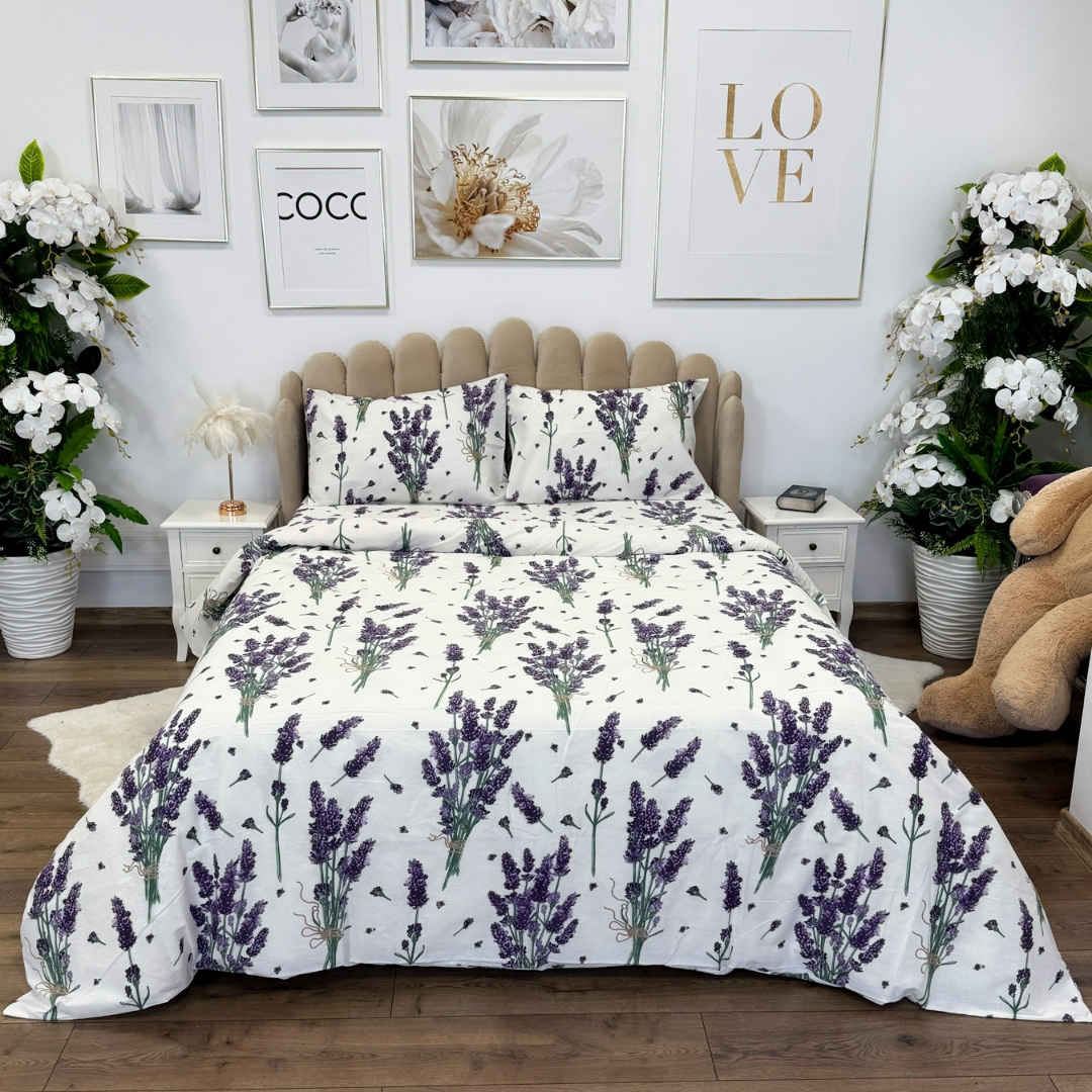 Lenjerie de Pat Dublu, Policoton Ranforsat, 4 piese, Atelier Cumparamisim, Alb, Mov, lavanda