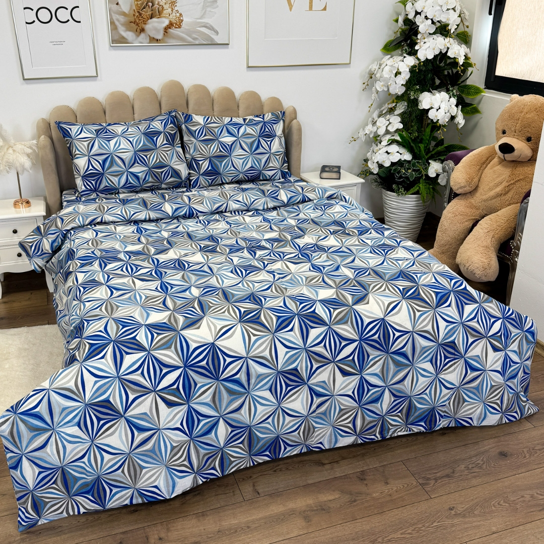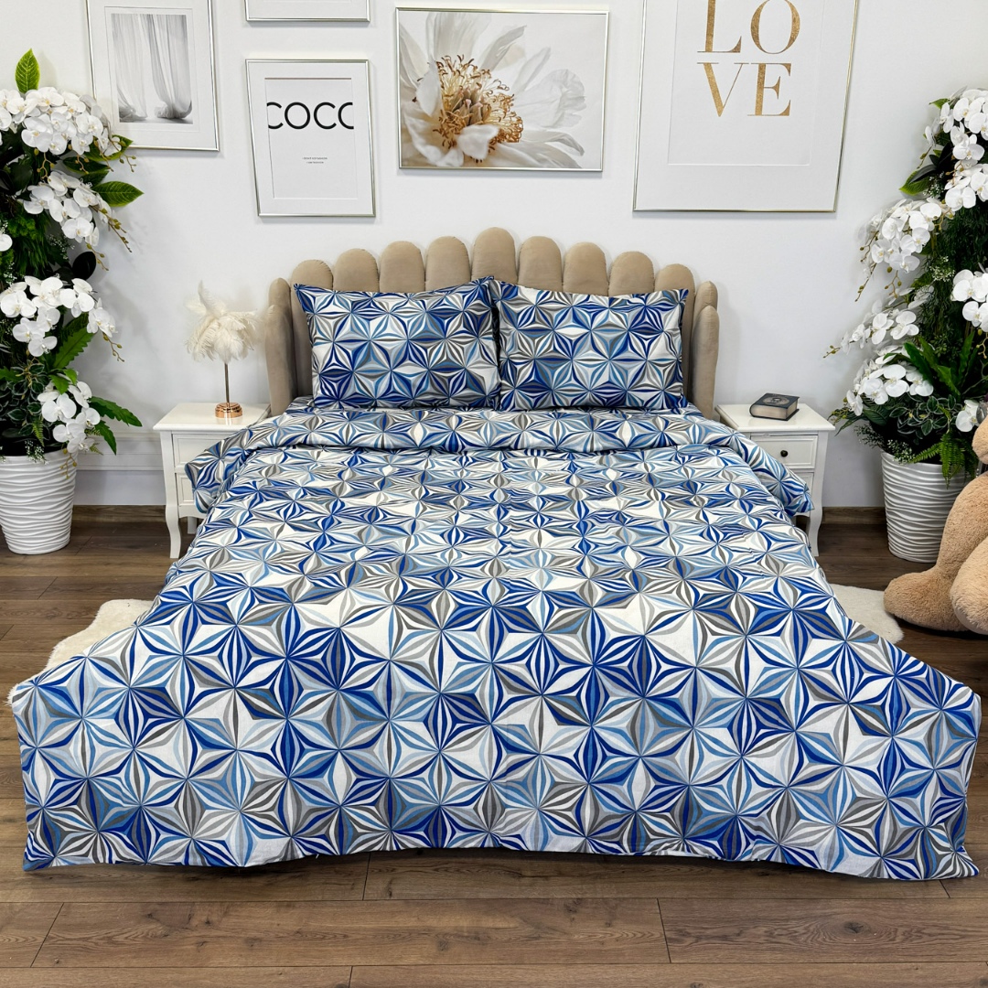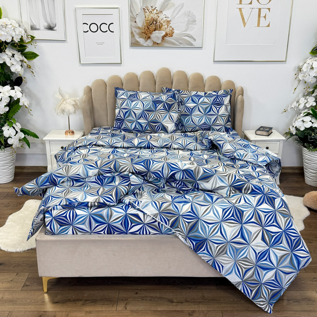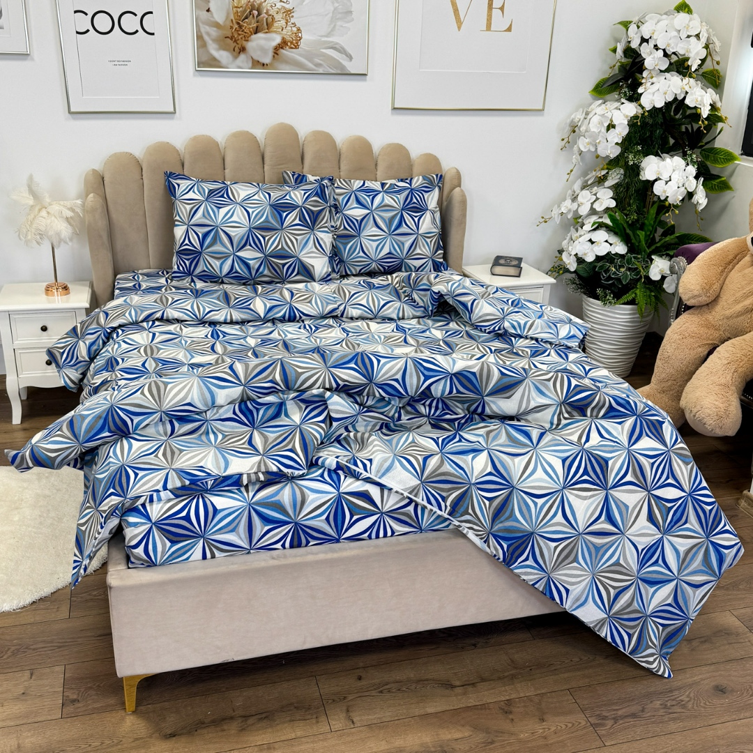 Lenjerie de Pat Dublu, Policoton Ranforsat, 4 piese, Atelier Cumparamisim, Albastru, model elegant