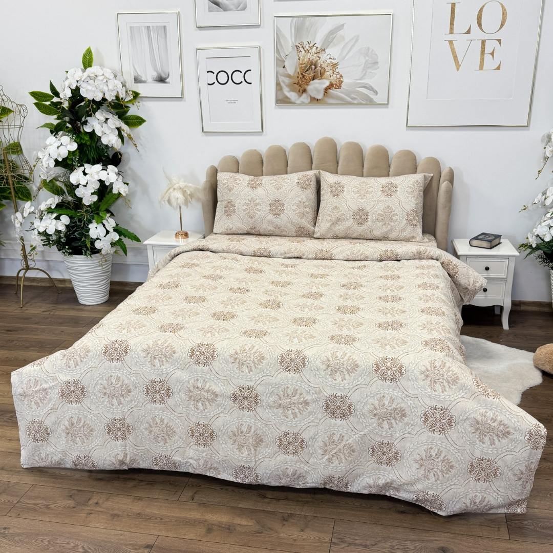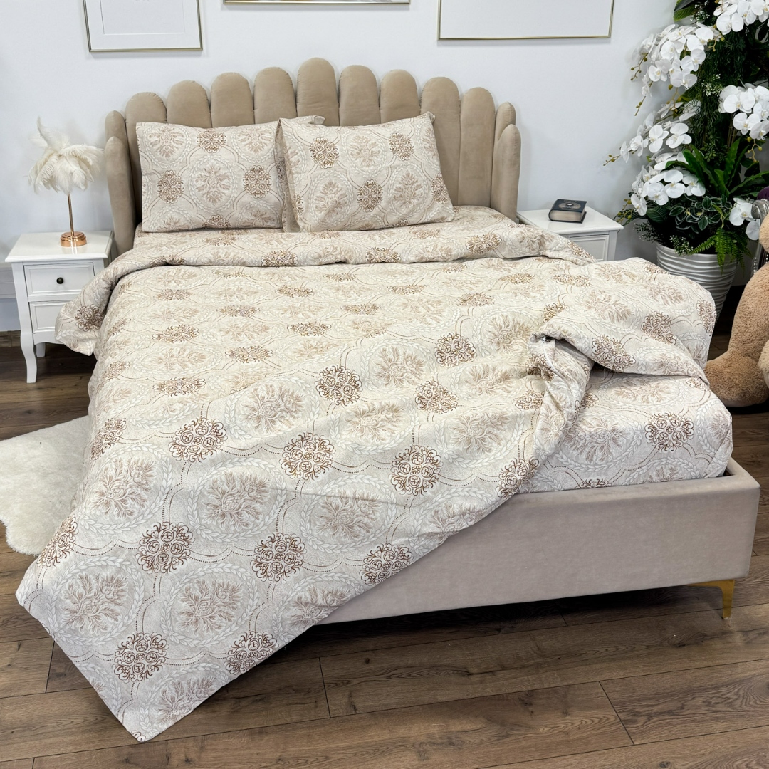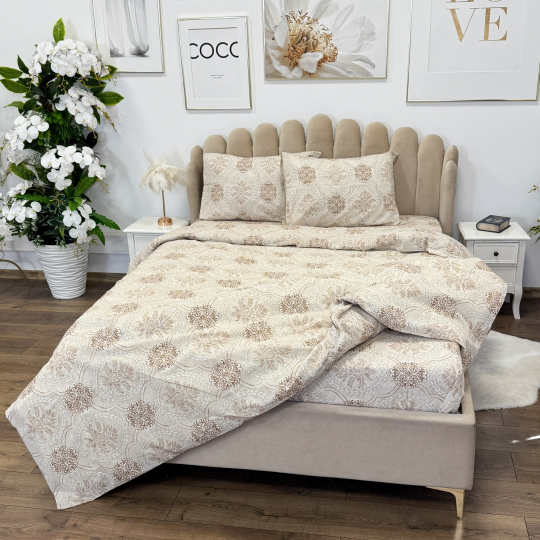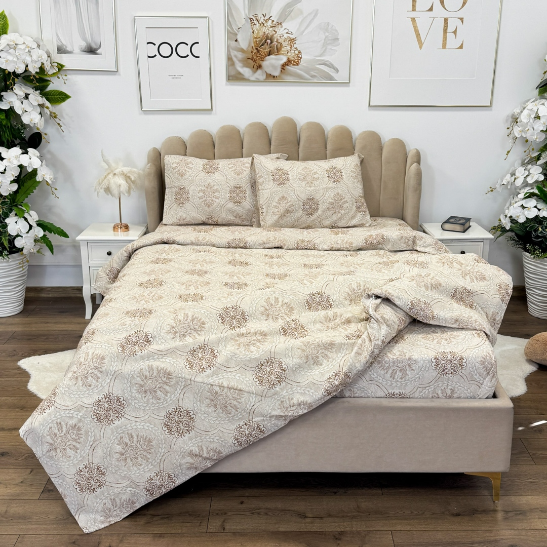 Lenjerie de Pat Dublu, Policoton Ranforsat, 4 piese, Atelier Cumparamisim, Bej, model elegant