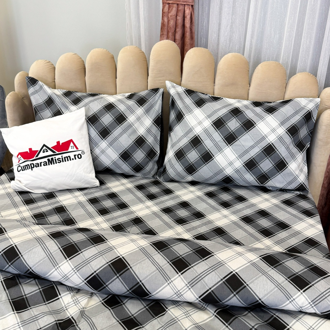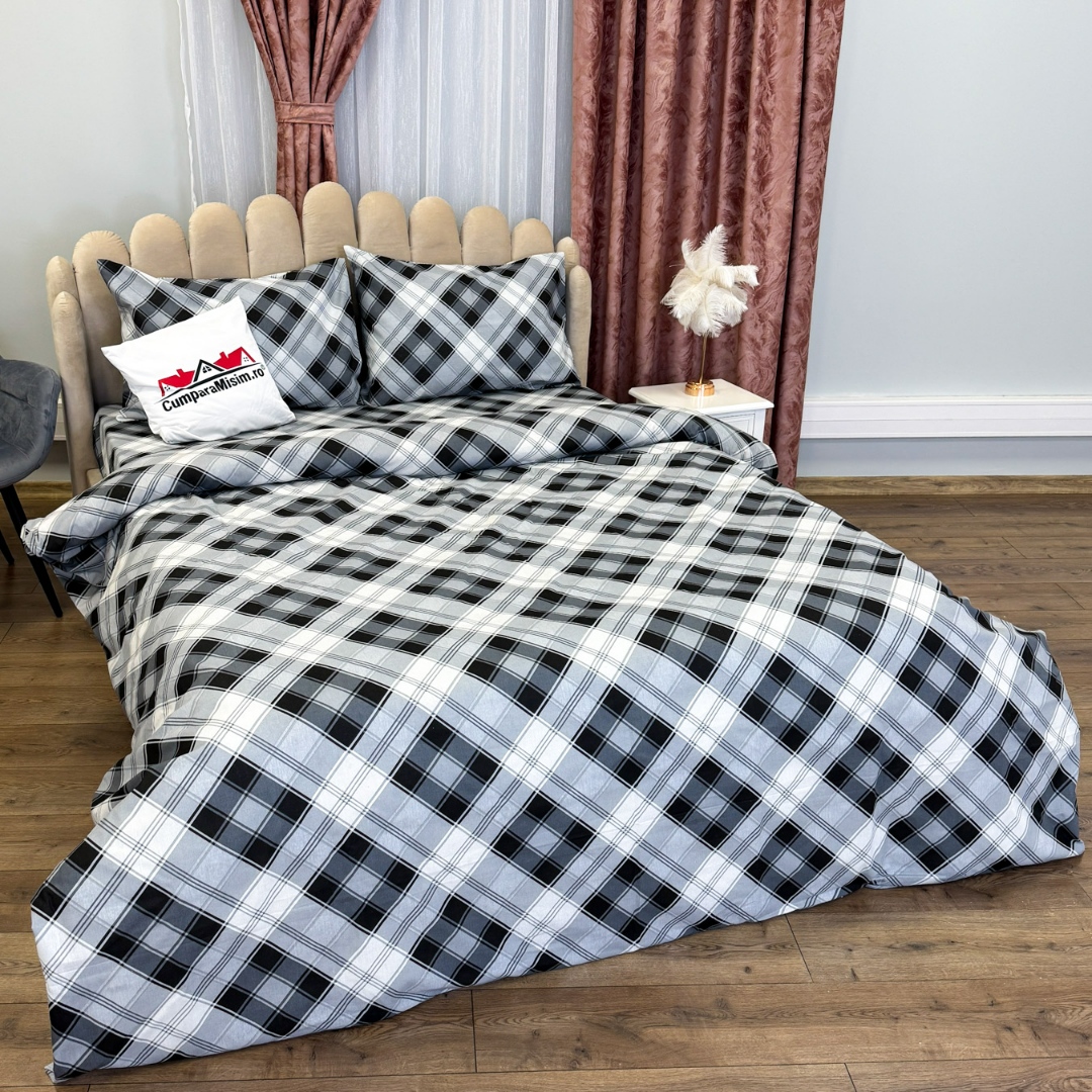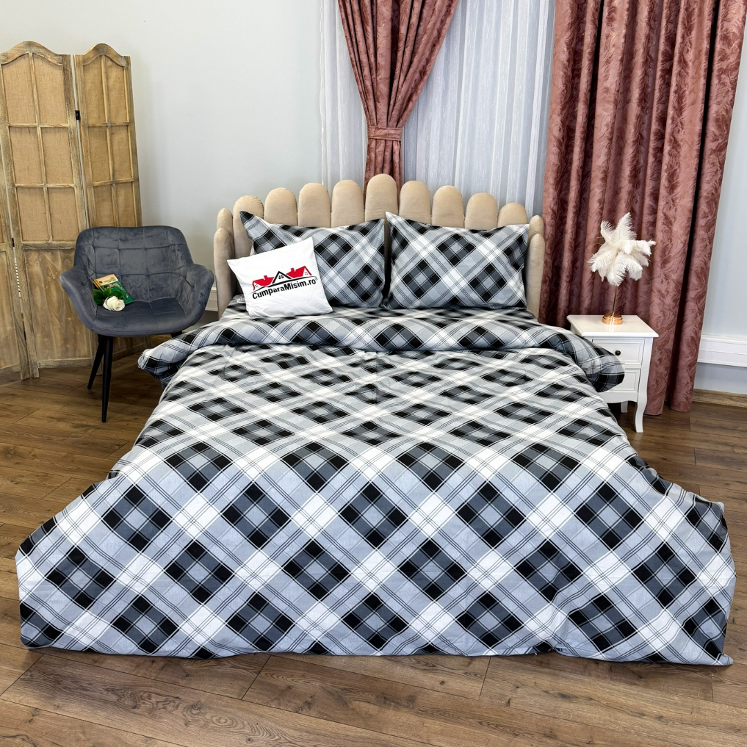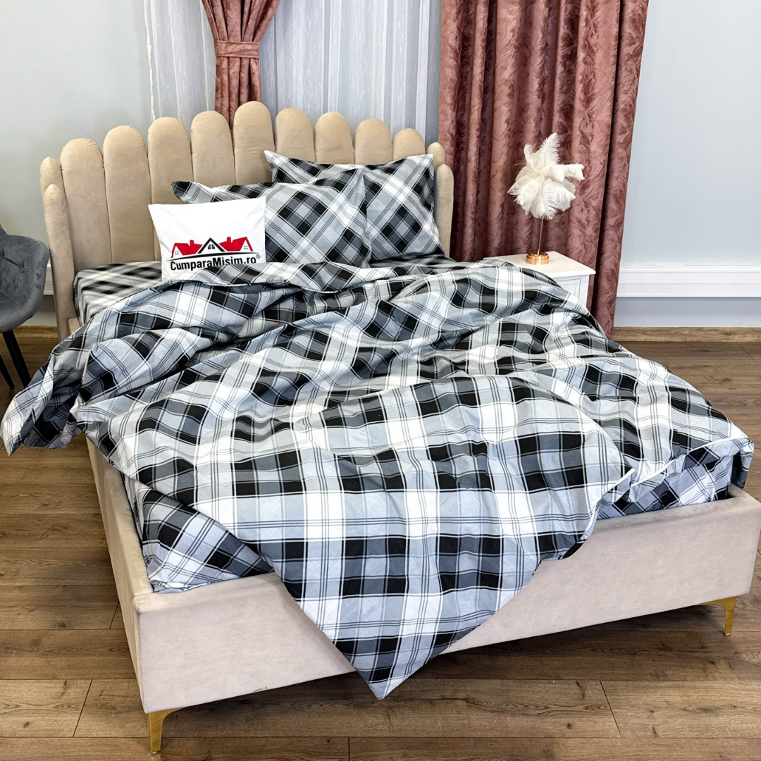 Lenjerie de Pat Dublu, Policoton Ranforsat, 4 piese, Atelier Cumparamisim, Negru, Carouri
