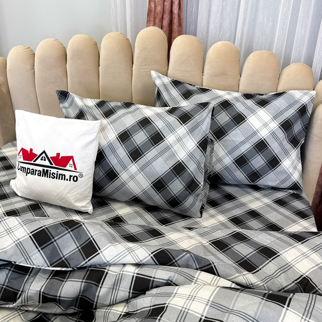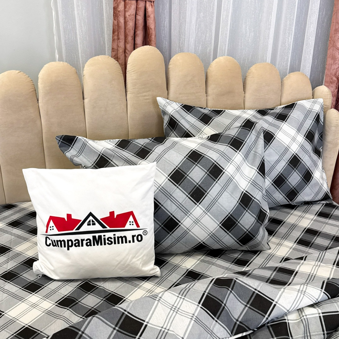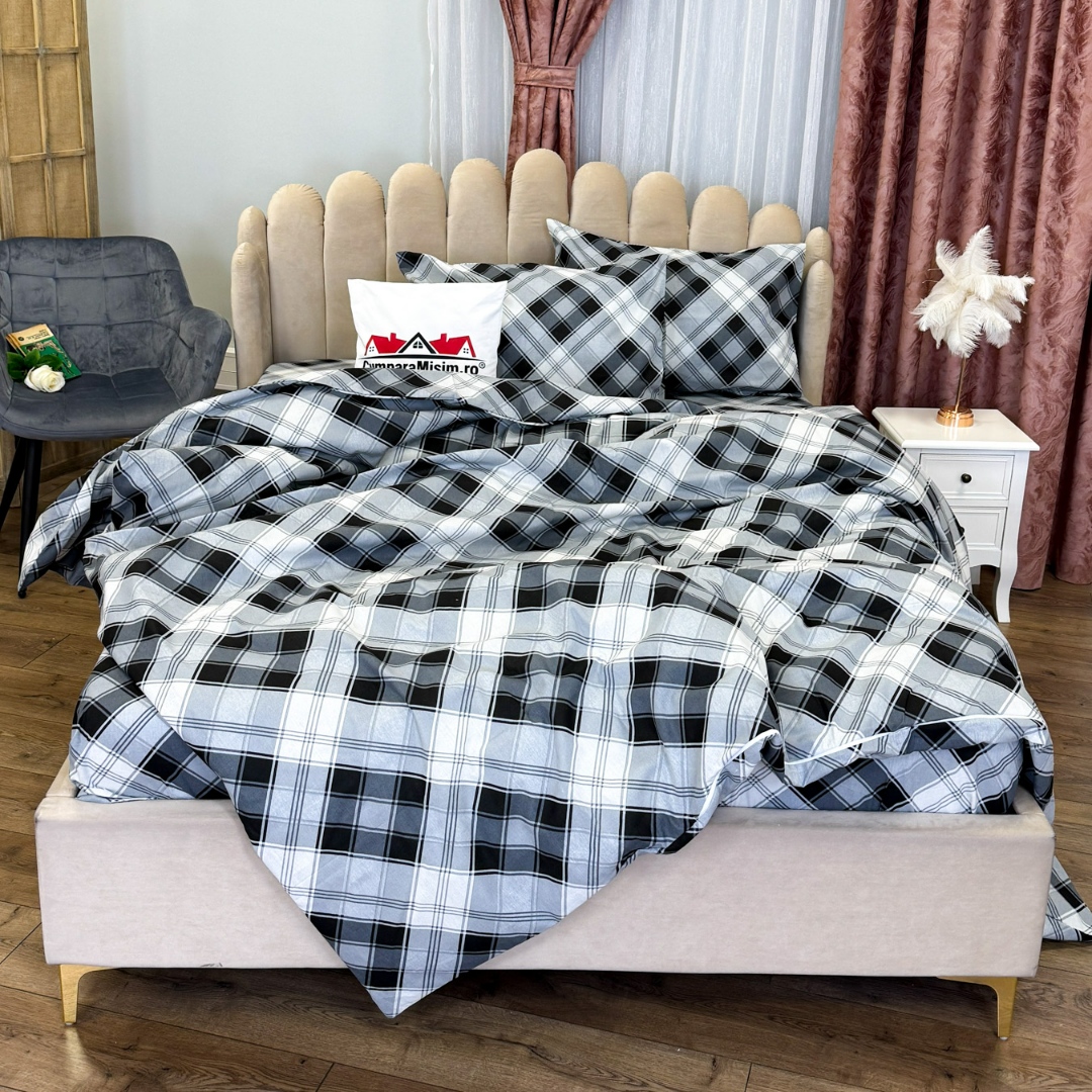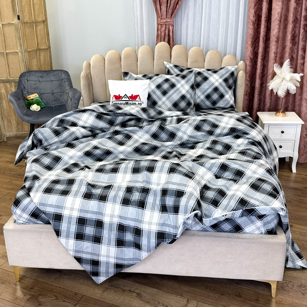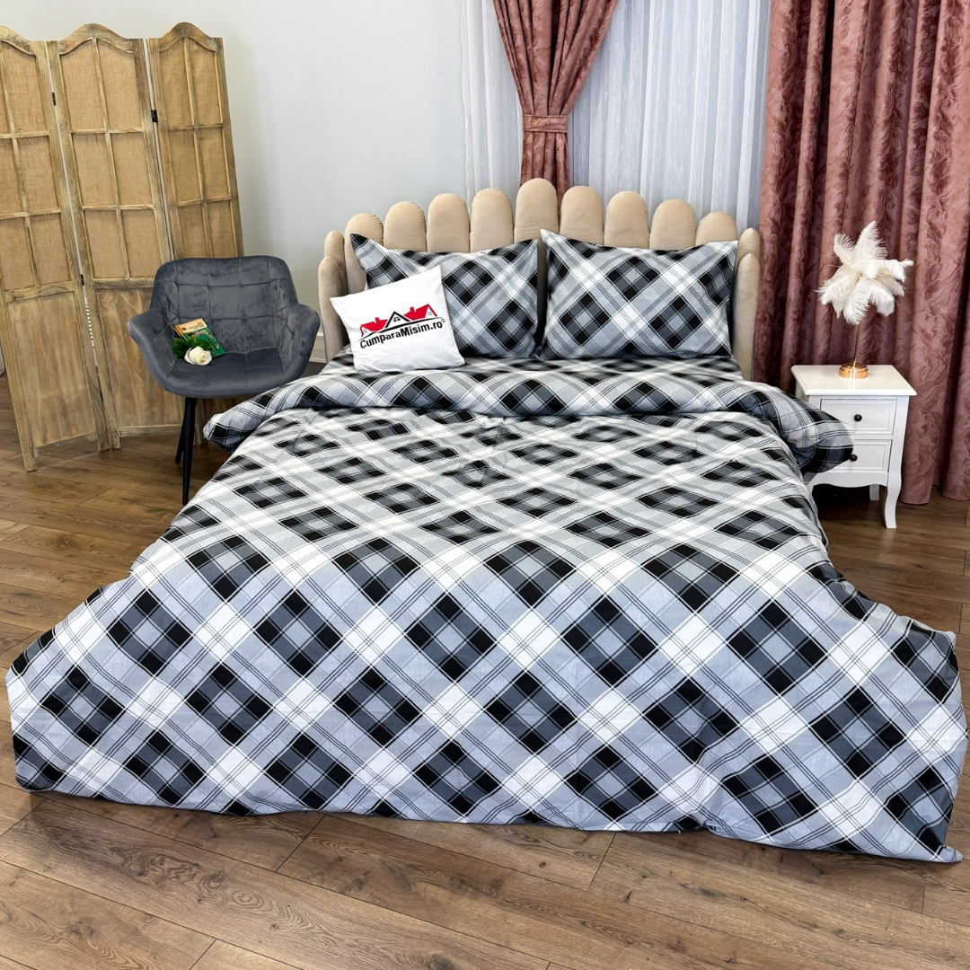 Lenjerie de Pat Dublu, Policoton Ranforsat, 4 piese, Atelier Cumparamisim, Negru, Carouri