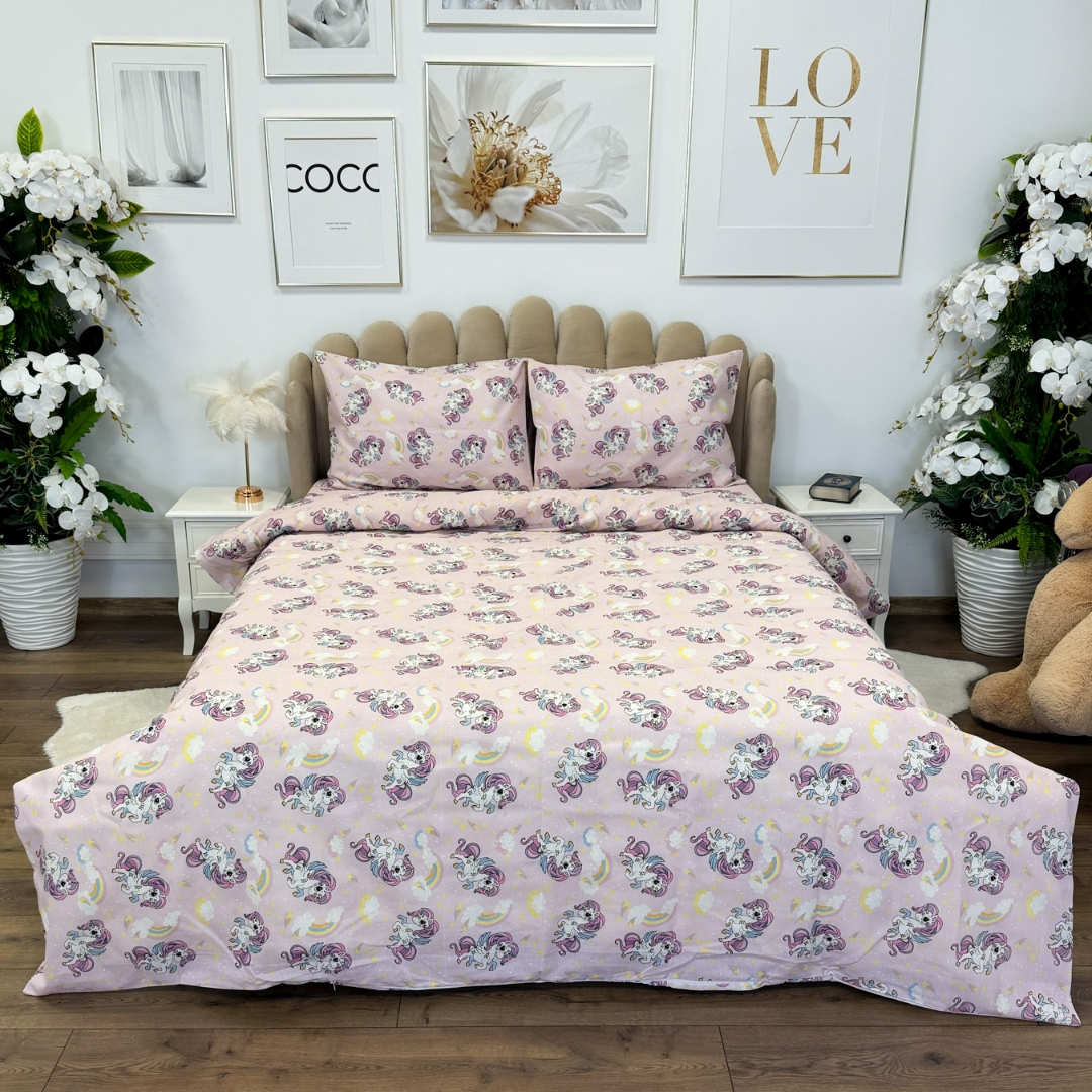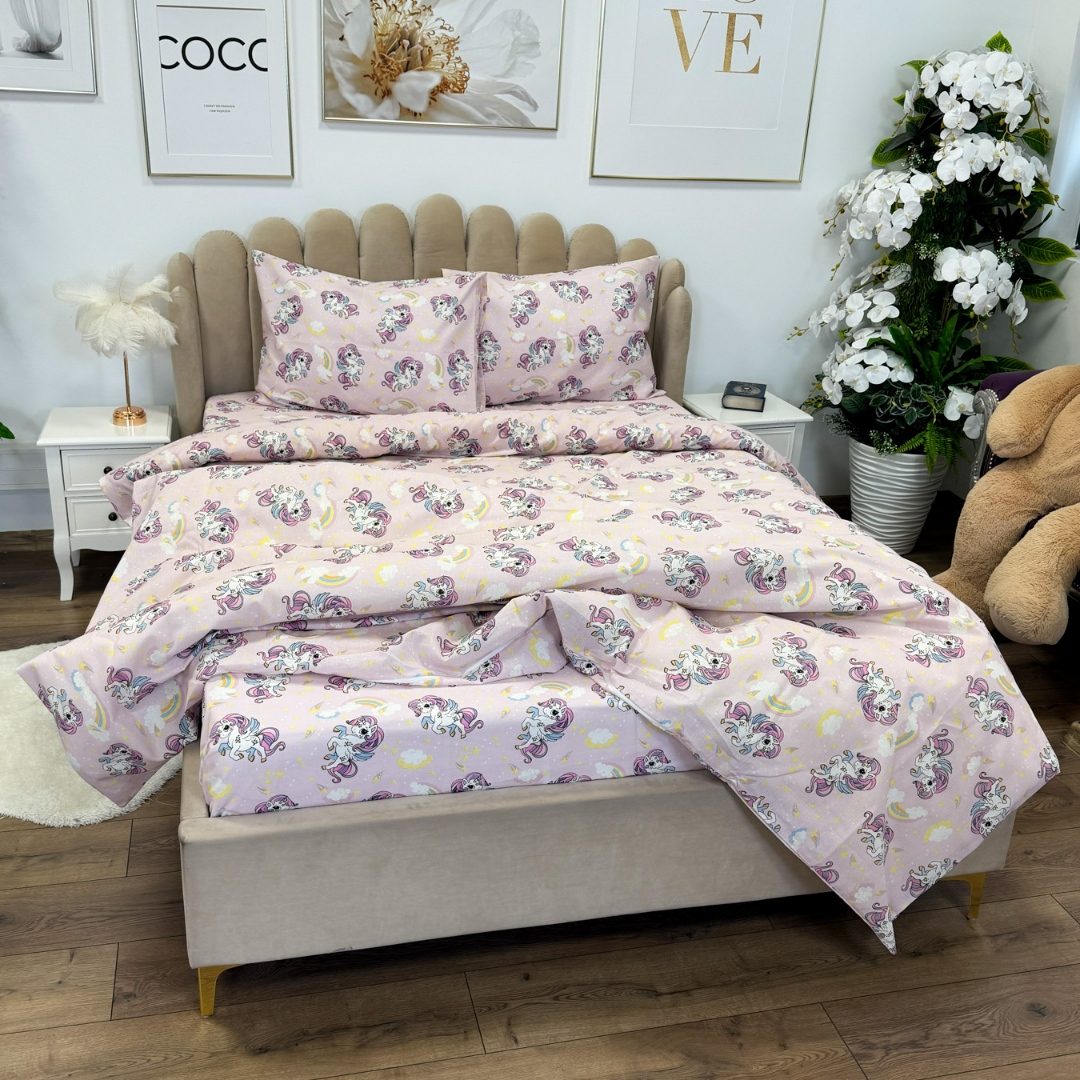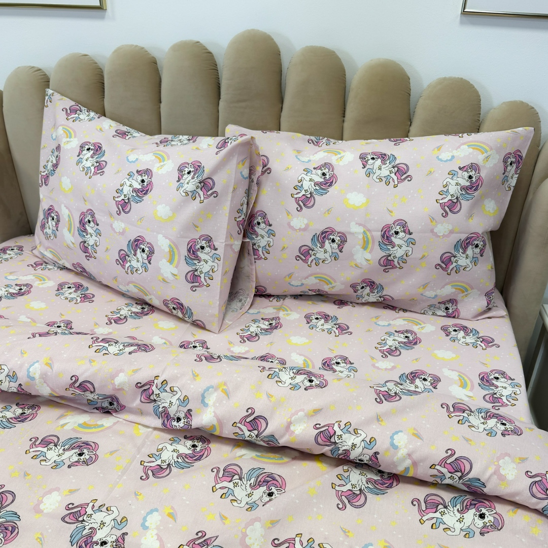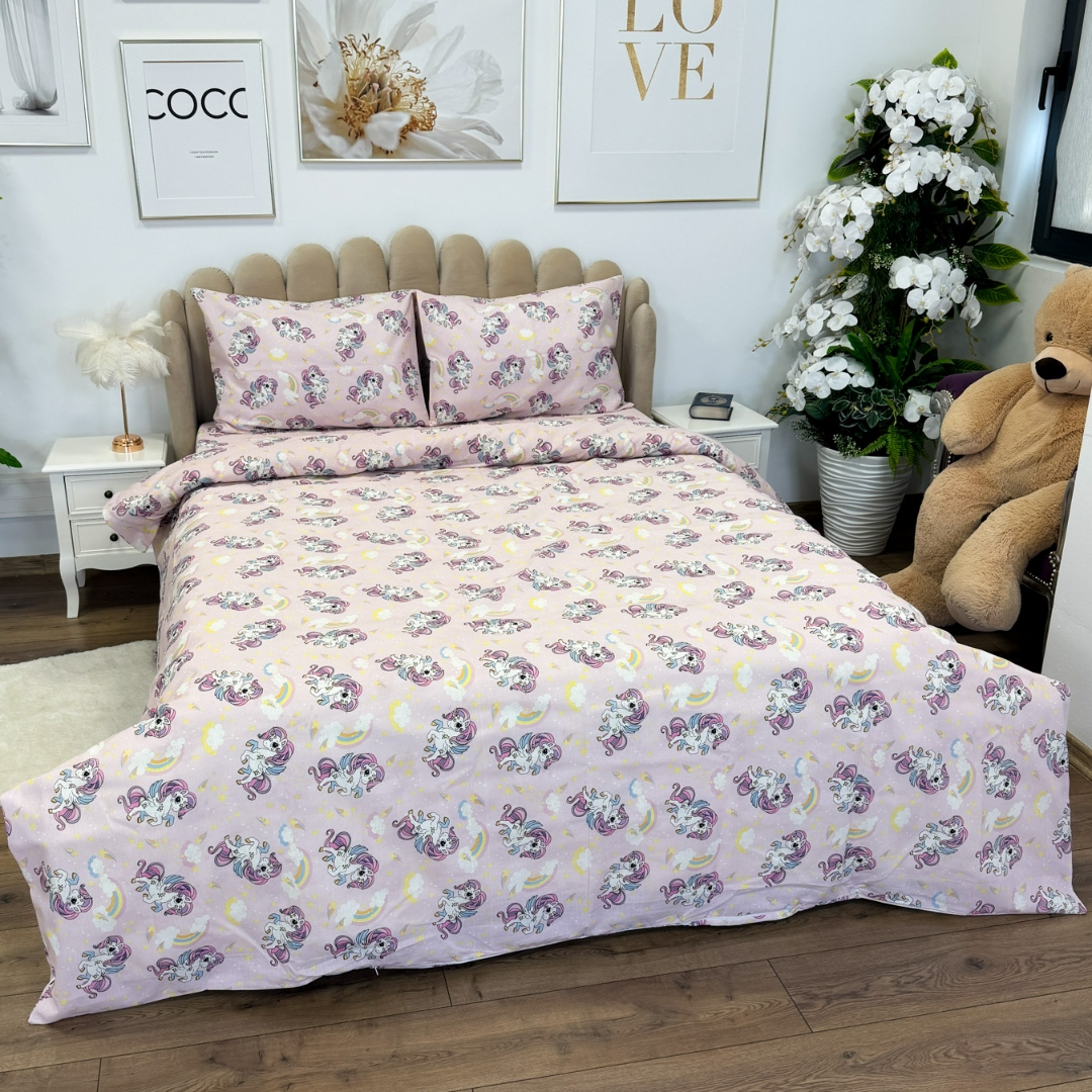 Lenjerie de Pat Dublu, Policoton Ranforsat, 4 piese, Atelier Cumparamisim, Roz, unicorni
