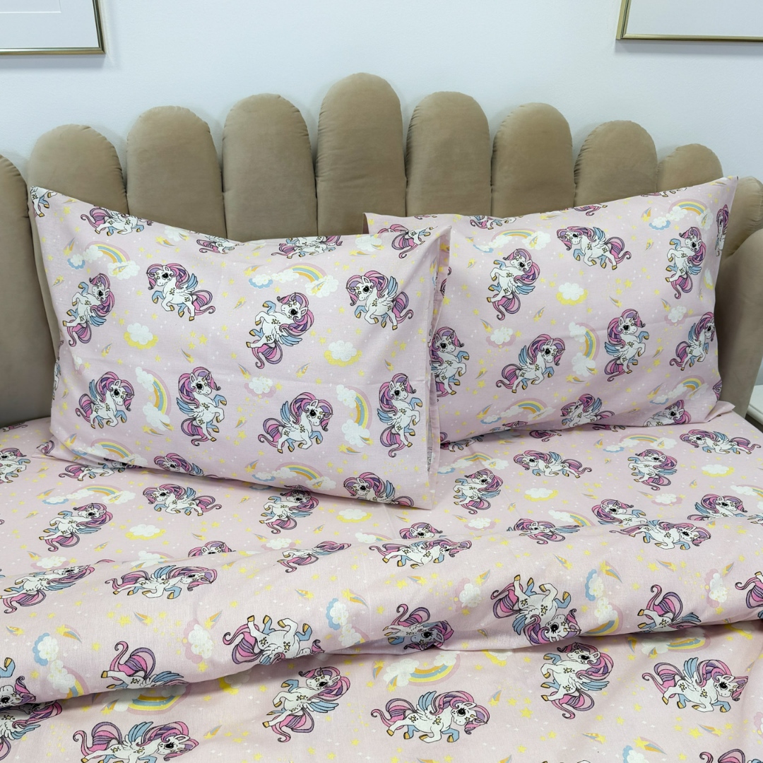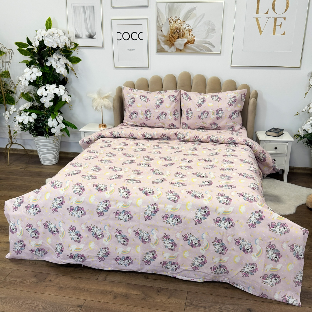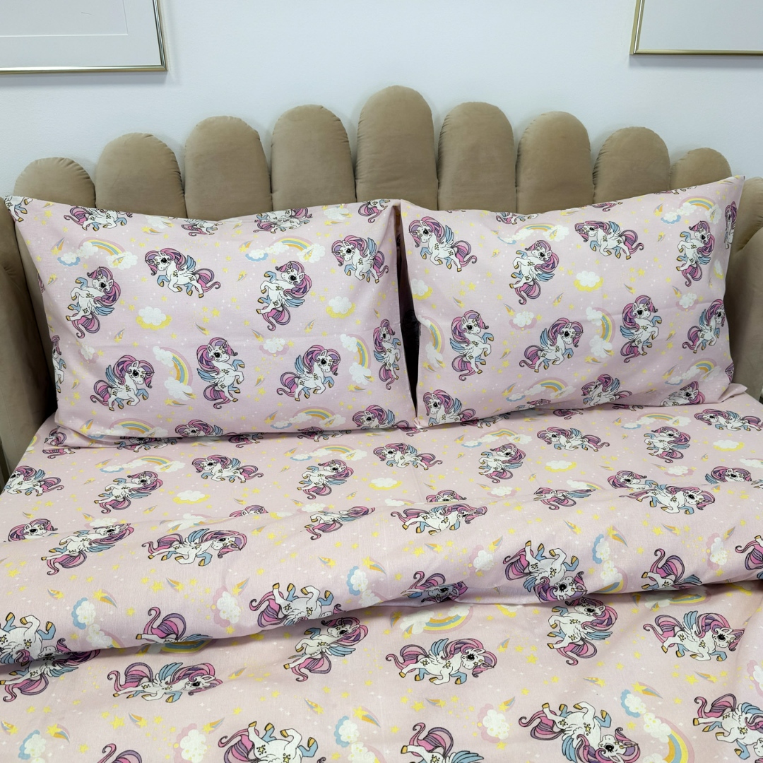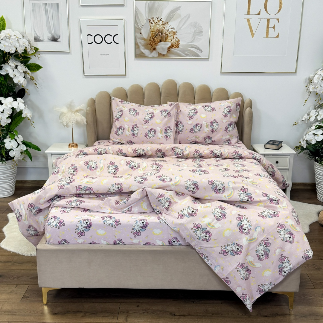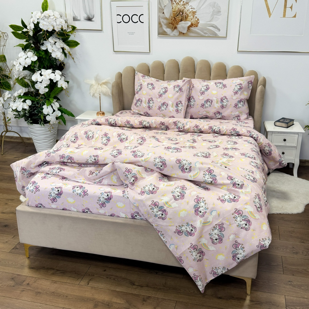 Lenjerie de Pat Dublu, Policoton Ranforsat, 4 piese, Atelier Cumparamisim, Roz, unicorni