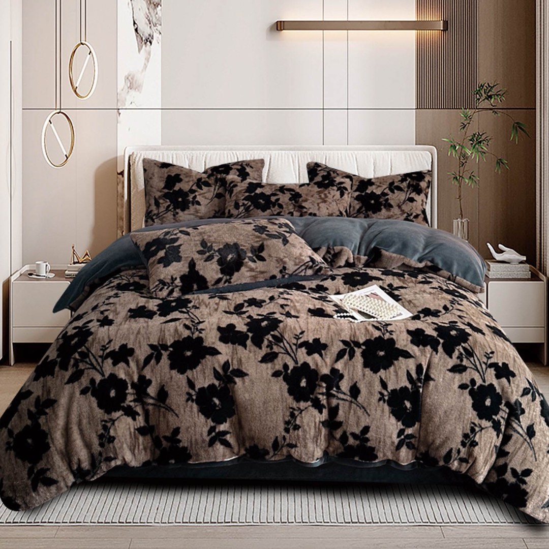 Lenjerie de Pat Premium, ExtraPufoasa, „Bunny Touch”, din Blanita Artificiala tip Iepure + CoCoLiNo Catifelat, 6 piese, Bej, Negru, Flowers