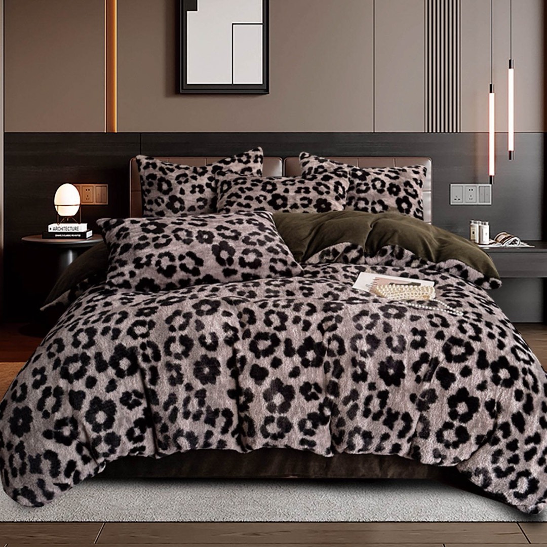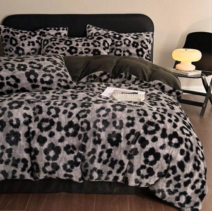 Lenjerie de Pat Premium, ExtraPufoasa, „Bunny Touch”, din Blanita Artificiala tip Iepure + CoCoLiNo Catifelat, 6 piese, Gri, Negru, Leopard Print