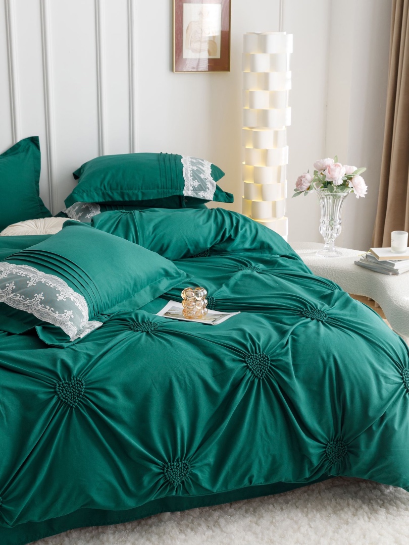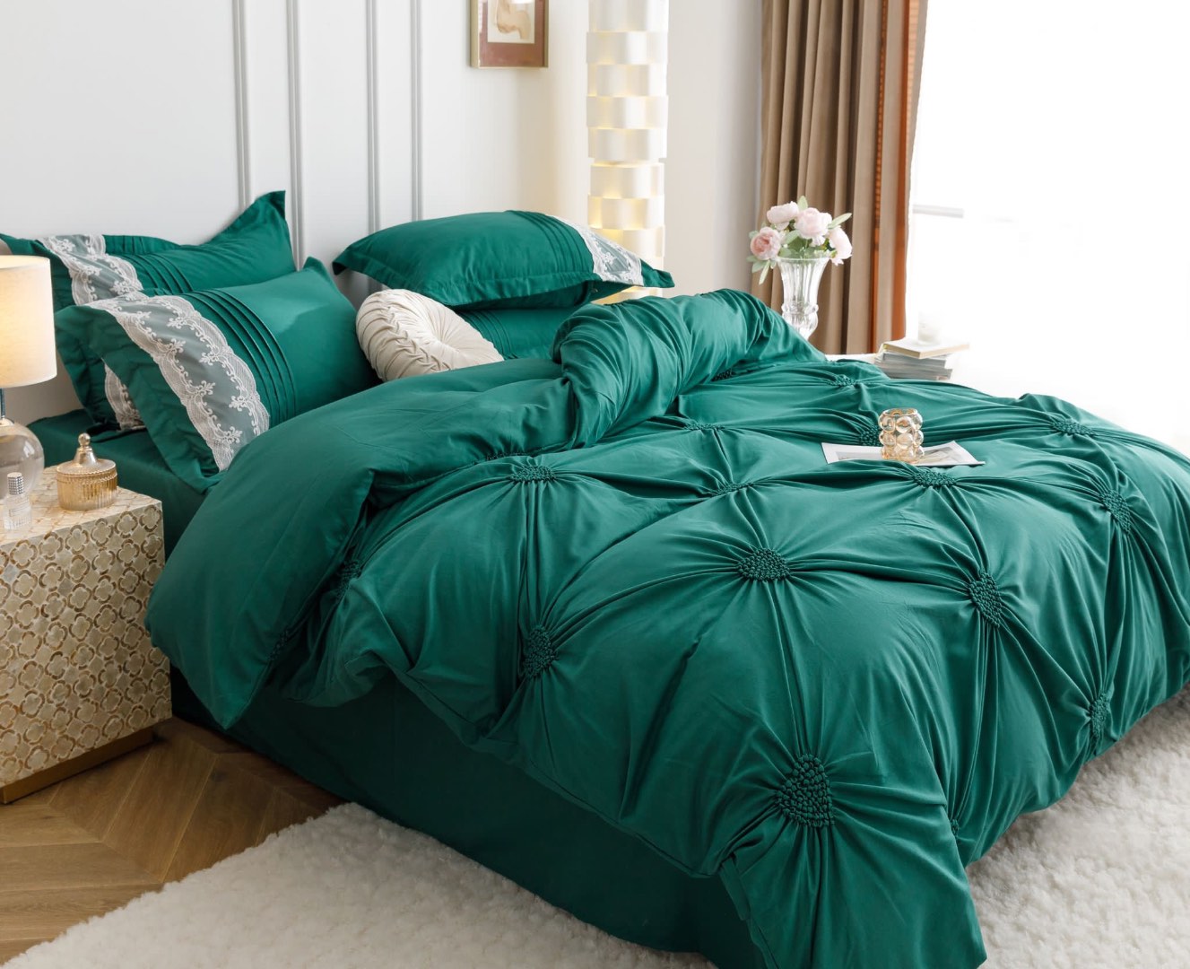Lenjerie de Pat 6 Piese – Finet Soft Touch cu Pliuri Brodate in forma de Inimioara si Dantela Delicata O lenjerie de pat care imbina eleganta detaliilor brodate cu rasfatul unui material ultra-moale – Finet Soft Touch, acum si mai fin la atingere. Designul cu inimioare brodate si pliuri fine, lucrate atent, este completat de dantela rafinata aplicata pe o latura a fetelor de perna, pentru un efect vizual deosebit si un plus de rafinament in orice dormitor. Material premium: Finet