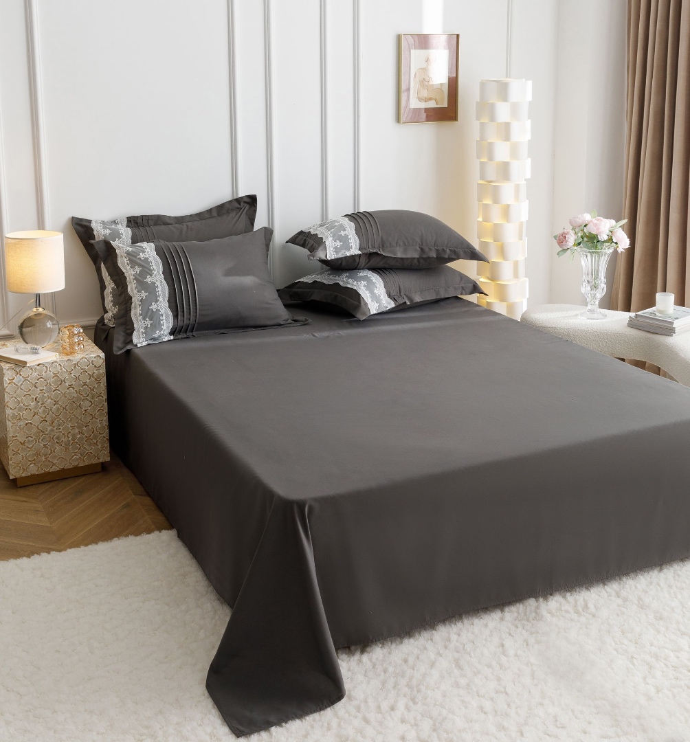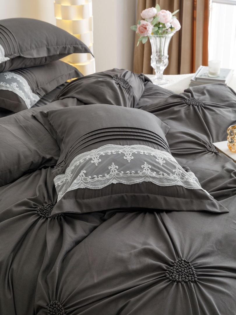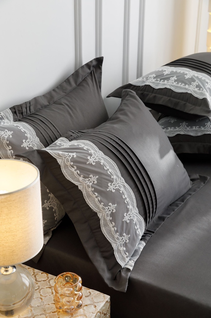 Lenjerie de Pat Premium, JOJO HOME, Finet Soft Touch, cu Inimioare din Pliuri Brodate, si Dantela Delicata, 6 Piese, Nesifonabila si Durabila, Gri inchis