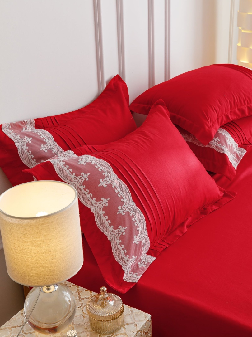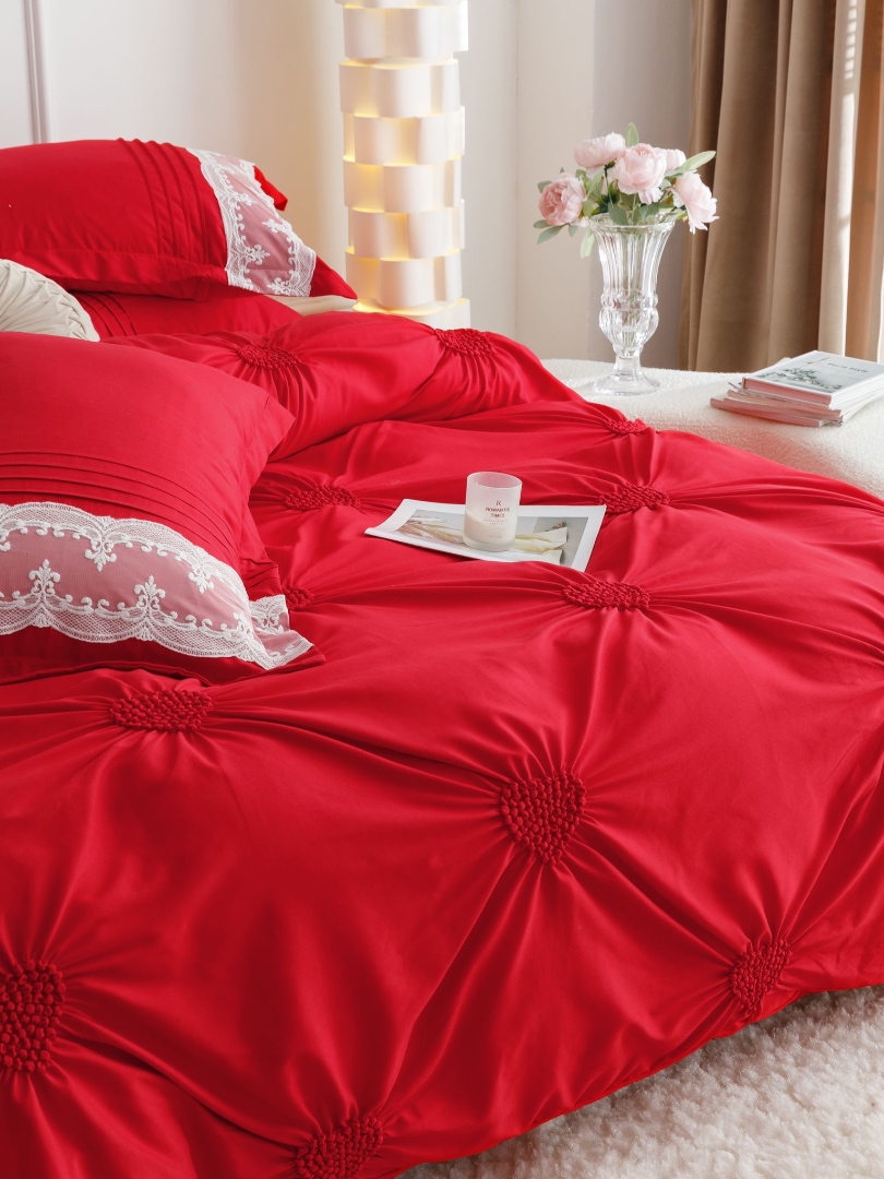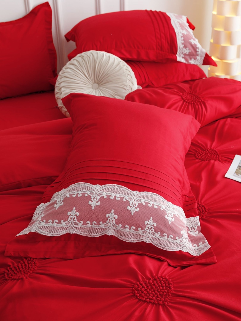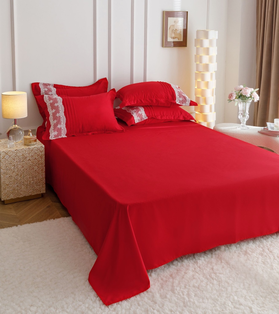 Lenjerie de Pat Premium, JOJO HOME, Finet Soft Touch, cu Inimioare din Pliuri Brodate, si Dantela Delicata, 6 Piese, Nesifonabila si Durabila, Rosu
