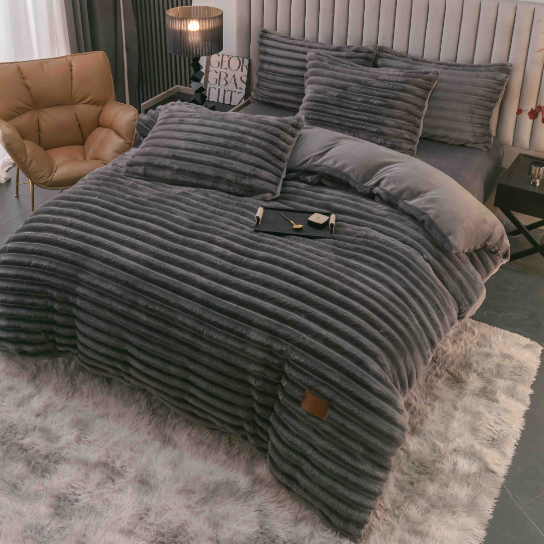 Lenjerie de Pat Cocolino cu Blanita tip Iepuras, Shorthair, Gofrata – 4 Piese, Cu Elastic, Ultra-Pufoasa     Creeaza-ti propria zona de confort cu aceasta lenjerie din Cocolino cu blanita tip iepuras – moale, groasa si rafinata, conceputa special pentru sezonul rece. Textura gofrata cu dungi groase ofera nu doar un plus de stil dormitorului tau, ci si o senzatie unica la atingere. Este alegerea ideala pentru cei care cauta caldura, confort si eleganta intr-un singur set.   Material pre