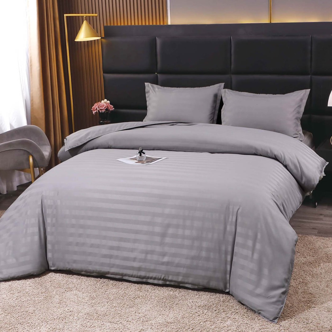 Lenjerie de pat dublu din damasc finetat, linear (tesatura din fabrica, ci nu imprimata, cu dunga de 1 cm grosime), confectionata din bumbac 70% + 30% poliester, cu 4 piese, folosita cel mai mult in regimul hotelier, datorita simplitatii si calitatii extraordinare. Materialul are un aspect usor lucios pentru o nota de eleganta si rafinament, datorita tesaturii speciale. Damascul este recunoscut pentru rezistenta sa in timp la nenumarate spalari, nemodificandu-si aspectul. Damas