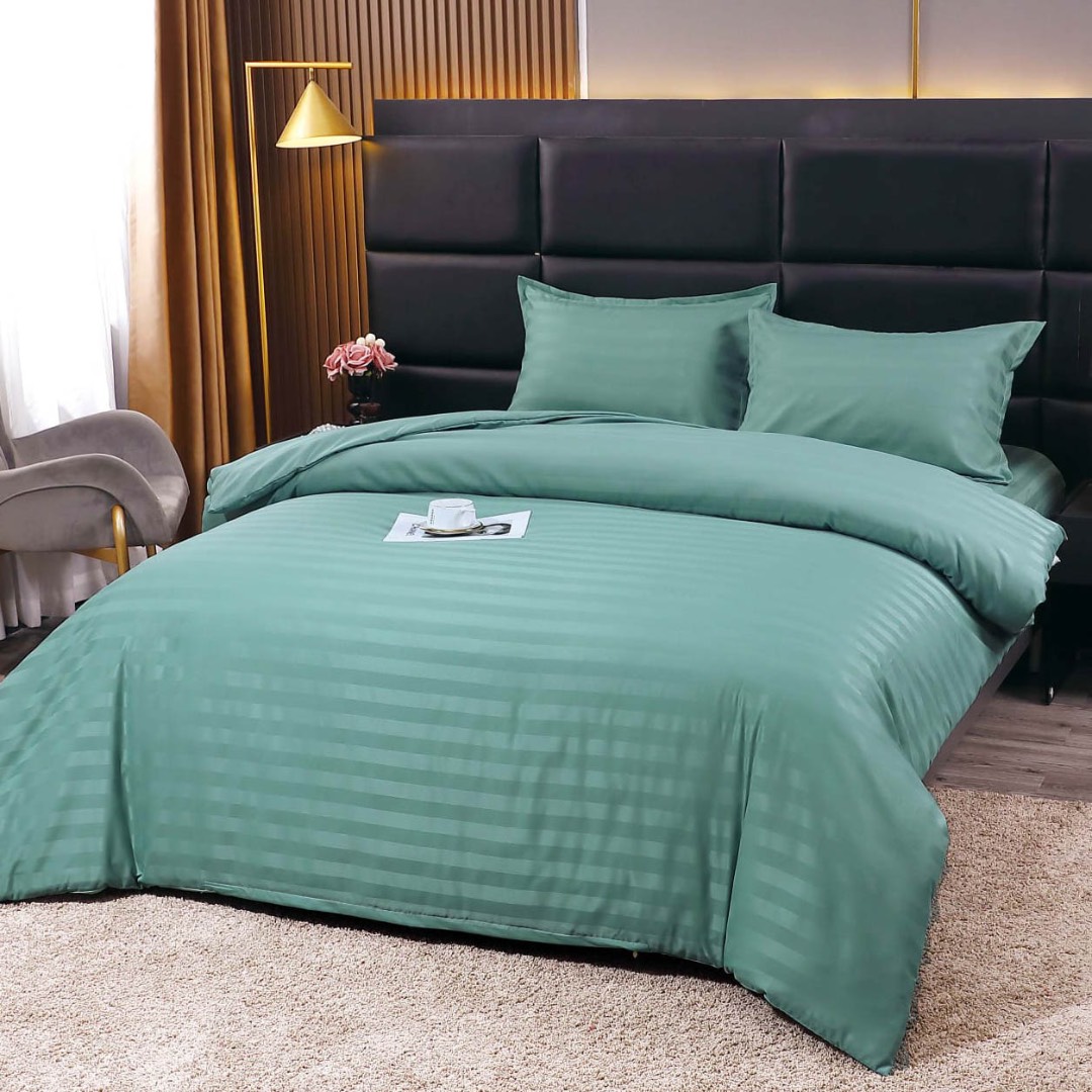 Lenjerie de pat dublu din damasc finetat, linear (tesatura din fabrica, ci nu imprimata, cu dunga de 1 cm grosime), confectionata din bumbac 70% + 30% poliester, cu 4 piese, folosita cel mai mult in regimul hotelier, datorita simplitatii si calitatii extraordinare. Materialul are un aspect usor lucios pentru o nota de eleganta si rafinament, datorita tesaturii speciale. Damascul este recunoscut pentru rezistenta sa in timp la nenumarate spalari, nemodificandu-si aspectul. Damas
