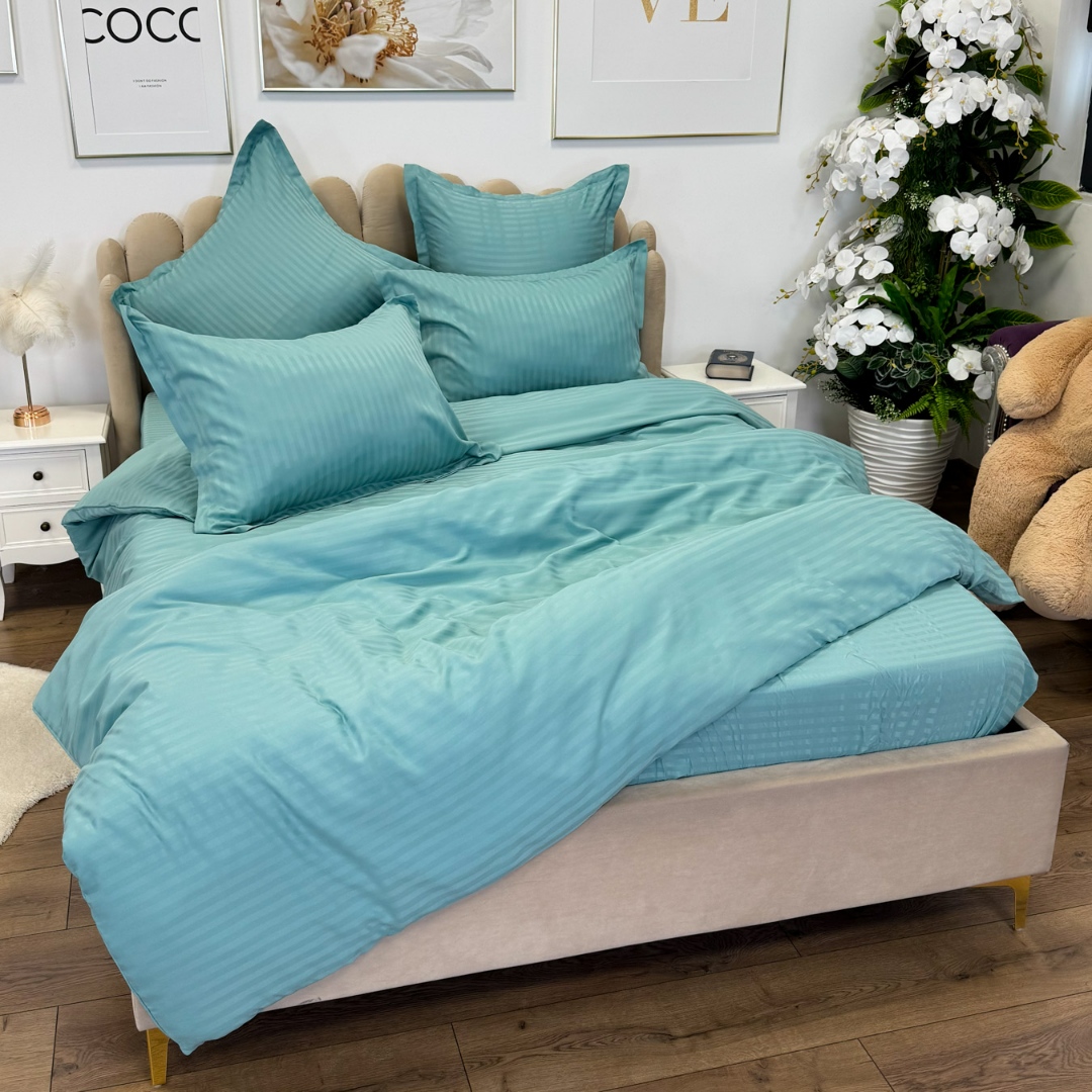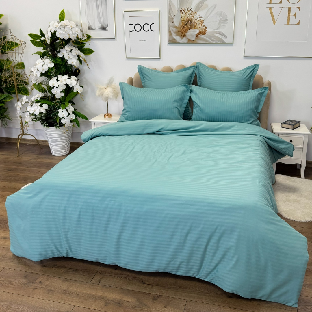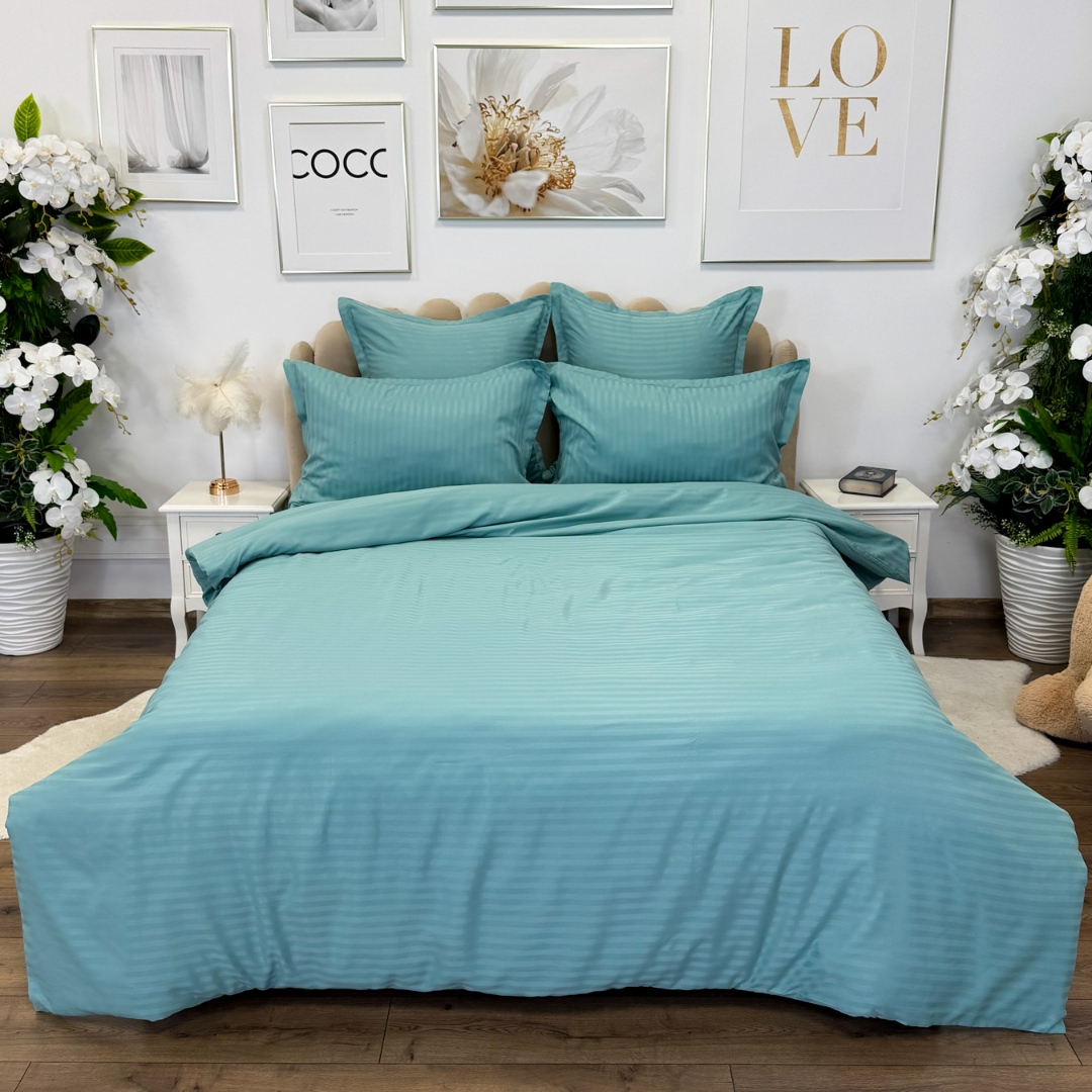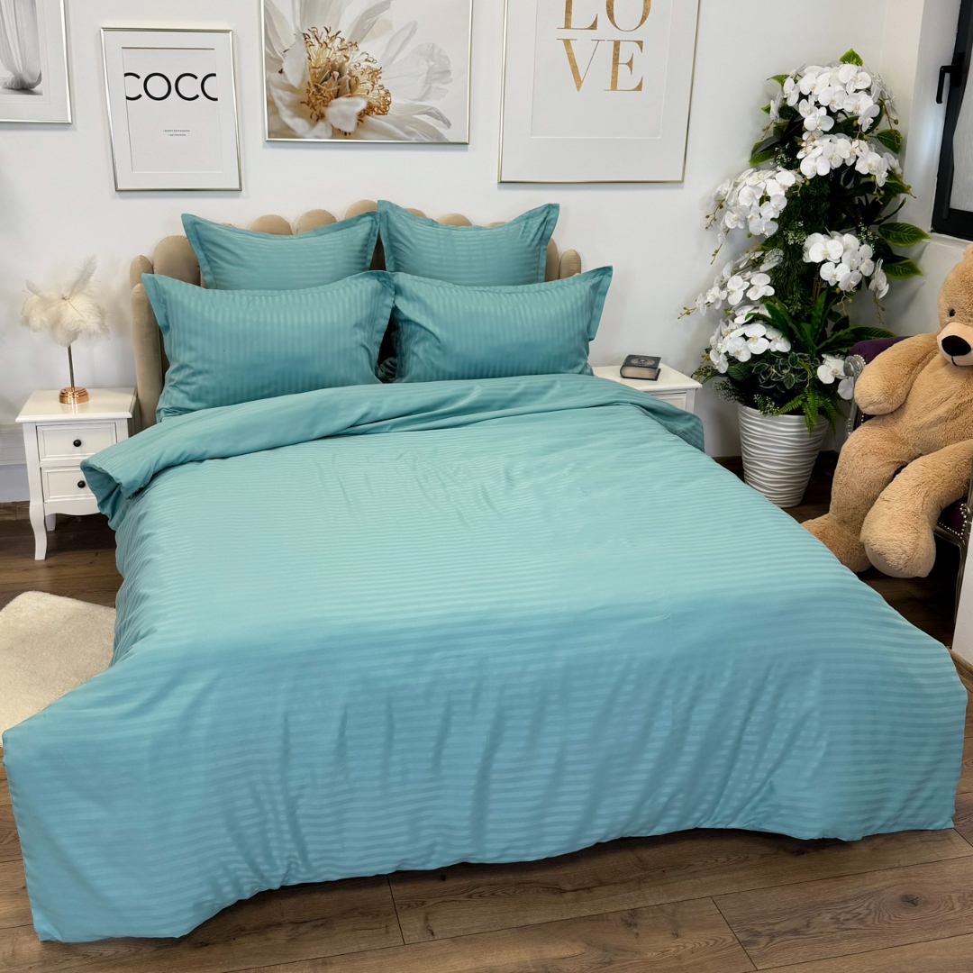 Lenjerie de pat dublu din damasc finetat, linear (tesatura din fabrica, ci nu imprimata, cu dunga de 1 cm grosime), confectionata din bumbac 70% + 30% poliester, cu 6 piese, folosita cel mai mult in regimul hotelier, datorita simplitatii si calitatii extraordinare. Materialul are un aspect usor lucios pentru o nota de eleganta si rafinament, datorita tesaturii speciale. Damascul este recunoscut pentru rezistenta sa in timp la nenumarate spalari, nemodificandu-si aspectul. Damas