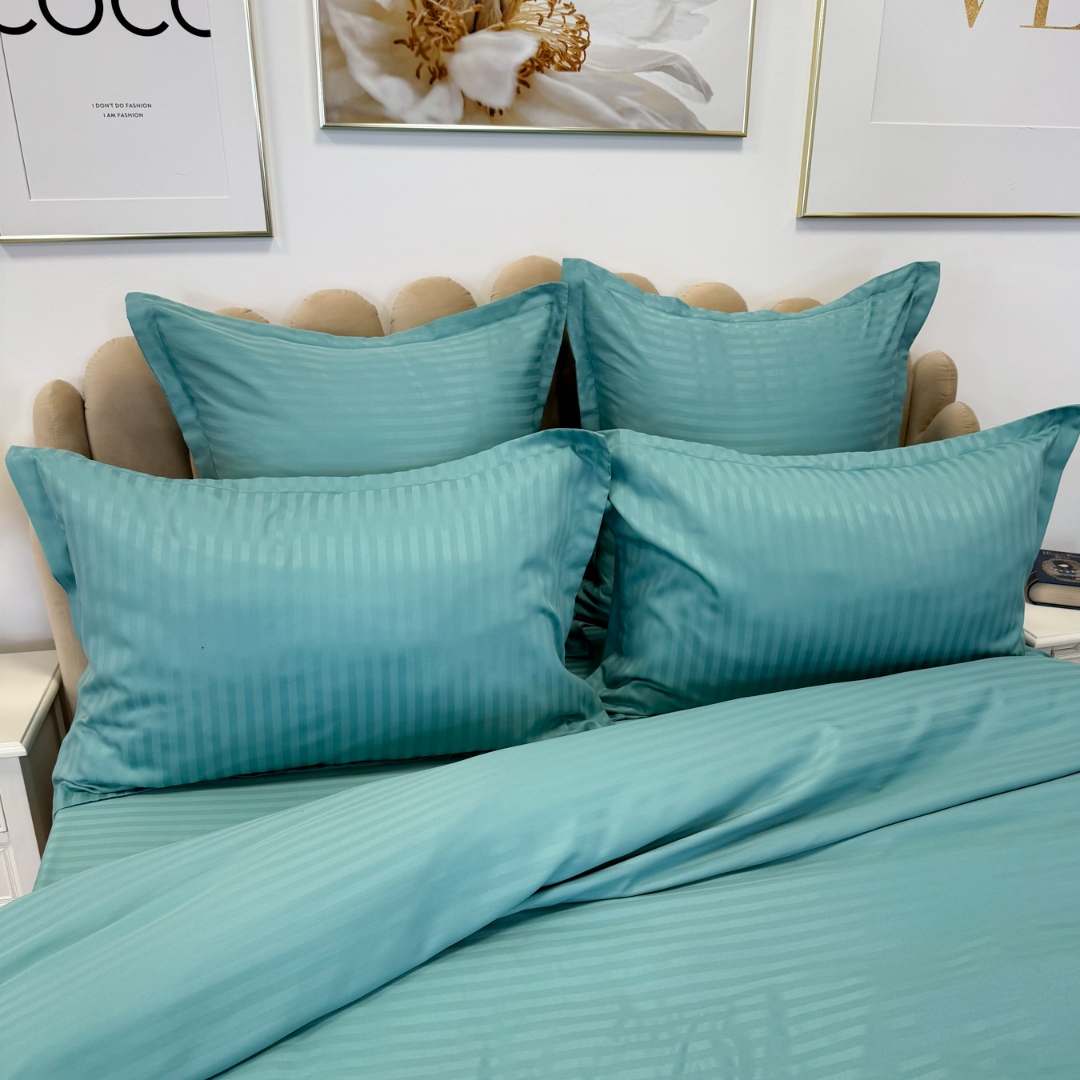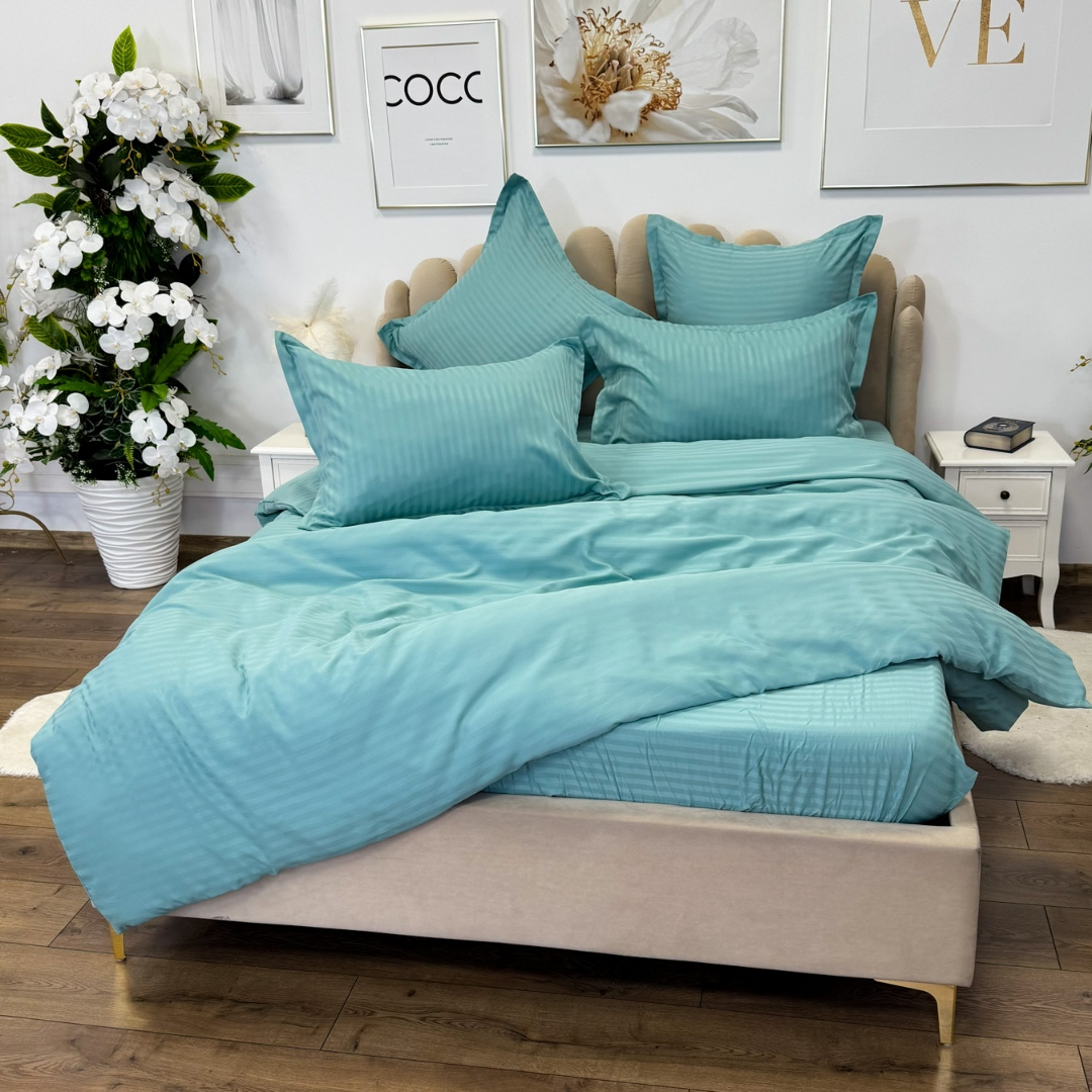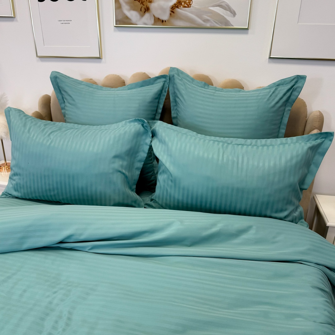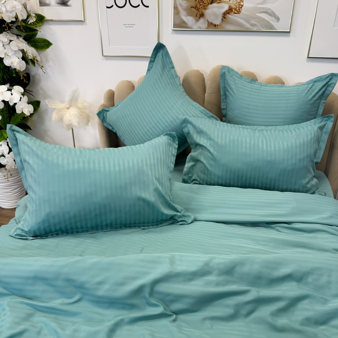 Lenjerie de pat dublu din damasc finetat, linear (tesatura din fabrica, ci nu imprimata, cu dunga de 1 cm grosime), confectionata din bumbac 70% + 30% poliester, cu 6 piese, folosita cel mai mult in regimul hotelier, datorita simplitatii si calitatii extraordinare. Materialul are un aspect usor lucios pentru o nota de eleganta si rafinament, datorita tesaturii speciale. Damascul este recunoscut pentru rezistenta sa in timp la nenumarate spalari, nemodificandu-si aspectul. Damas