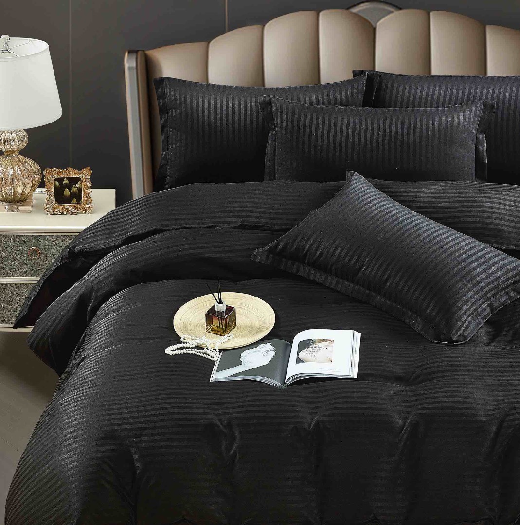 Lenjerie de pat dublu din damasc finetat, linear (tesatura din fabrica, ci nu imprimata, cu dunga de 1 cm grosime), confectionata din bumbac 70% + 30% poliester, cu 6 piese, folosita cel mai mult in regimul hotelier, datorita simplitatii si calitatii extraordinare. Materialul are un aspect usor lucios pentru o nota de eleganta si rafinament, datorita tesaturii speciale. Damascul este recunoscut pentru rezistenta sa in timp la nenumarate spalari, nemodificandu-si aspectul. Damas