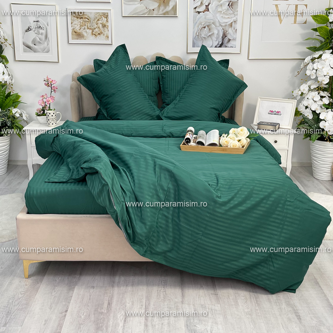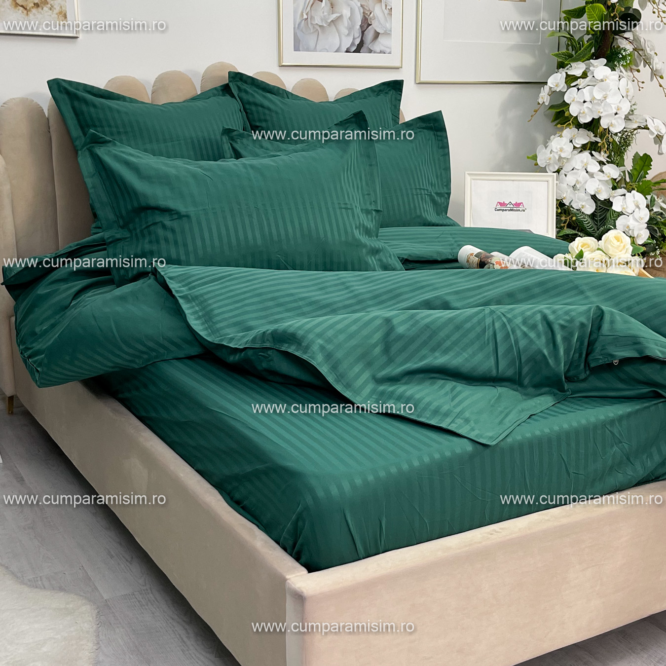 Lenjerie HoReCa, pat dublu, Damasc Finetat Deluxe cu Elastic, 6 piese, Jojo Home, Verde Smarald