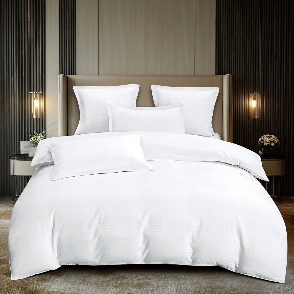 Lenjerie HoReCa, pat dublu, Damasc Finetat Deluxe cu Elastic, 6 piese, Pucioasa, Alb