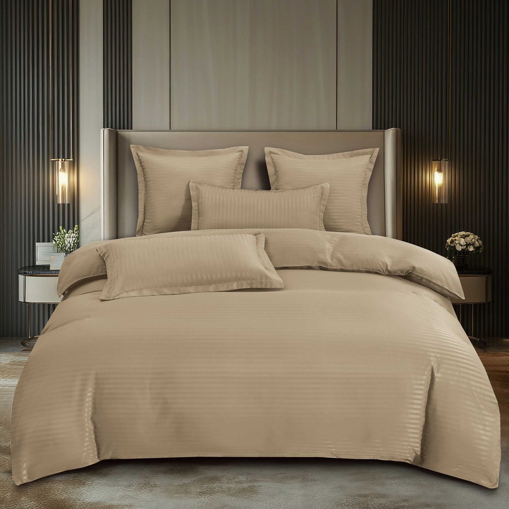Lenjerie HoReCa, pat dublu, Damasc Finetat Deluxe cu Elastic, 6 piese, Pucioasa, Bej