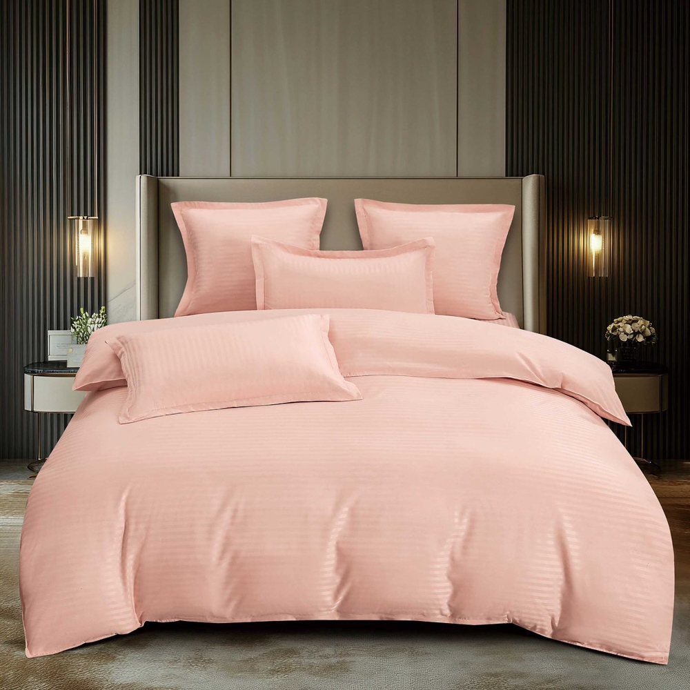 Lenjerie HoReCa, pat dublu, Damasc Finetat Deluxe cu Elastic, 6 piese, Pucioasa, Roz deschis