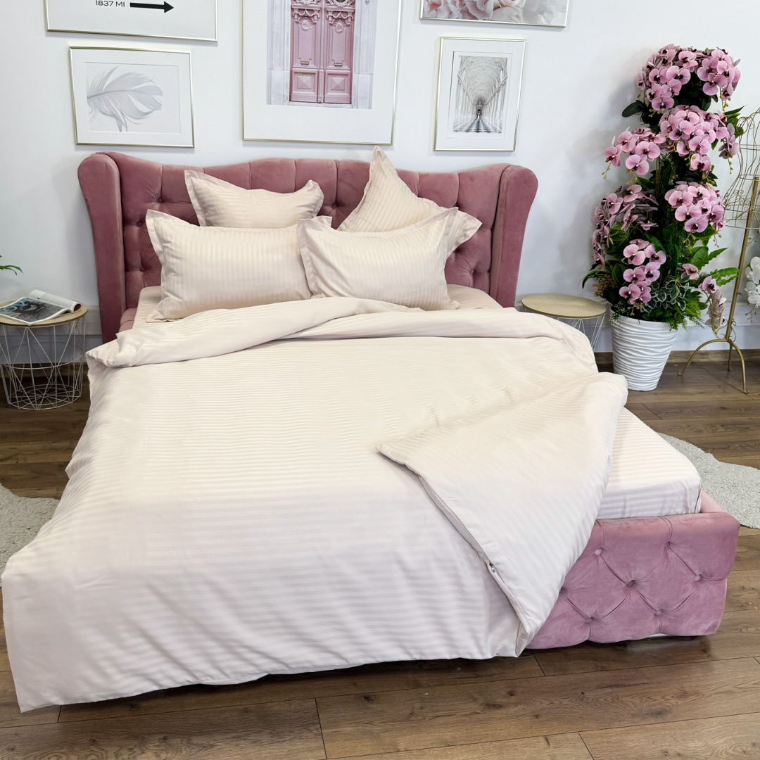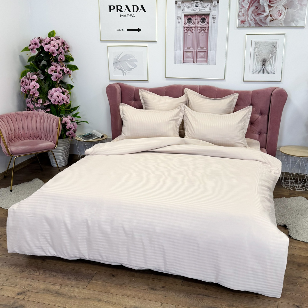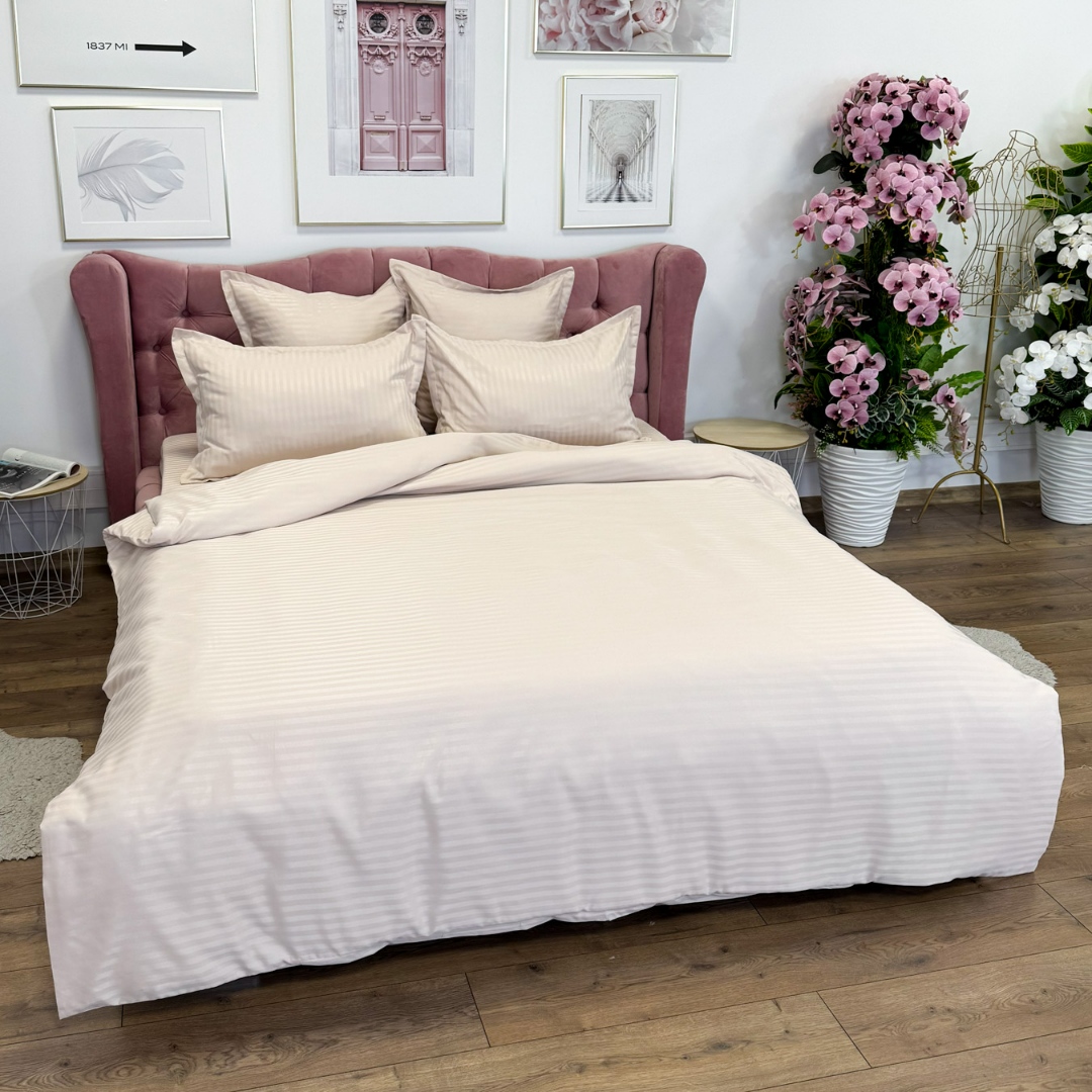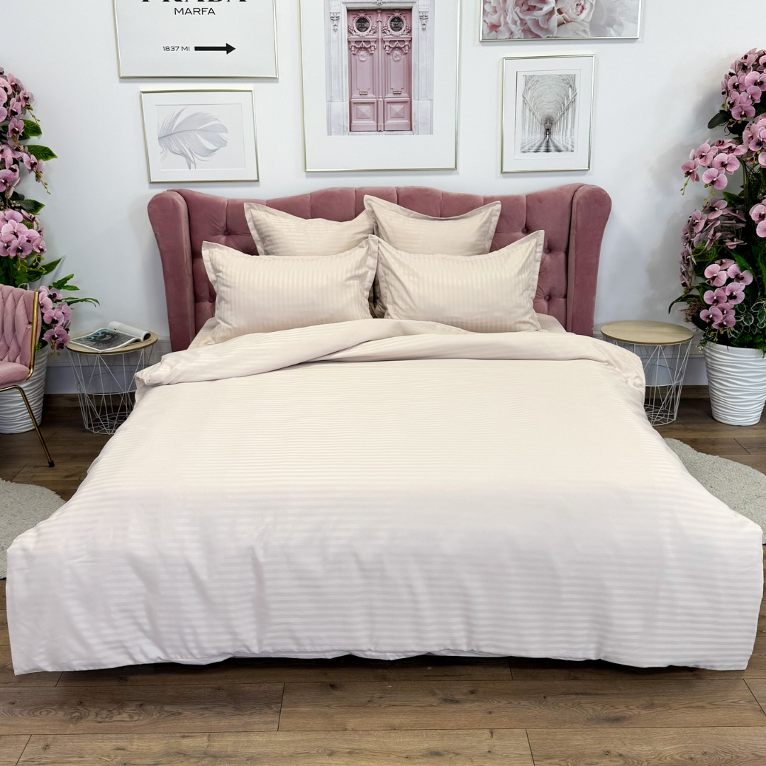 Lenjerie de pat dublu din damasc finetat, linear (tesatura din fabrica, ci nu imprimata, cu dunga de 1 cm grosime), confectionata din bumbac 70% + 30% poliester, cu 6 piese, folosita cel mai mult in regimul hotelier, datorita simplitatii si calitatii extraordinare. Materialul are un aspect usor lucios pentru o nota de eleganta si rafinament, datorita tesaturii speciale. Damascul este recunoscut pentru rezistenta sa in timp la nenumarate spalari, nemodificandu-si aspectul. Damas