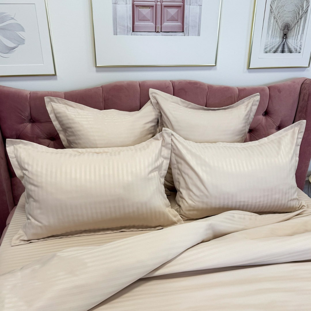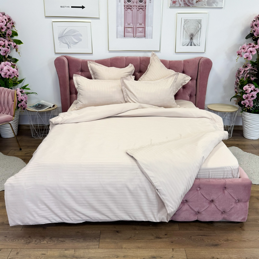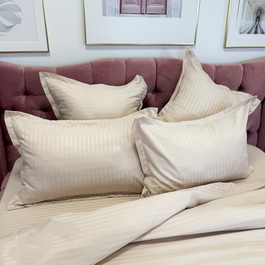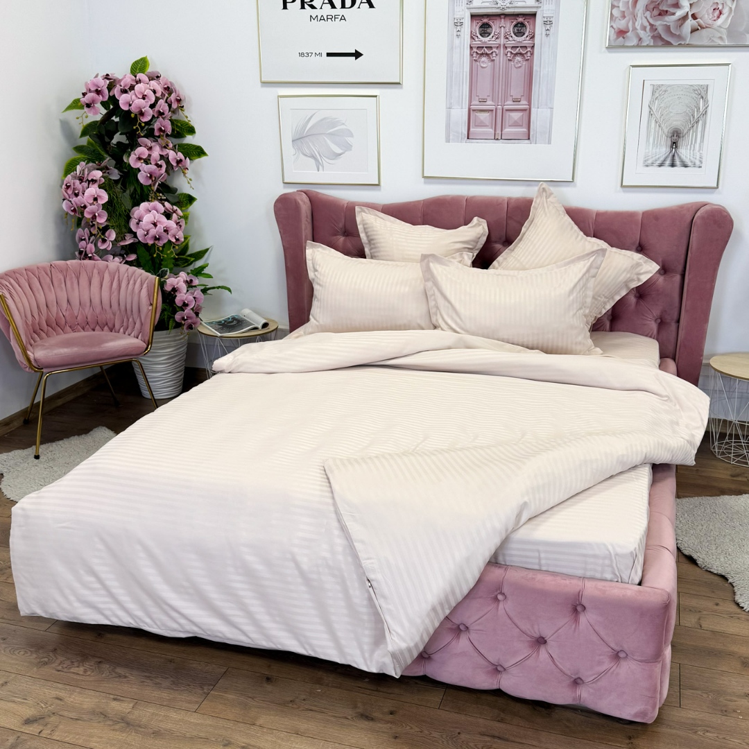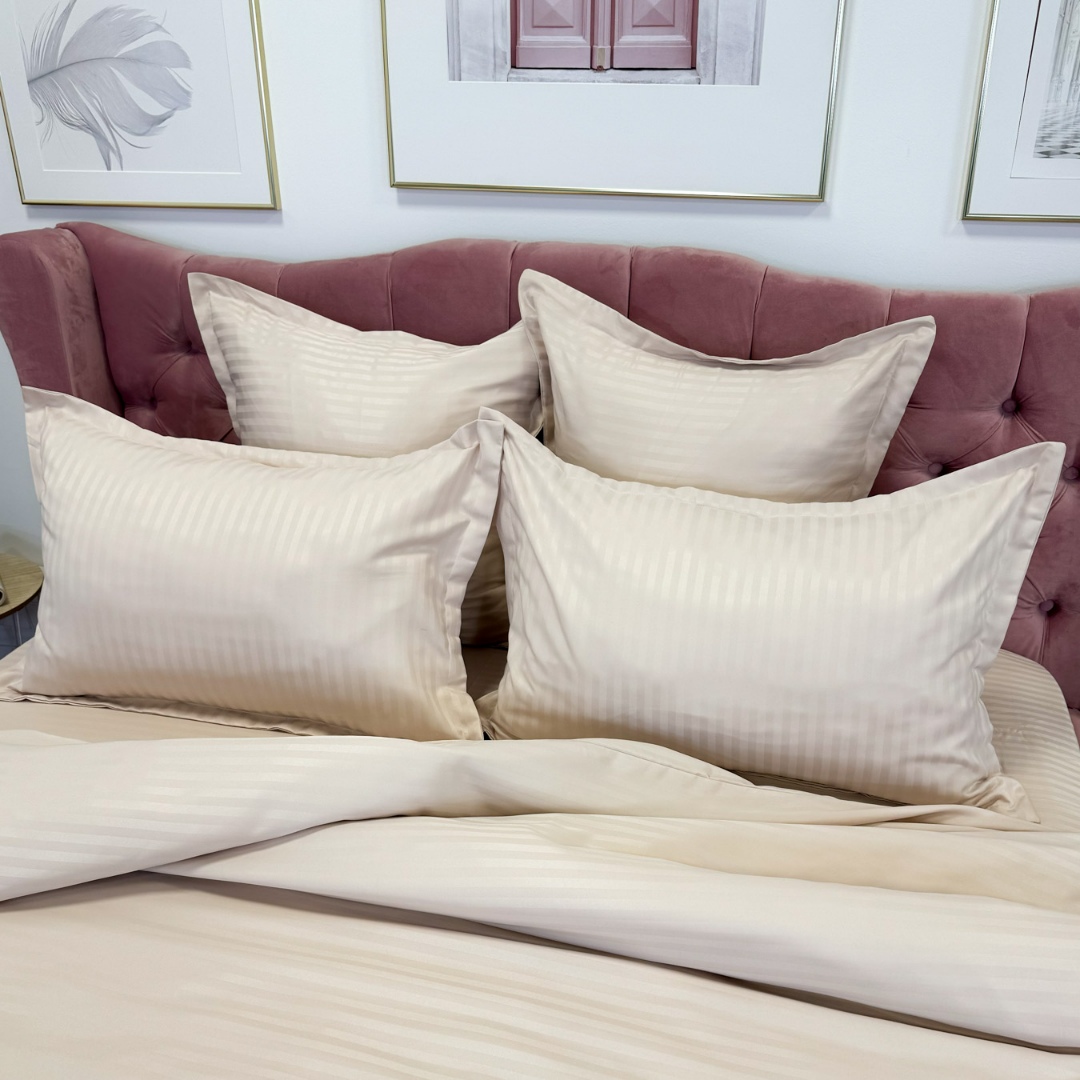 Lenjerie de pat dublu din damasc finetat, linear (tesatura din fabrica, ci nu imprimata, cu dunga de 1 cm grosime), confectionata din bumbac 70% + 30% poliester, cu 6 piese, folosita cel mai mult in regimul hotelier, datorita simplitatii si calitatii extraordinare. Materialul are un aspect usor lucios pentru o nota de eleganta si rafinament, datorita tesaturii speciale. Damascul este recunoscut pentru rezistenta sa in timp la nenumarate spalari, nemodificandu-si aspectul. Damas
