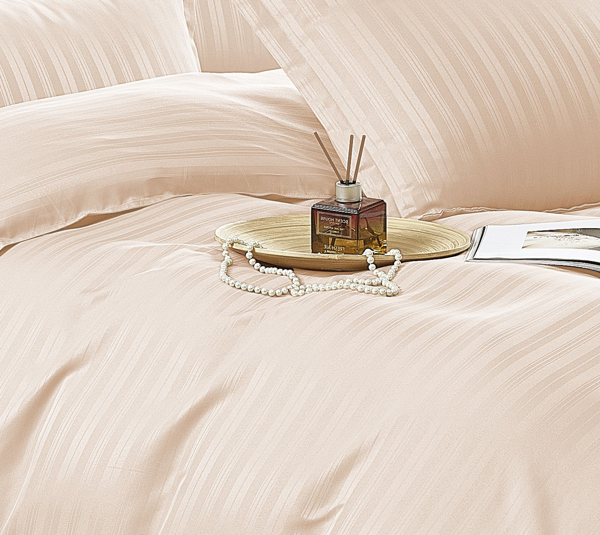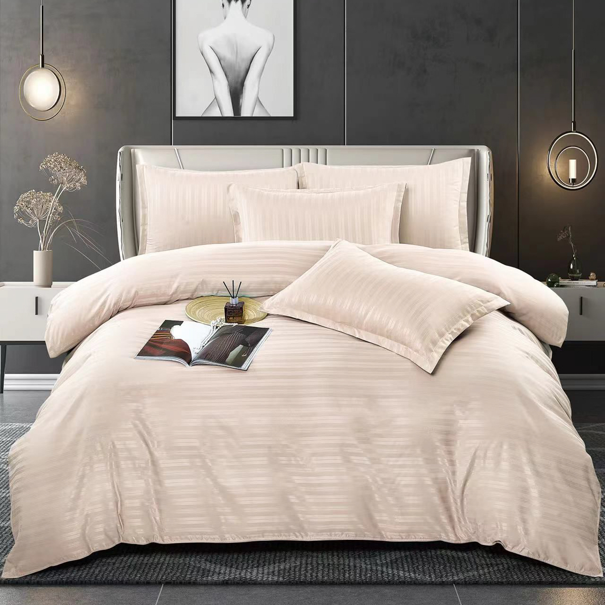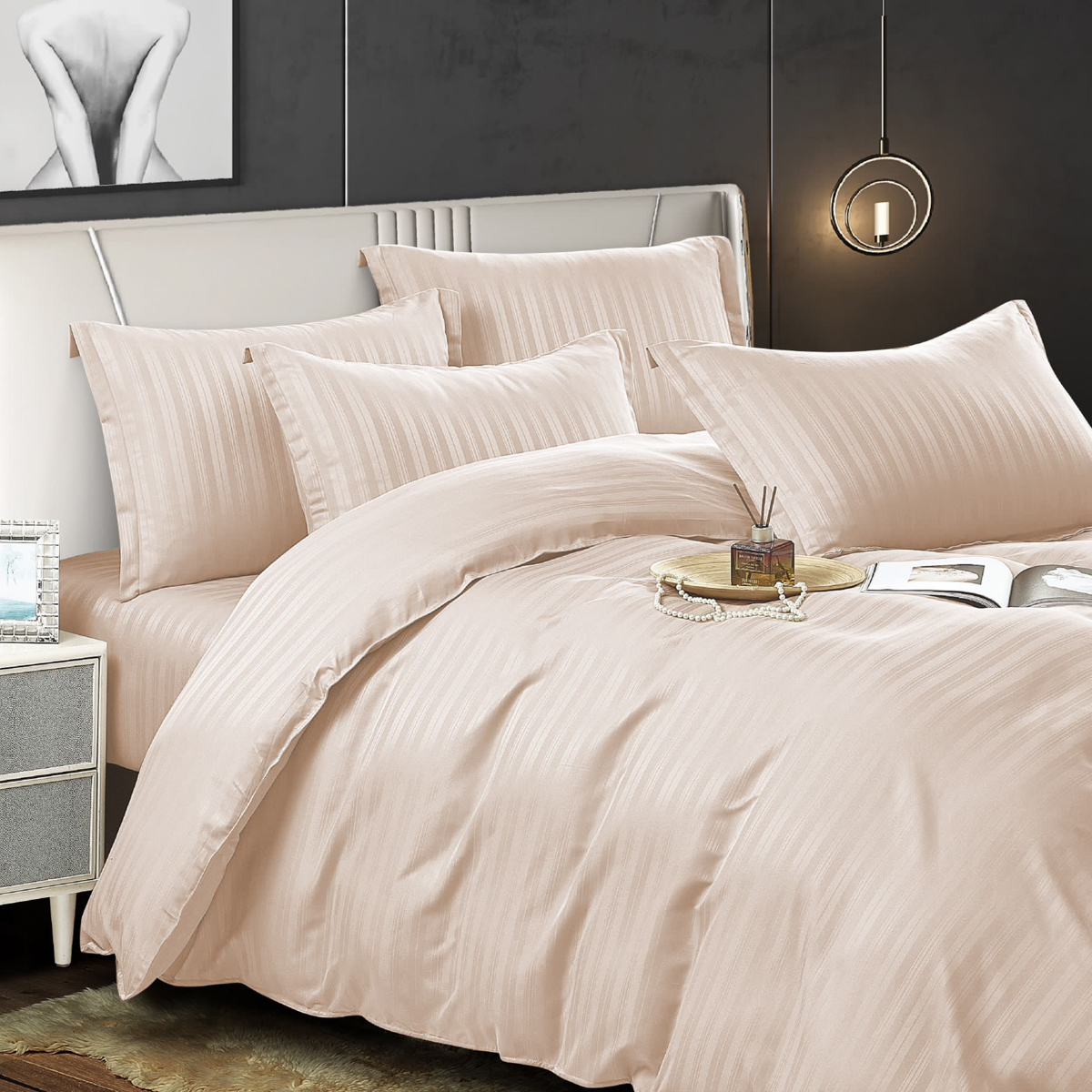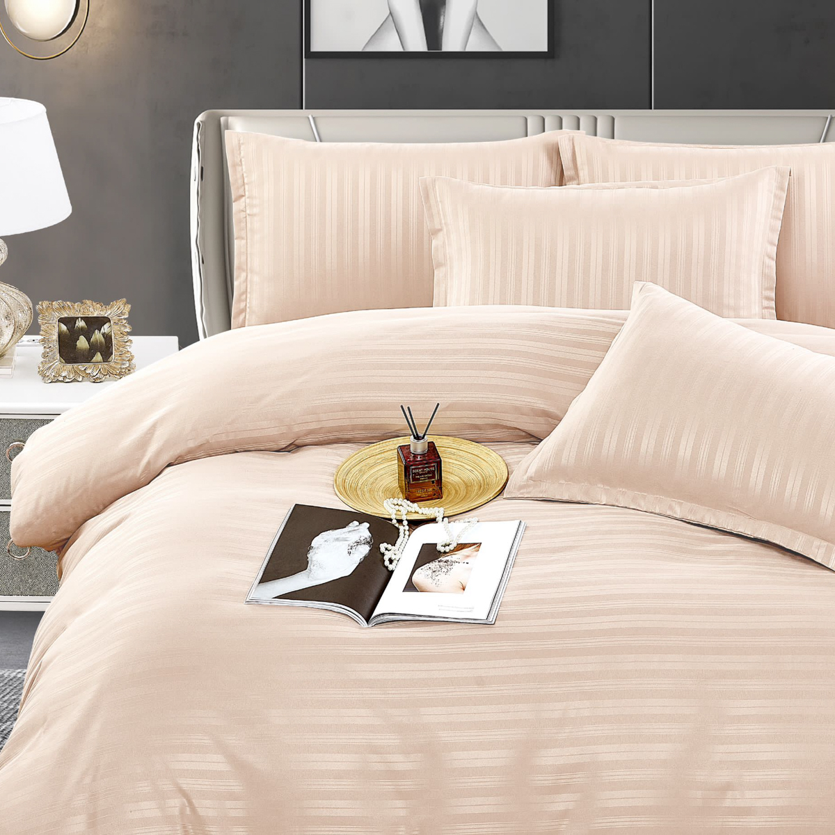 Lenjerie de pat dublu din damasc finetat, linear (tesatura din fabrica, ci nu imprimata, cu dunga de 1 cm grosime), confectionata din bumbac 70% + 30% poliester, cu 6 piese, folosita cel mai mult in regimul hotelier, datorita simplitatii si calitatii extraordinare. Materialul are un aspect usor lucios pentru o nota de eleganta si rafinament, datorita tesaturii speciale. Damascul este recunoscut pentru rezistenta sa in timp la nenumarate spalari, nemodificandu-si aspectul. Damas