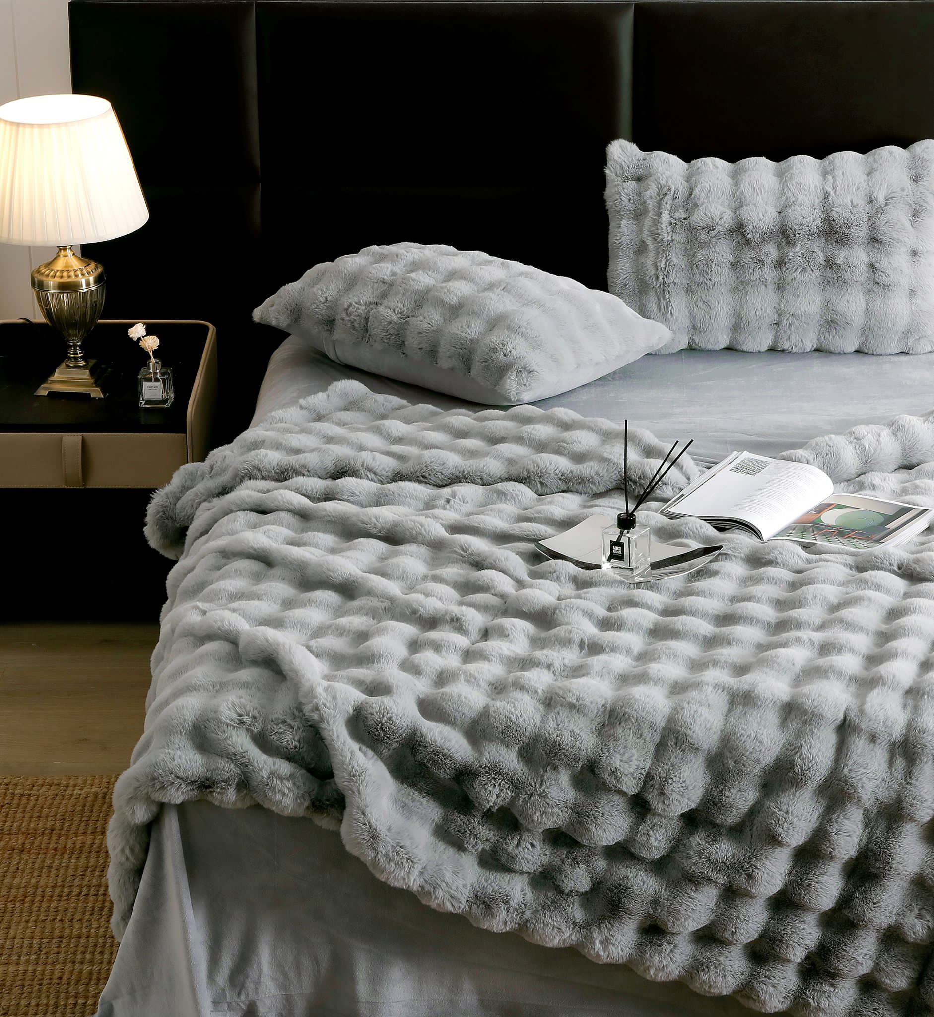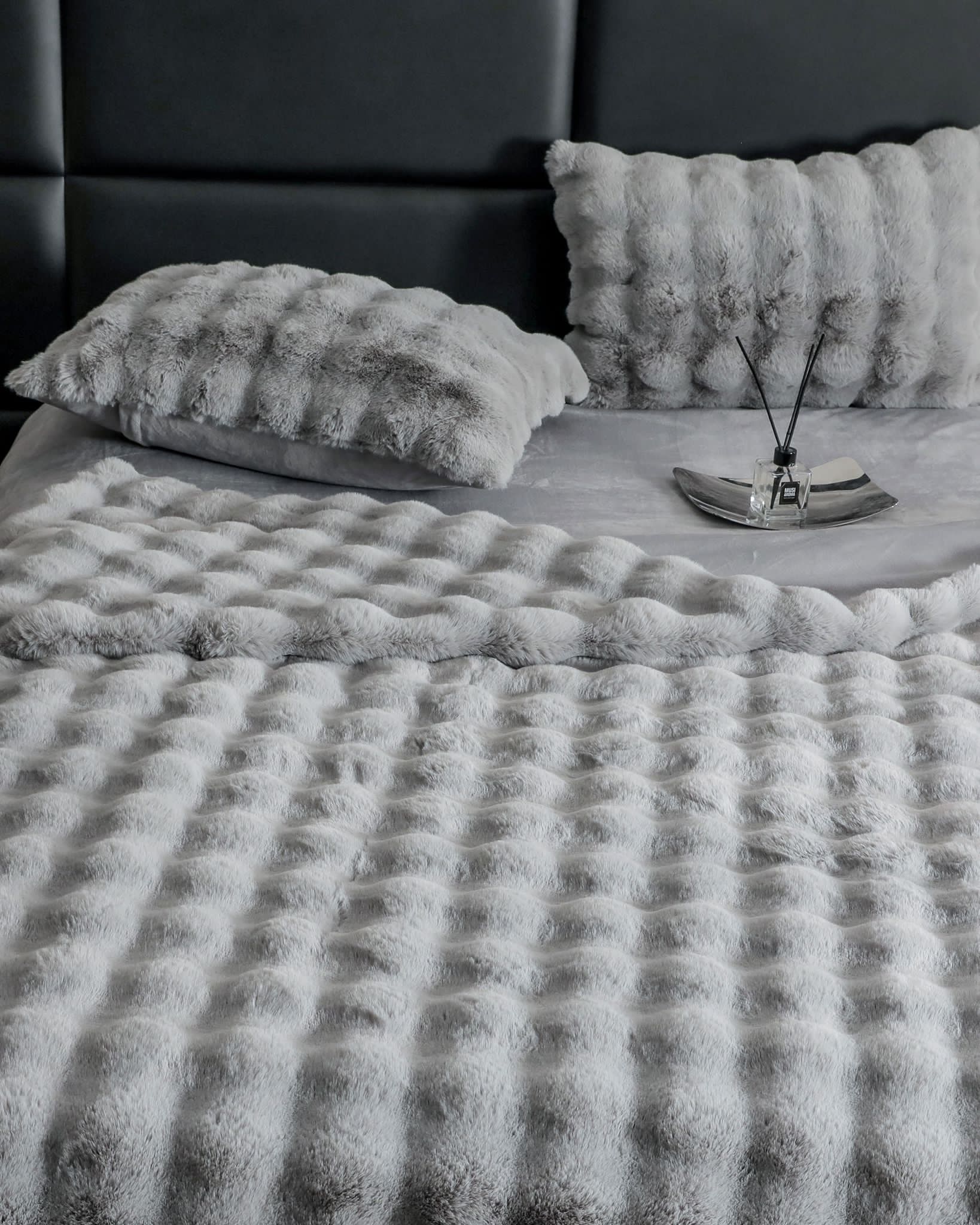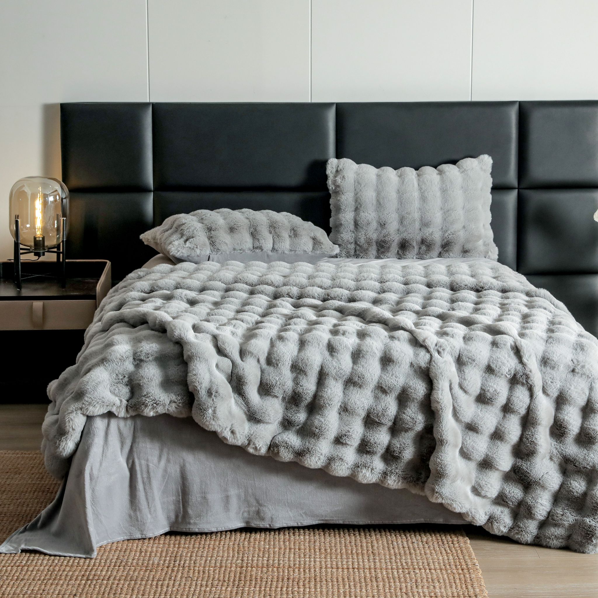 Descoperiti lenjeriile noastre pentru pat dublu, cu 6 piese, confectionate din blanita artificiala de iepure. O adevarata mangaiere pentru simturi, aceste lenjerii combina eleganta cu confortul absolut. Cu un design pufos si gros, ele promit caldura si protectie in cele mai reci nopti. Lasa-te invaluit de moliciunea si rafinamentul lor, si transforma-ti somnul intr-o experienta de lux! Aceste lenjerii nu sunt doar o declaratie de stil, ci si promisiunea unui somn adanc si linistit
