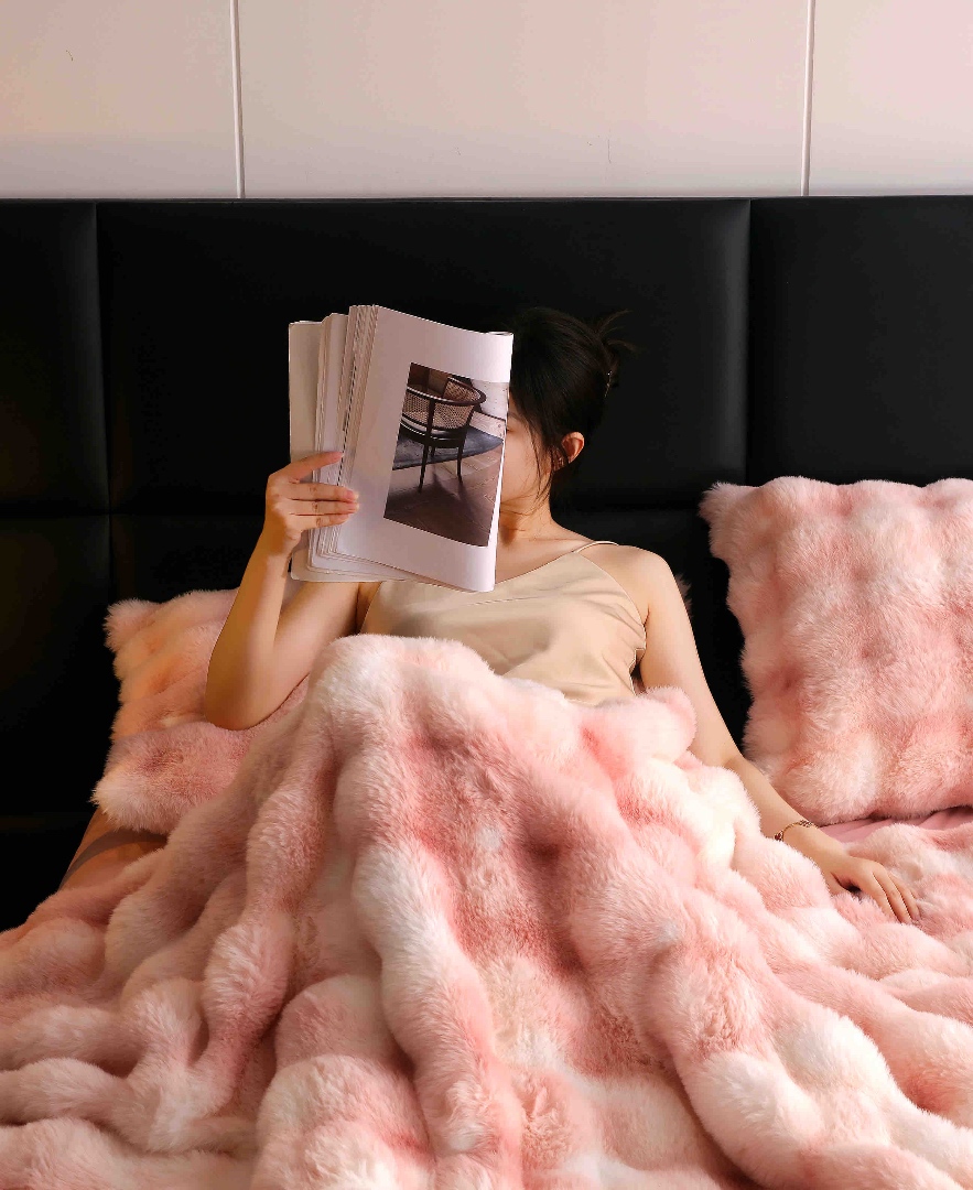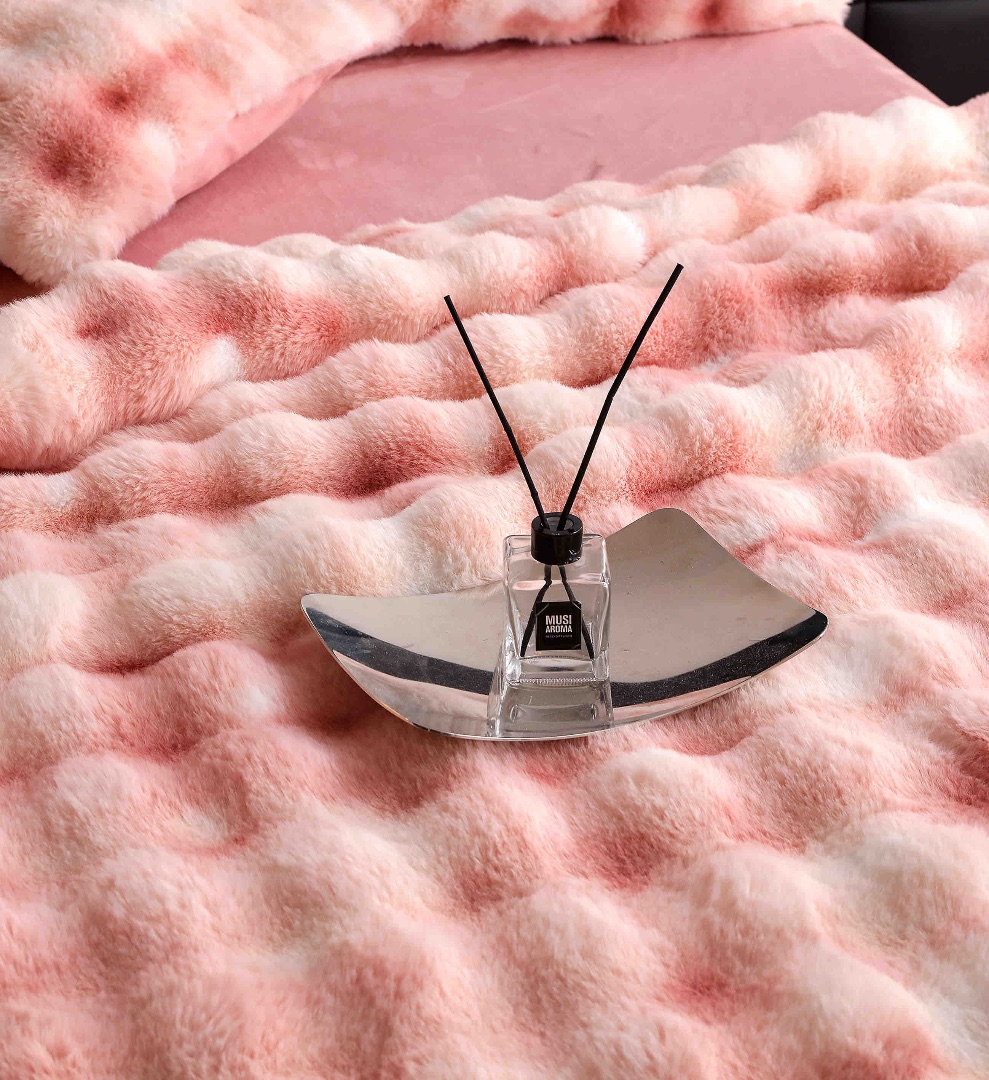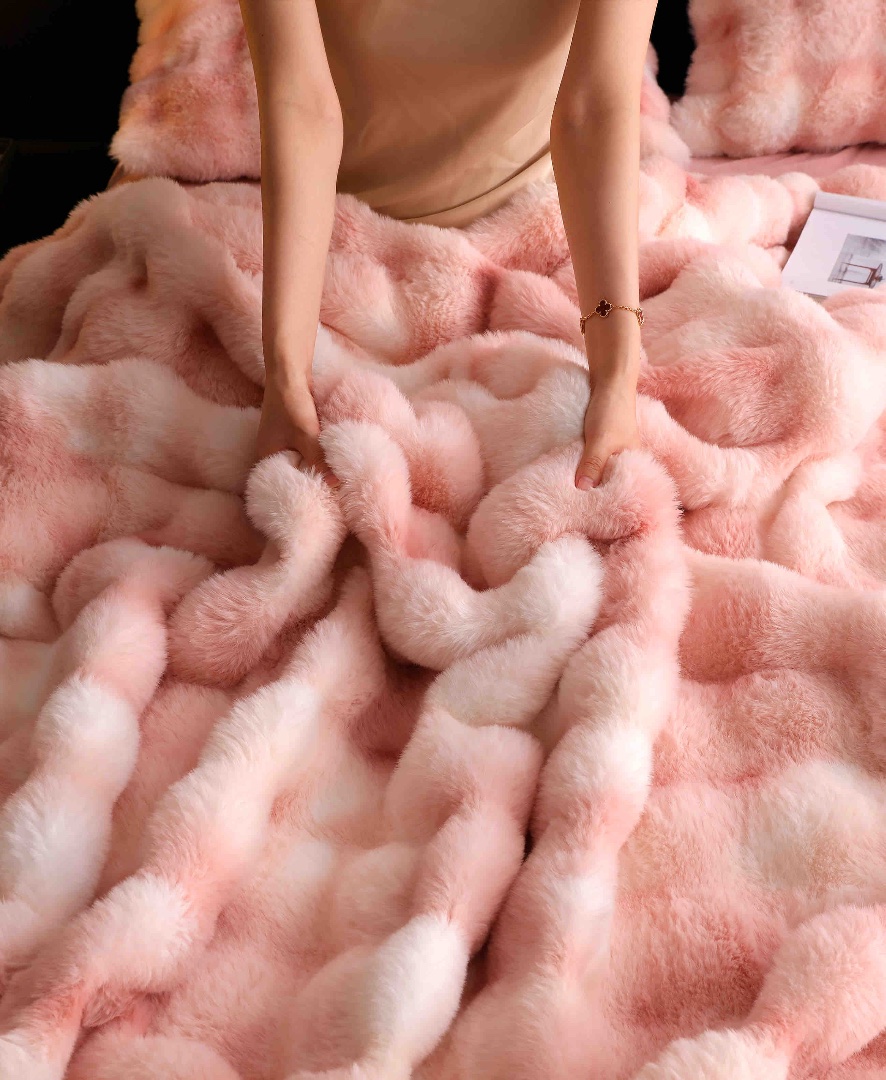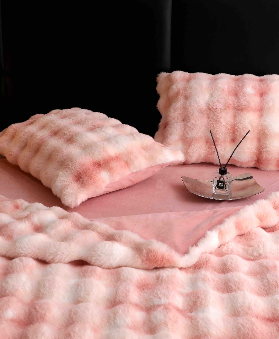 Lenjerie Luxury Pat Dublu, Jojo Home, ExtraPufoasa, din Blanita Artificiala tip Iepure, 6 piese, Roz degrade