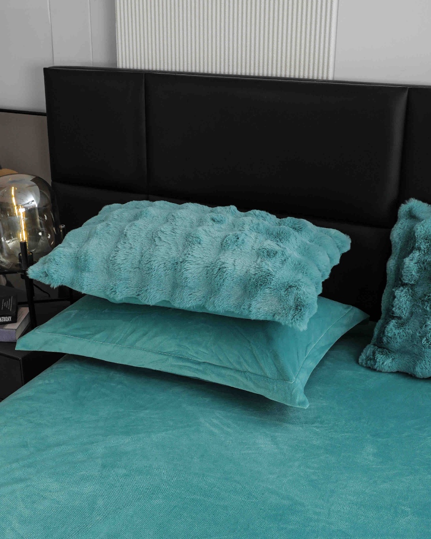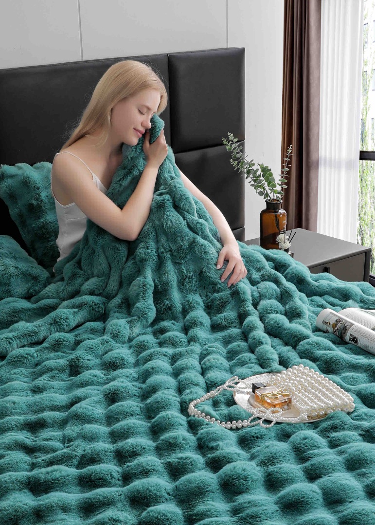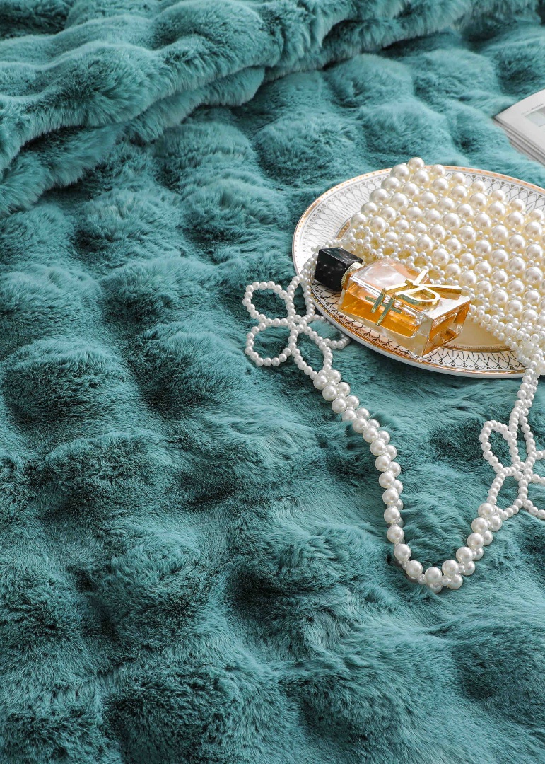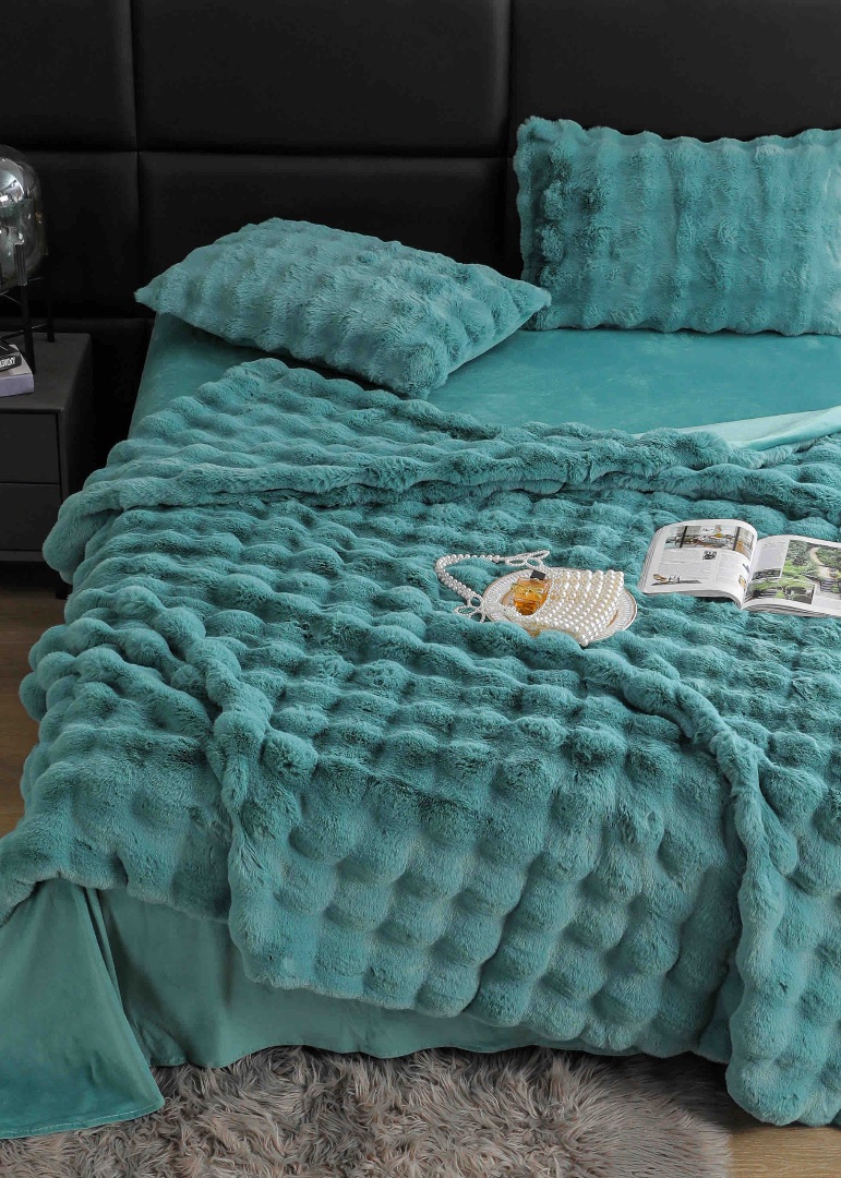 Lenjerie Luxury Pat Dublu, Jojo Home, ExtraPufoasa, din Blanita Artificiala tip Iepure, 6 piese, Turquoise