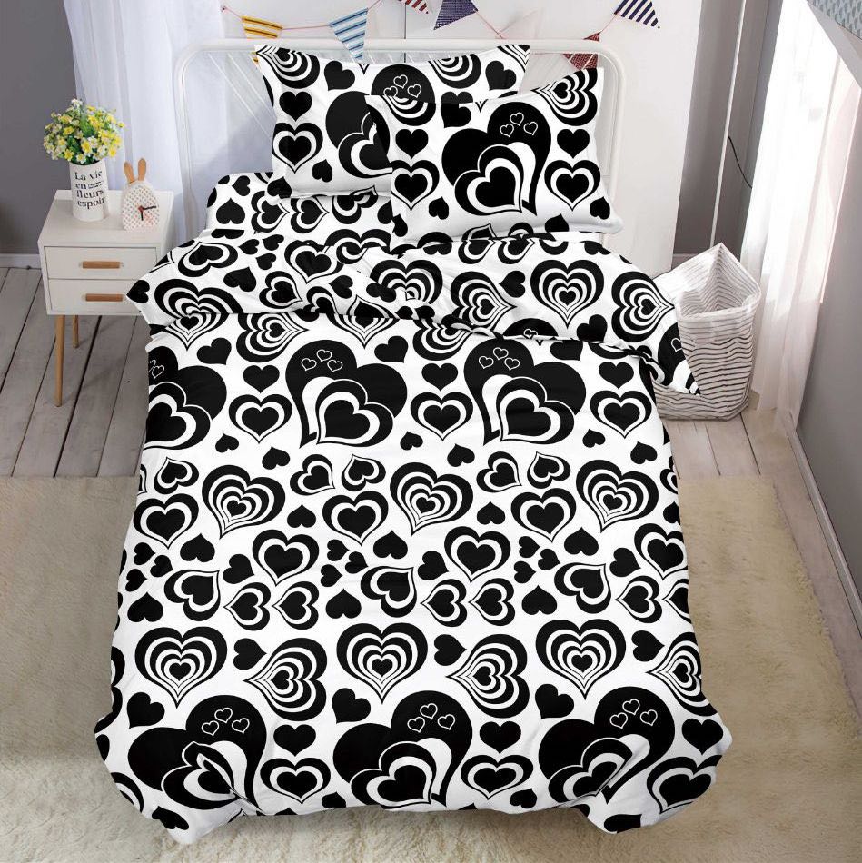 (OFERTA 3 la 199 Lei) Lenjerie pat 1 PERSOANA, 3 piese, IMPRIMEU 3D Multiplicat, Microfibra, Alb-Negru, inimioare
