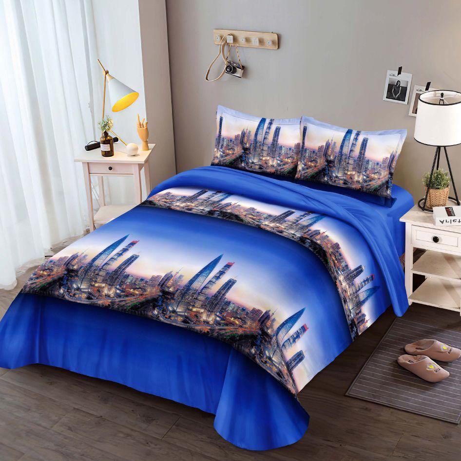 (OFERTA 3 la 199 Lei) Lenjerie pat 1 PERSOANA, 3 piese, IMPRIMEU 3D Multiplicat, Microfibra, Albastru, oras