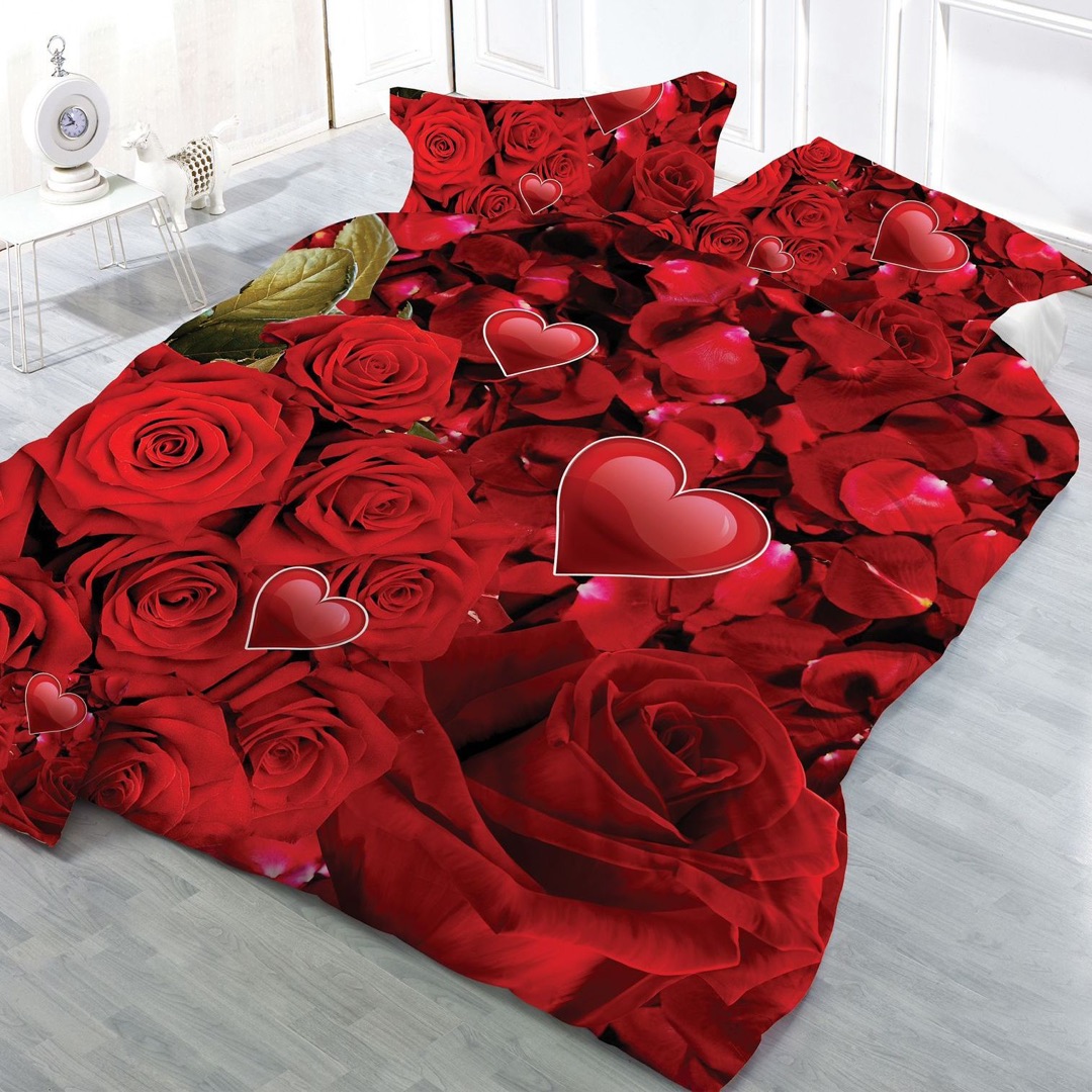 (OFERTA 3 la 199 Lei) Lenjerie pat 1 PERSOANA, 3 piese, IMPRIMEU 3D Multiplicat, Microfibra, Rosu, trandafiri