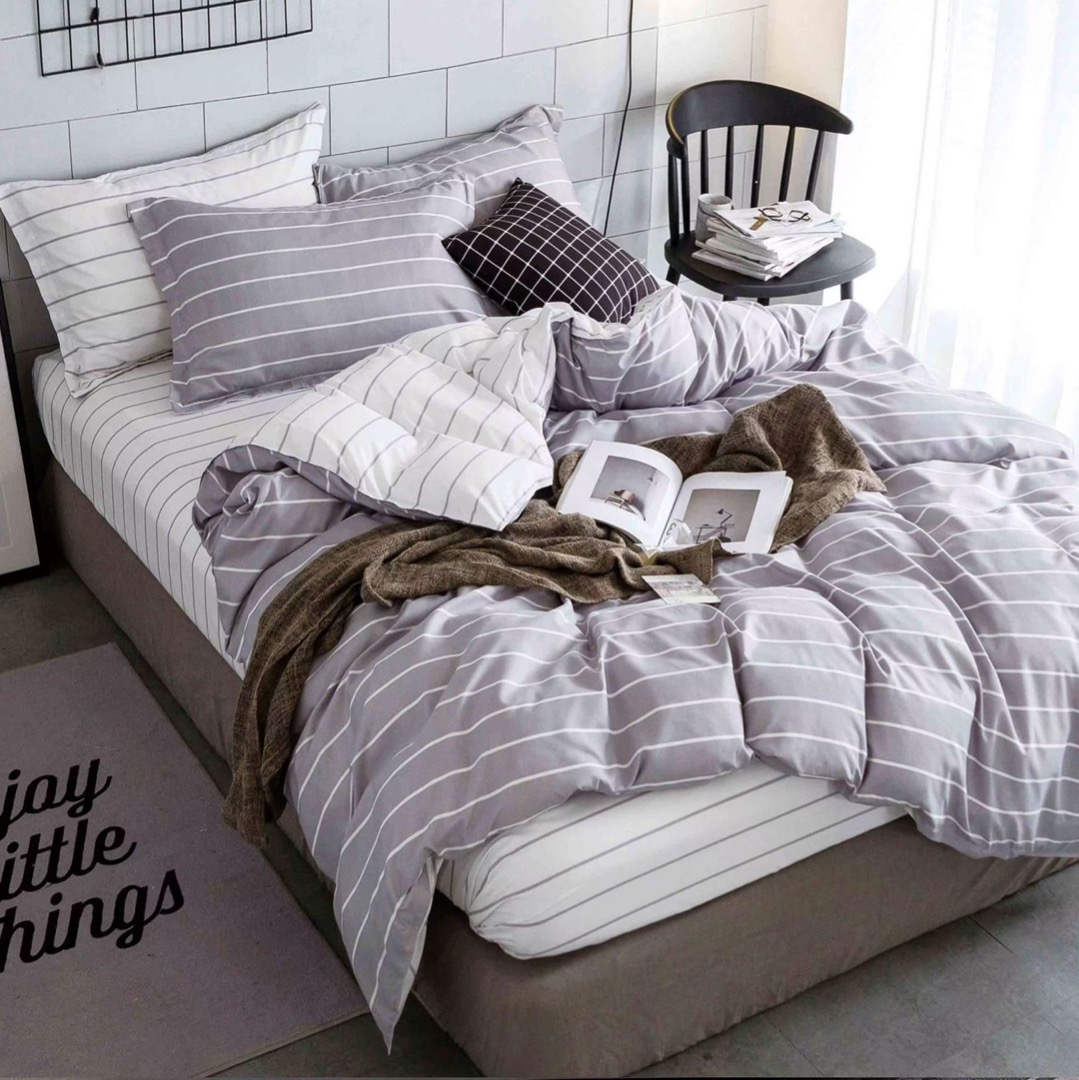 Lenjerie pat 1 PERSOANA, 4 piese, cu ELASTIC, Gri, dungi