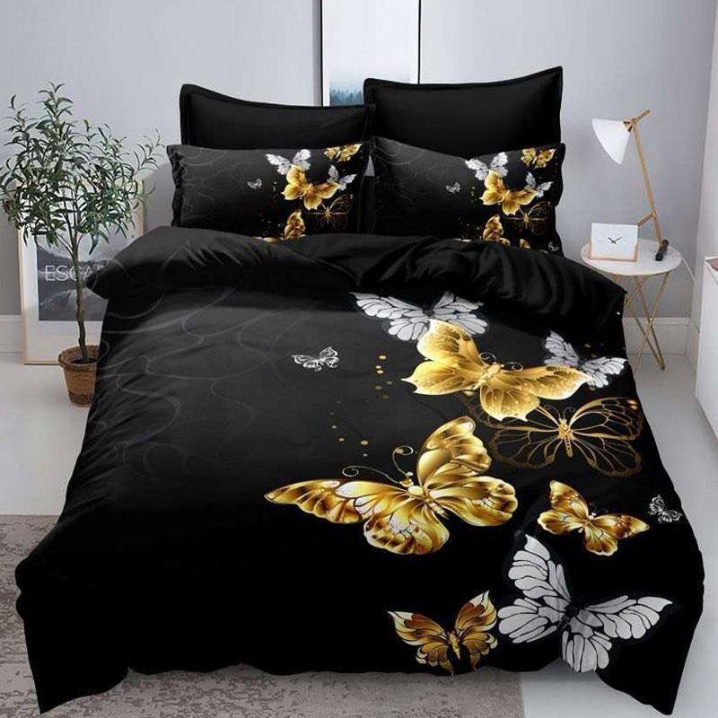 Lenjerie pat 1 PERSOANA (90x200cm, 100x200cm, 120x200cm), BUMBAC FINET, 4 piese, Identica cu Poza, Imprimeu Digital, Negru, Fluturi