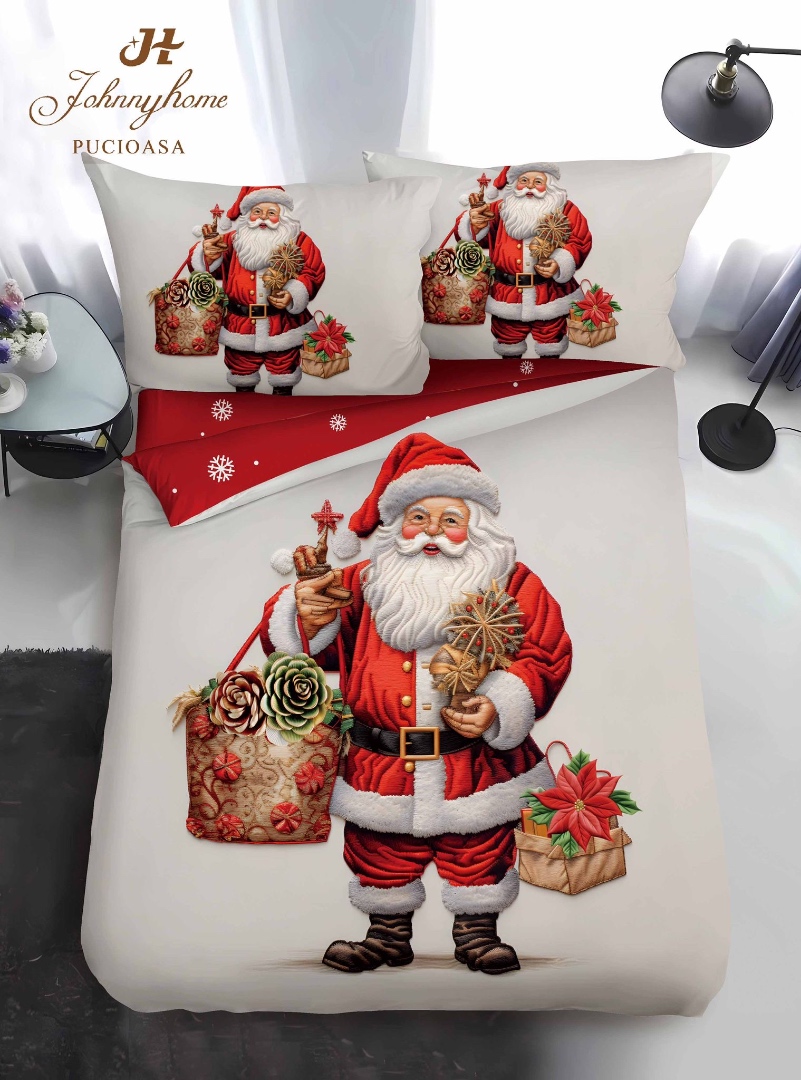 Lenjerie pat 1 PERSOANA, BUMBAC FINET, 4 piese, Identica cu Poza, Craciun, Gri, Rosu, Mos Craciun