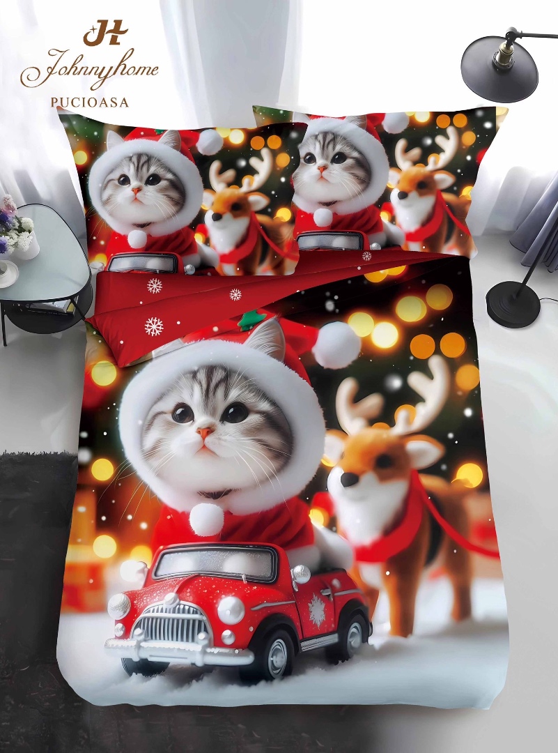 Lenjerie pat 1 PERSOANA, BUMBAC FINET, 4 piese, Identica cu Poza, Craciun, Rosu, Multicolor, pisicuta, masinuta, ren