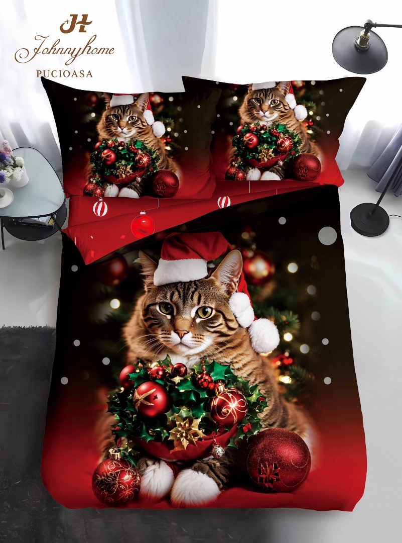 Lenjerie pat 1 PERSOANA, BUMBAC FINET, 4 piese, Identica cu Poza, Craciun, Rosu, Negru, pisicuta